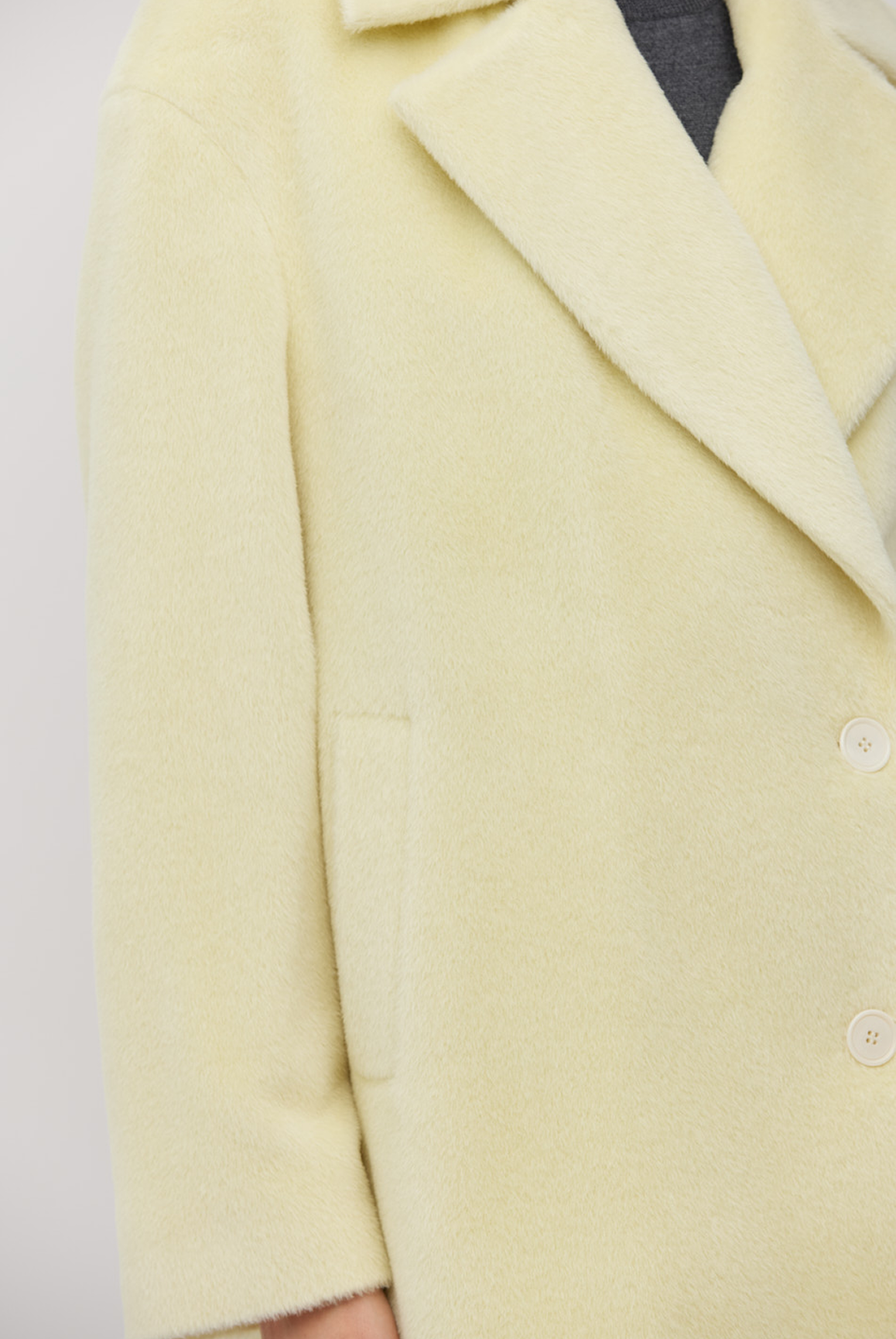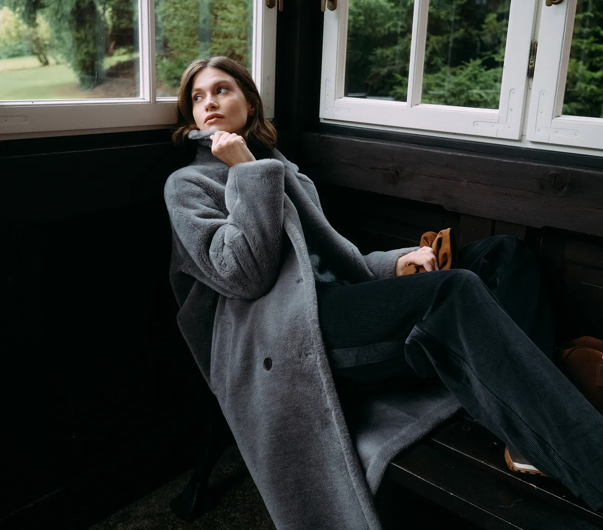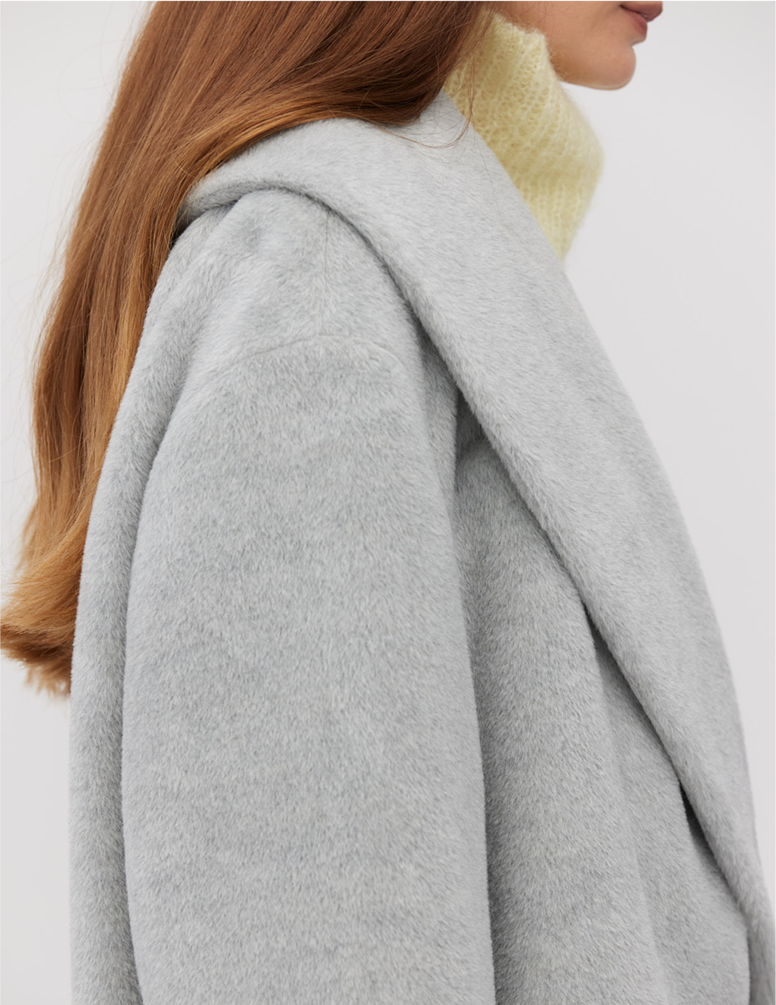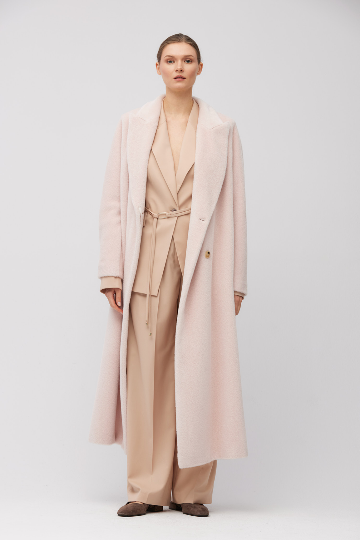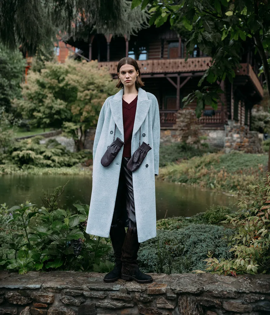 V této sezóně poprvé představujeme látku, která kombinuje 70 % mladé alpaky Suri a 30 % panenské jehněčí vlny. Tato dvě vzácná vlákna, sklizená v nejměkčím stavu, vytvářejí látku s dokonalým omakem, hedvábným leskem a výjimečně lehkým pocitem. Díky inovativní povrchové úpravě jsme vytvořili kabáty Suri v jasných, zářivých odstínech – od pudrově růžové přes bělenou béžovou až po jemně šedou.