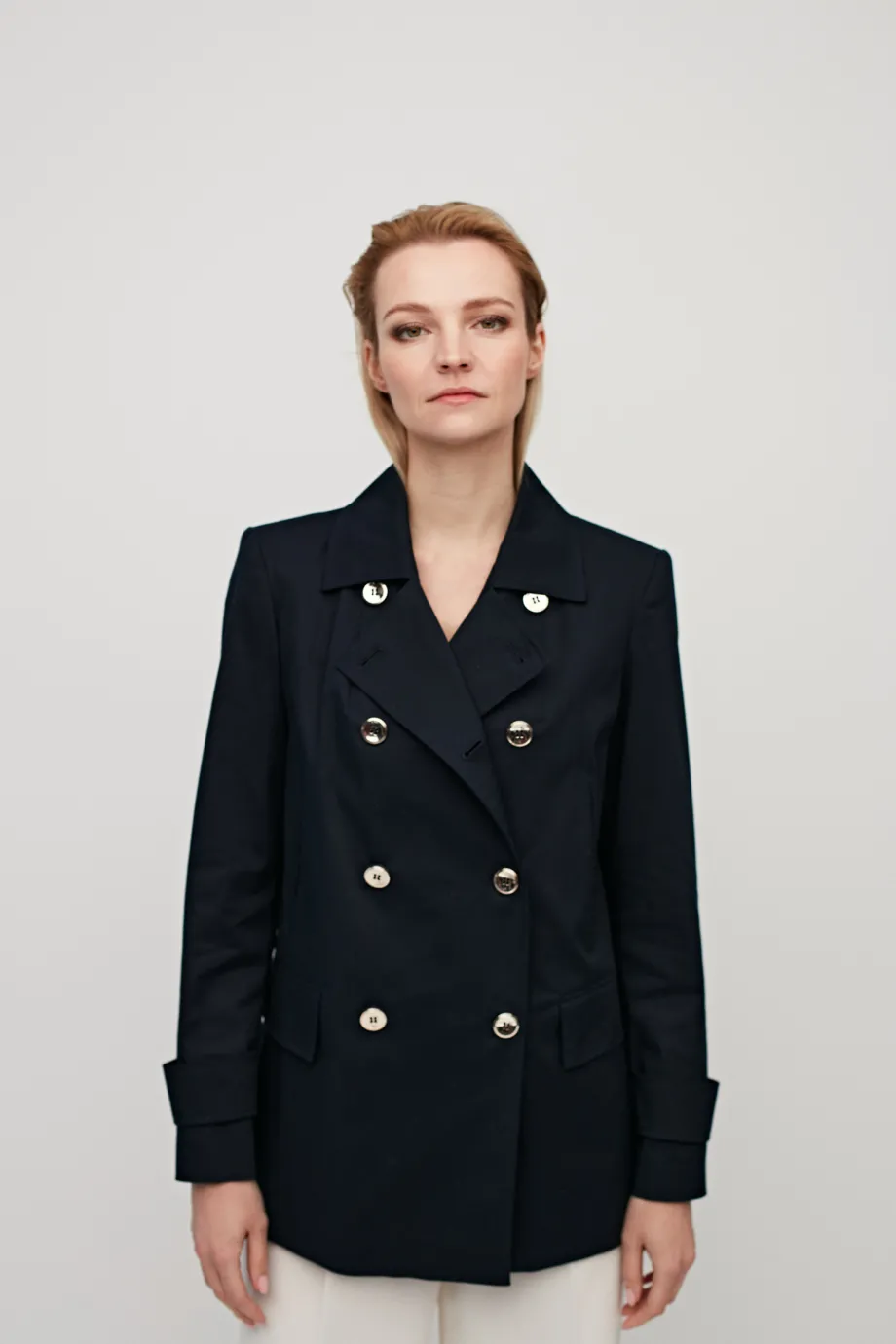 Dámská dvouřadá bunda se skvěle hodí jak do elegantních, formálních, tak každodenních outfitů. Každý detail naší bundy byl navržen a vyroben s ohledem na nejvyšší kvalitu. Tuto námořnickou bundu odlišují nárameníky na rukávech, dvouřadé zapínání a kapsy, díky čemuž si můžete užít nejen dokonalý vzhled, ale i výjimečnost, která vás bude provázet při nošení tohoto modelu. Dopřejte si špetku luxusu a zdůrazněte svůj styl produkty od Patrizia Aryton.