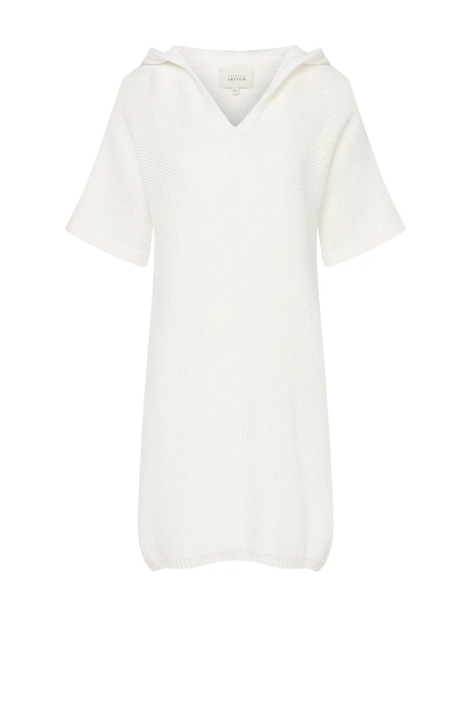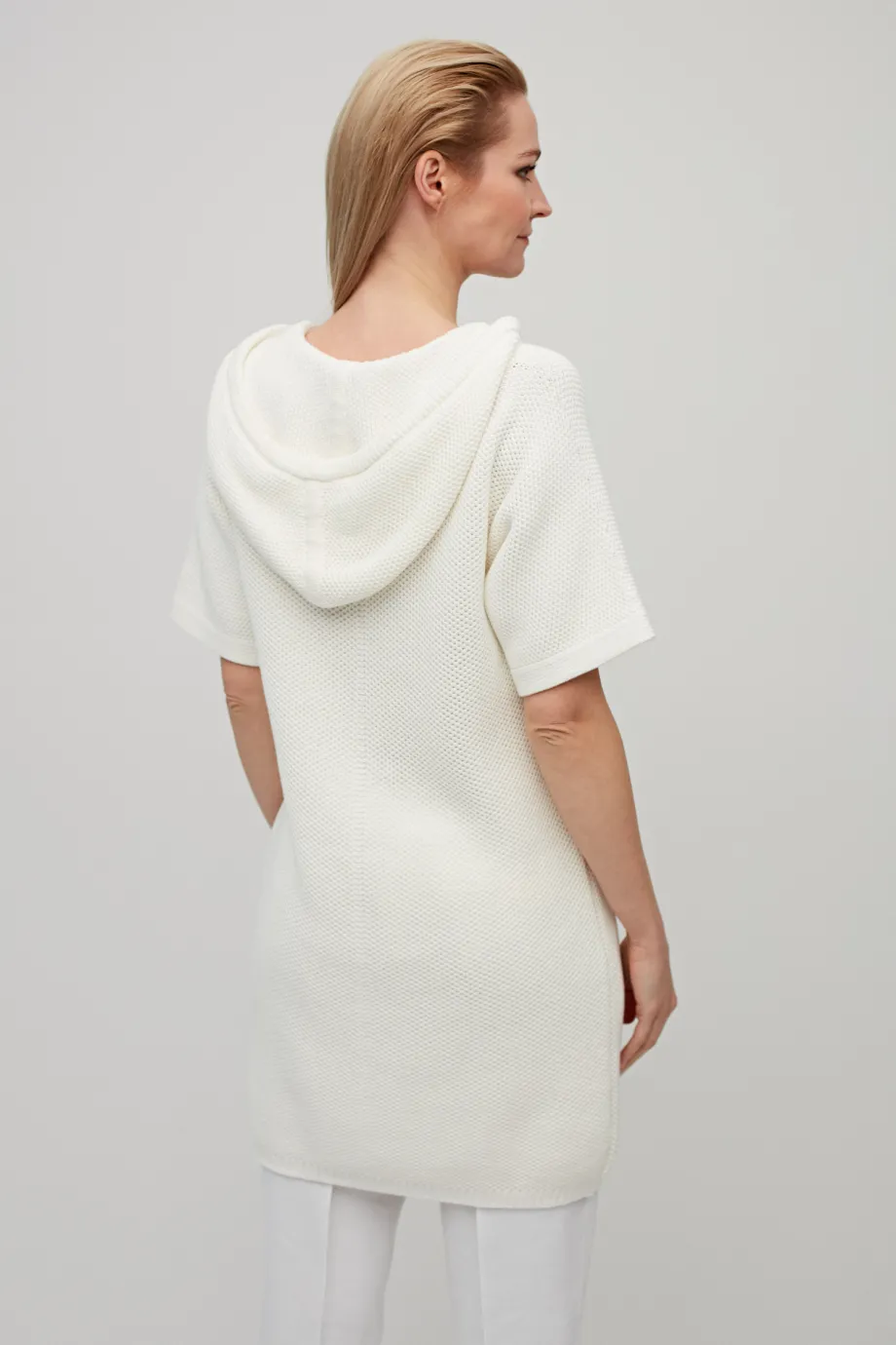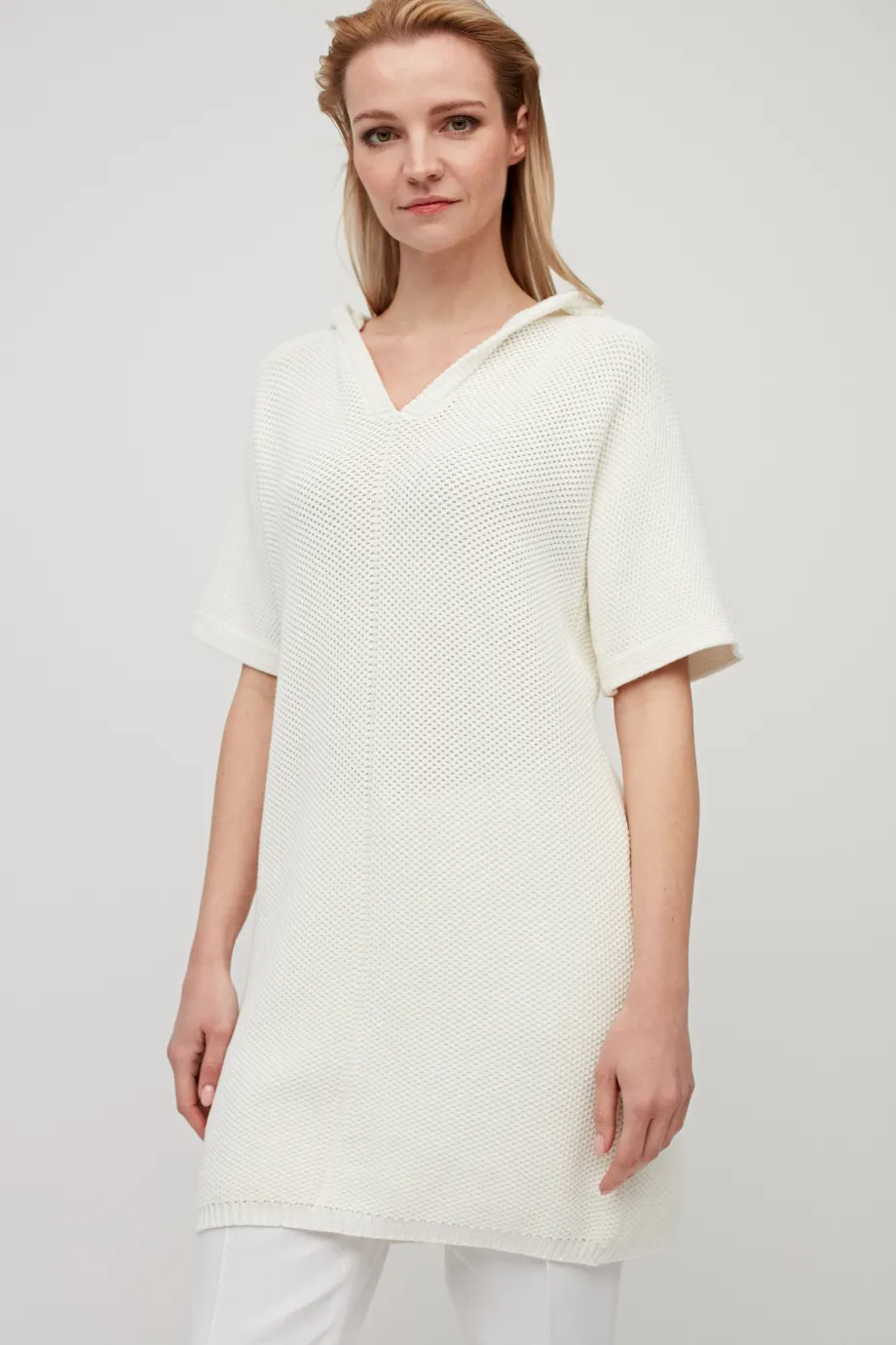 Ažurová tunika s kapucí dokonale ladí se světlými kalhotami. Dobře padne na tělo a vytváří soudržný celek s ostatními doplňky.
