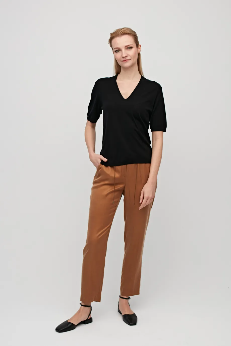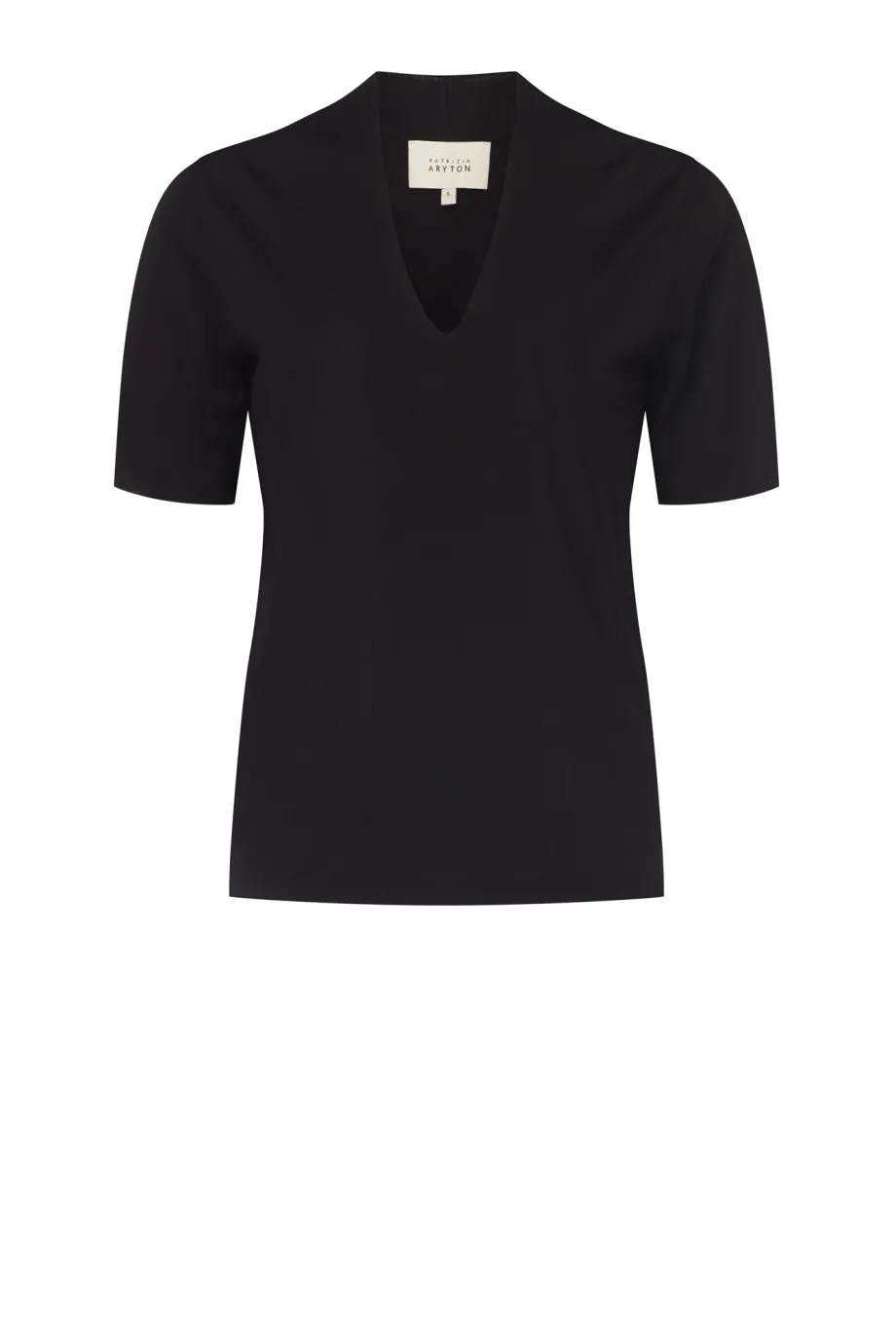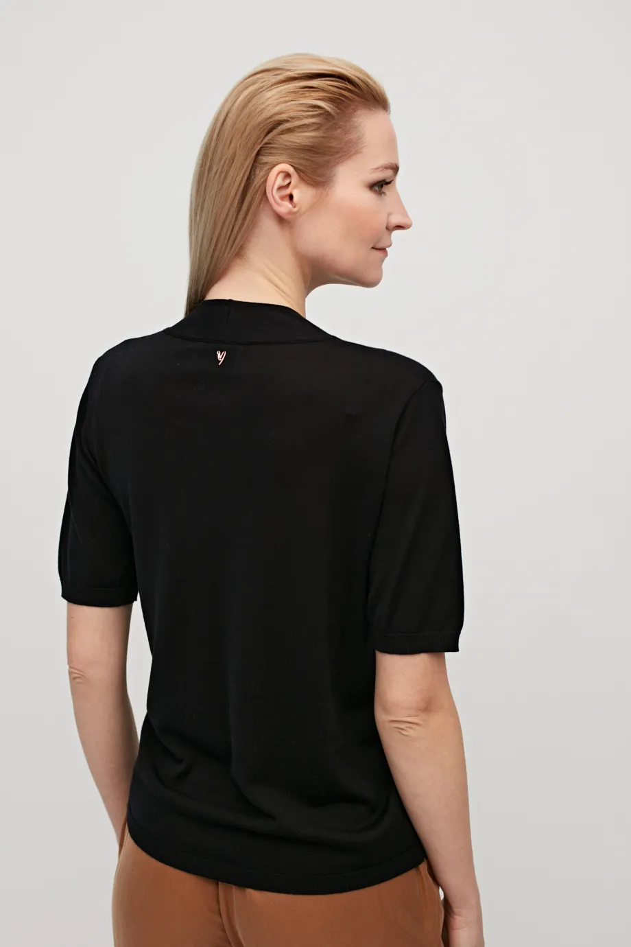 Černá blůza s krátkým rukávem je jedním z povinných prvků ženského kapslového šatníku. Model od Patrizia Aryton je perfektním smart casualovým základem na přechodné období a dokonce i na zimu. To vše díky univerzálnímu střihu a vynikajícímu složení materiálu, který zajišťuje exkluzivní vzhled, bezkonkurenční pohodlí a trvanlivost oblečení na mnoho let.