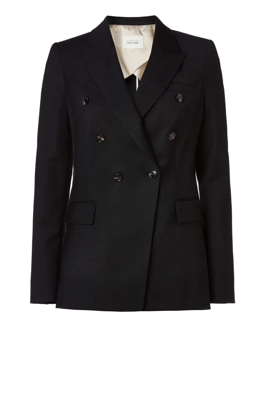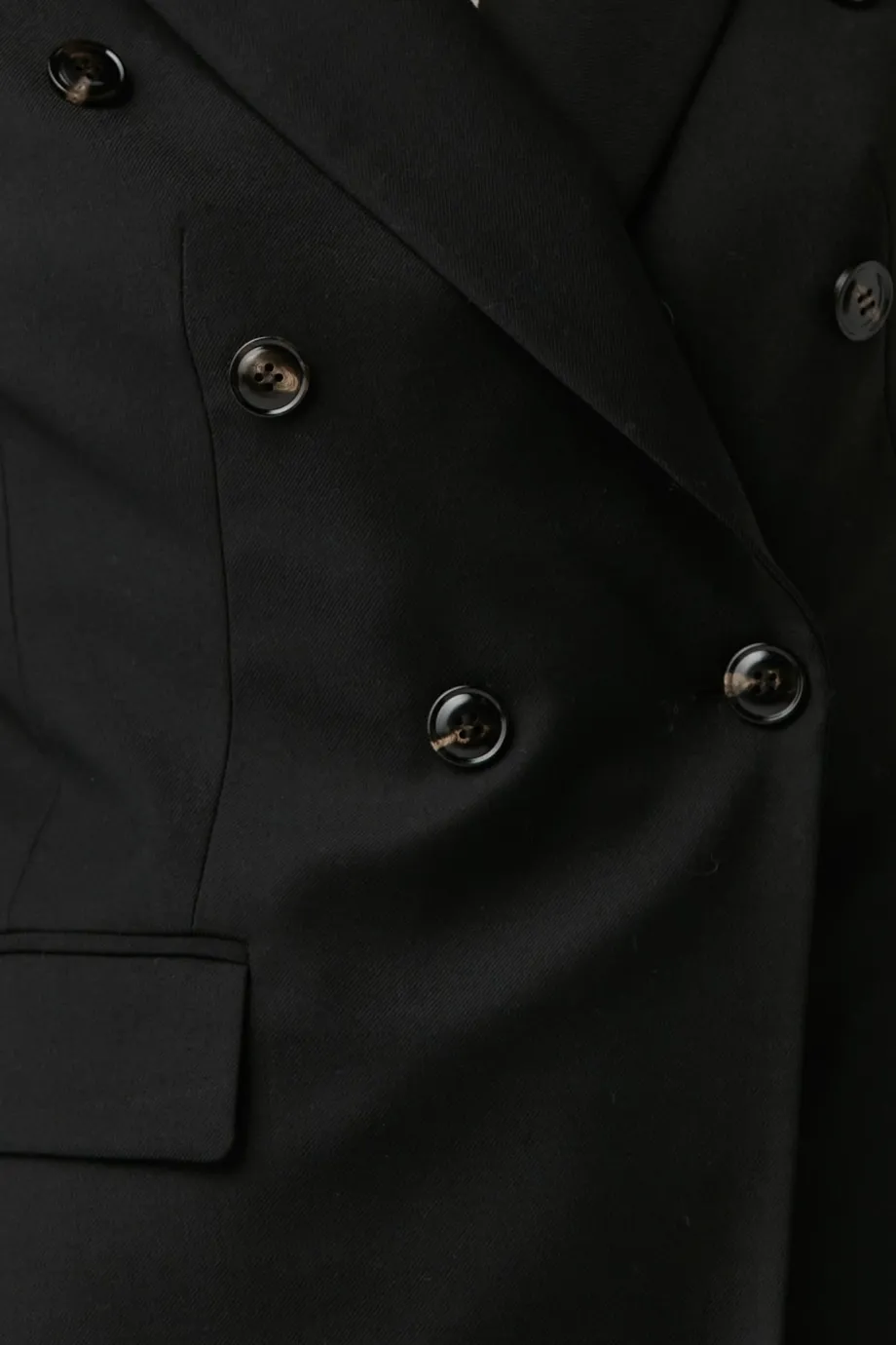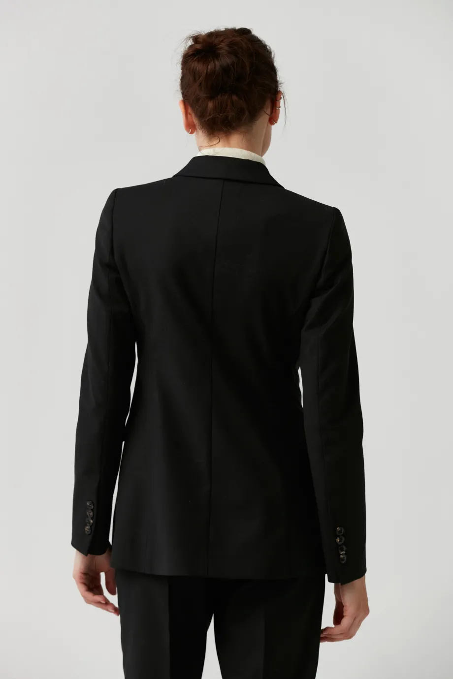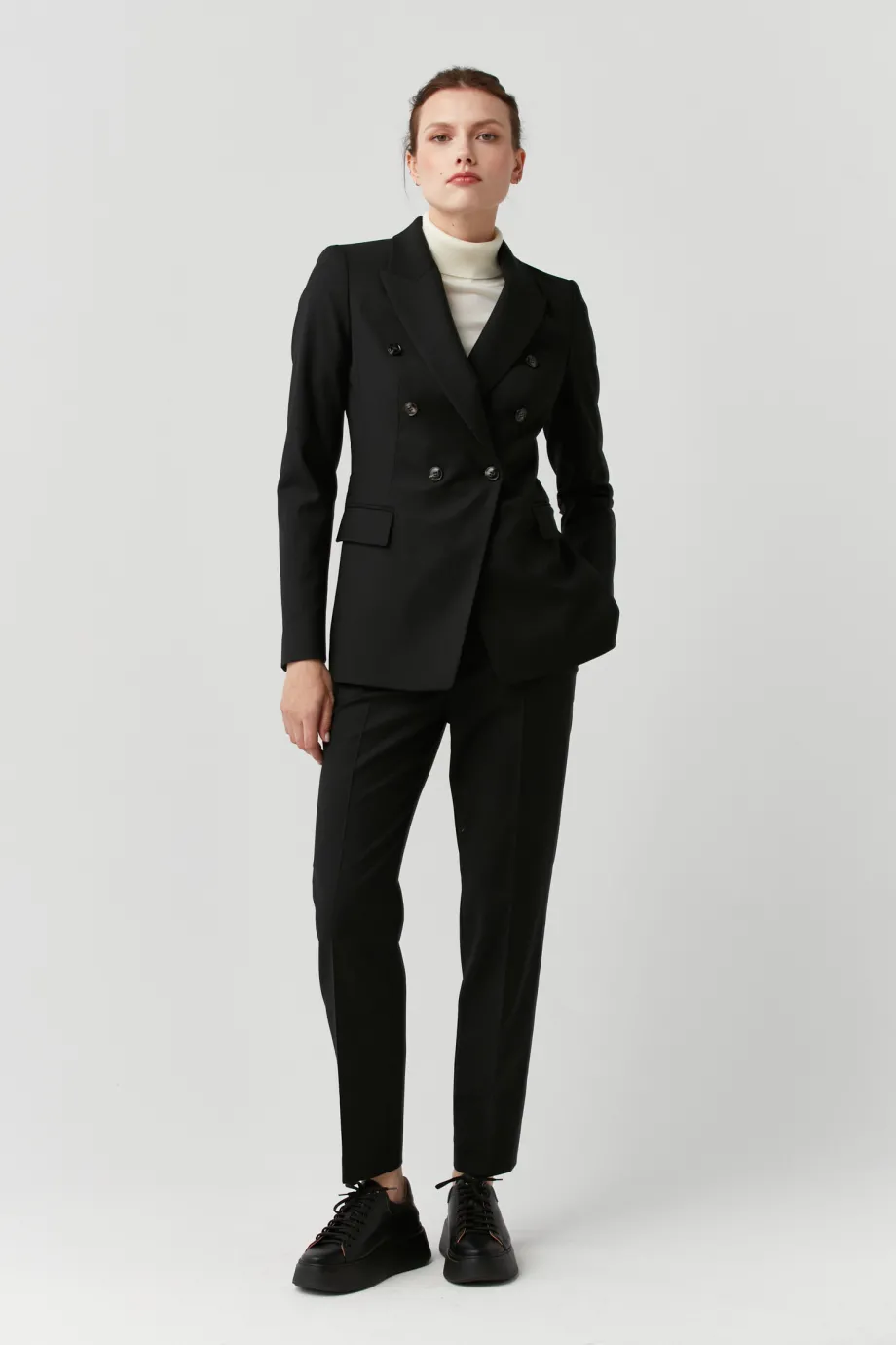 Černé projmuté dámské sako SOPHIE je ideální volbou pro obchodní jednání, banket nebo večeři. Dvouřadý model s poloviční podšívkou je vyroben z panenské vlny, což zajišťuje trvanlivost a pohodlí při nošení. K doplnění setu si vyber kalhoty ze stejné tkaniny a vytvoř oblek na velké výjezdy. Podívej se také na naše další produkty.