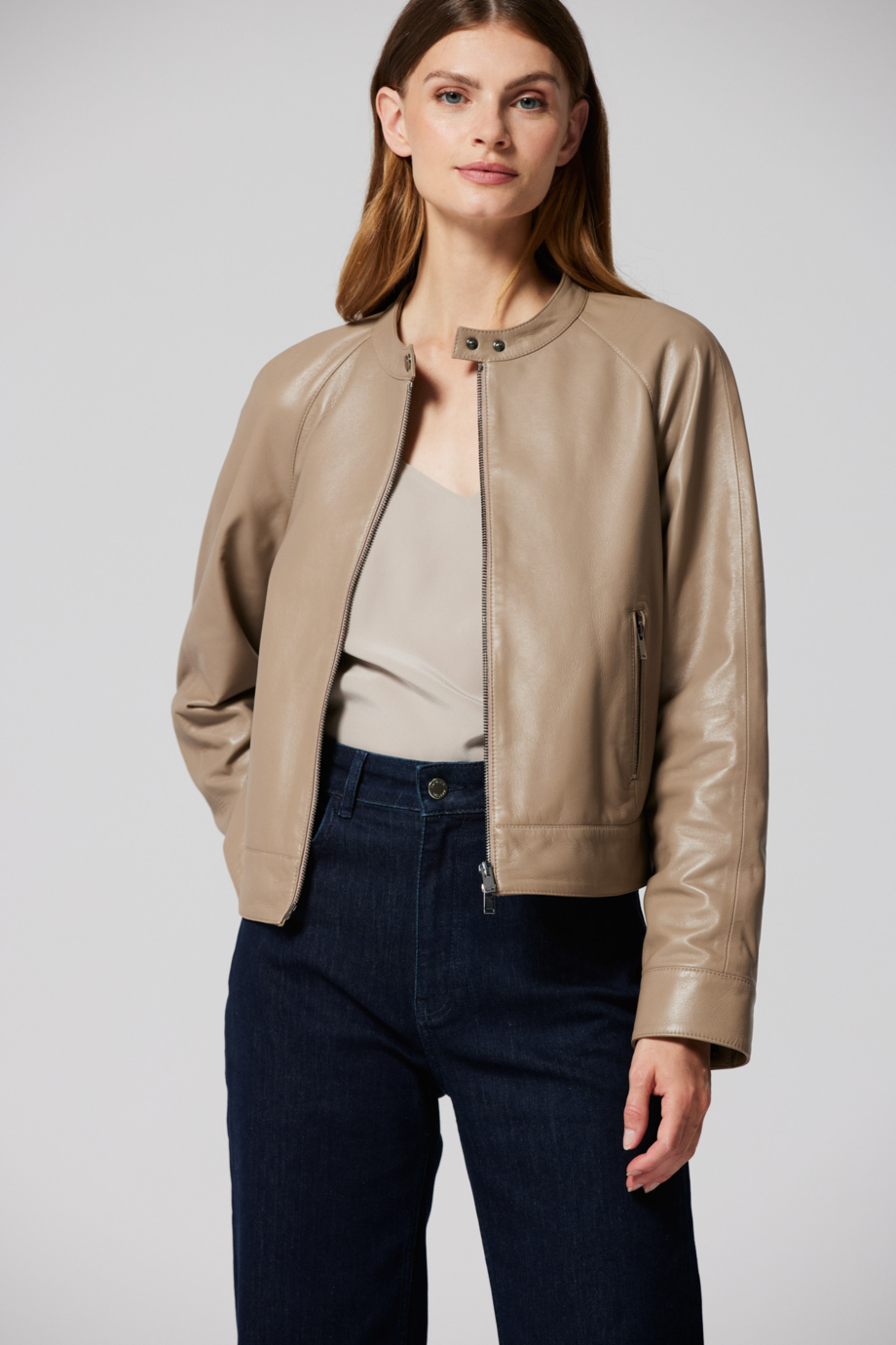 Bežová kožená bunda s límcem
