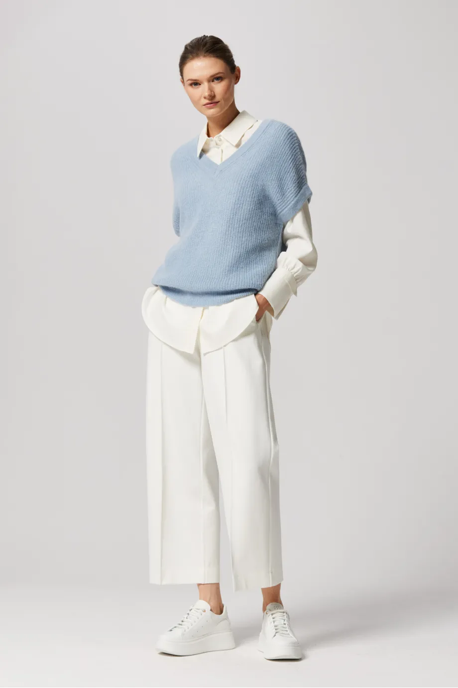 Modelka na fotografii má 177 cm výšku, nosí velikost 36/38.