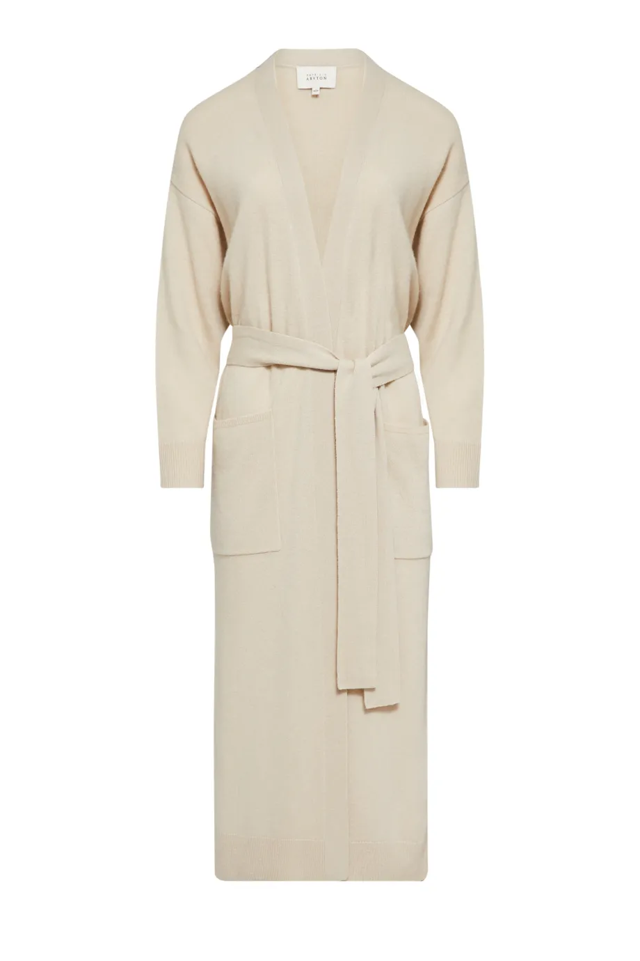 Přiložený pásek slouží pro svazování v pase a akcentování pasu, ale tento dlouhý kardigan s kapsami úžasně vypadá také s pásem sbíraným ze zad nebo volně puštěným podél těla. Svetr sahá přibližně až k výšce ⅓ lýtka, tedy se jedná o delší variantu midi střihu, která fantasticky ladí s jakýmkoli druhem obuvi, včetně kotníkových bot, hiking bot a kozaček.