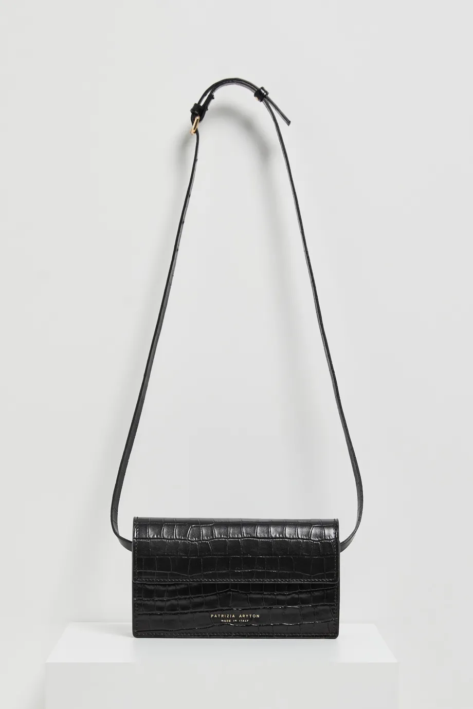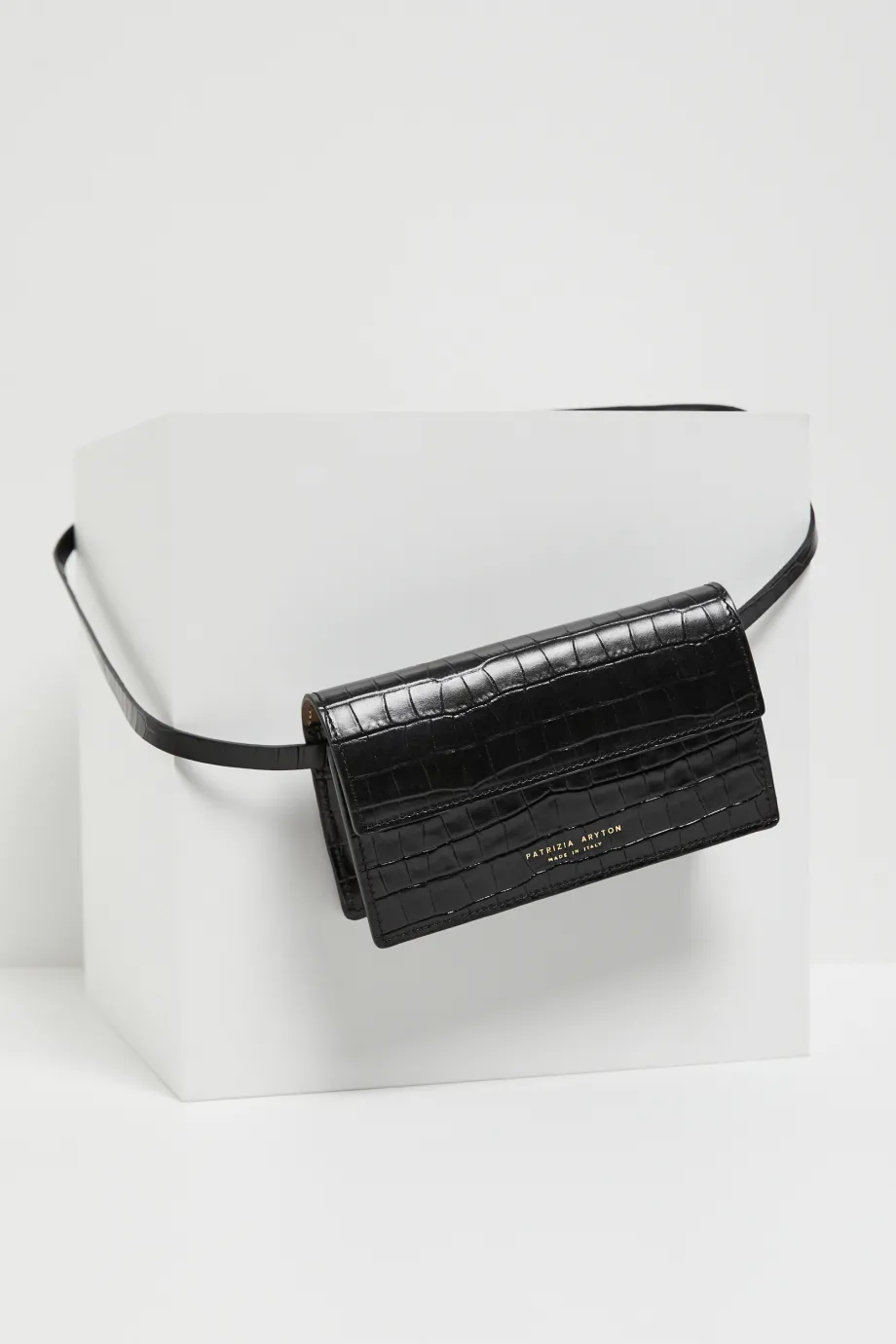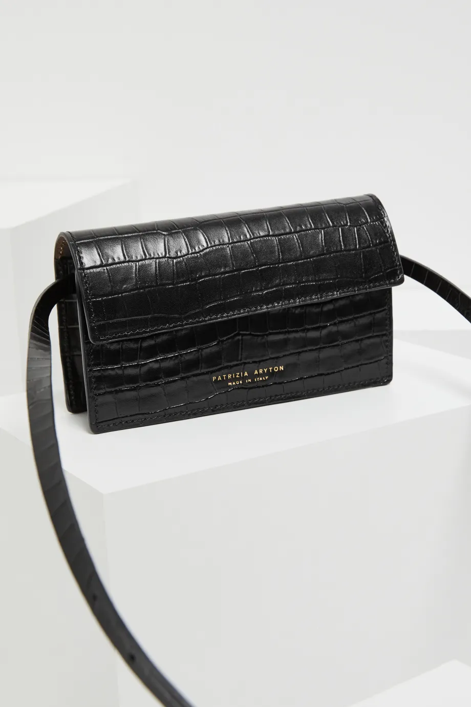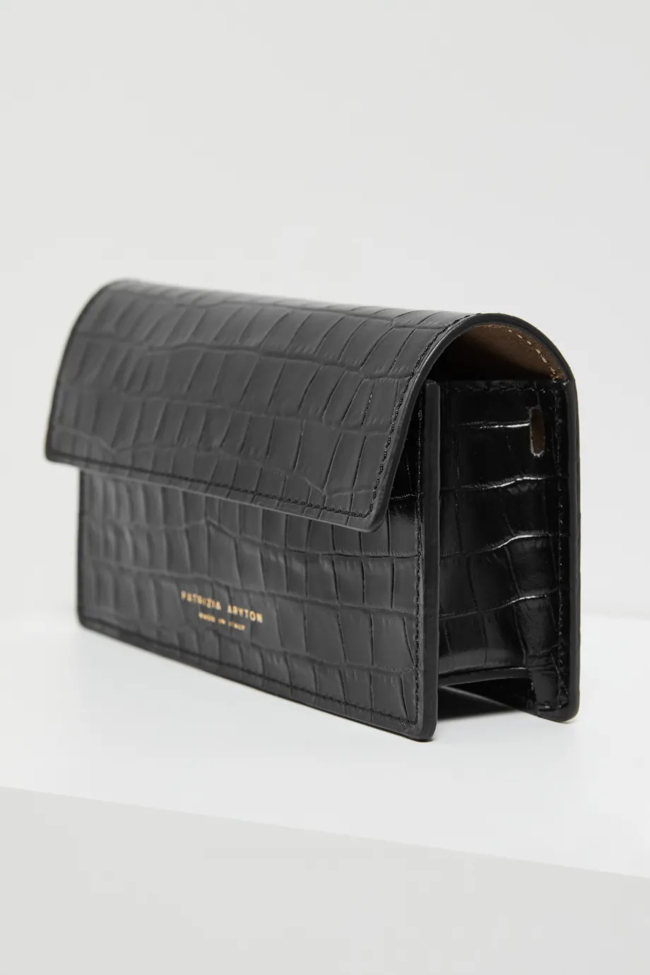 Vyrobena z černé přírodní kůže s texturou připomínající krokodýlí kůži, odolná proti poškrábání, s elegantními zlatými kovovými prvky.