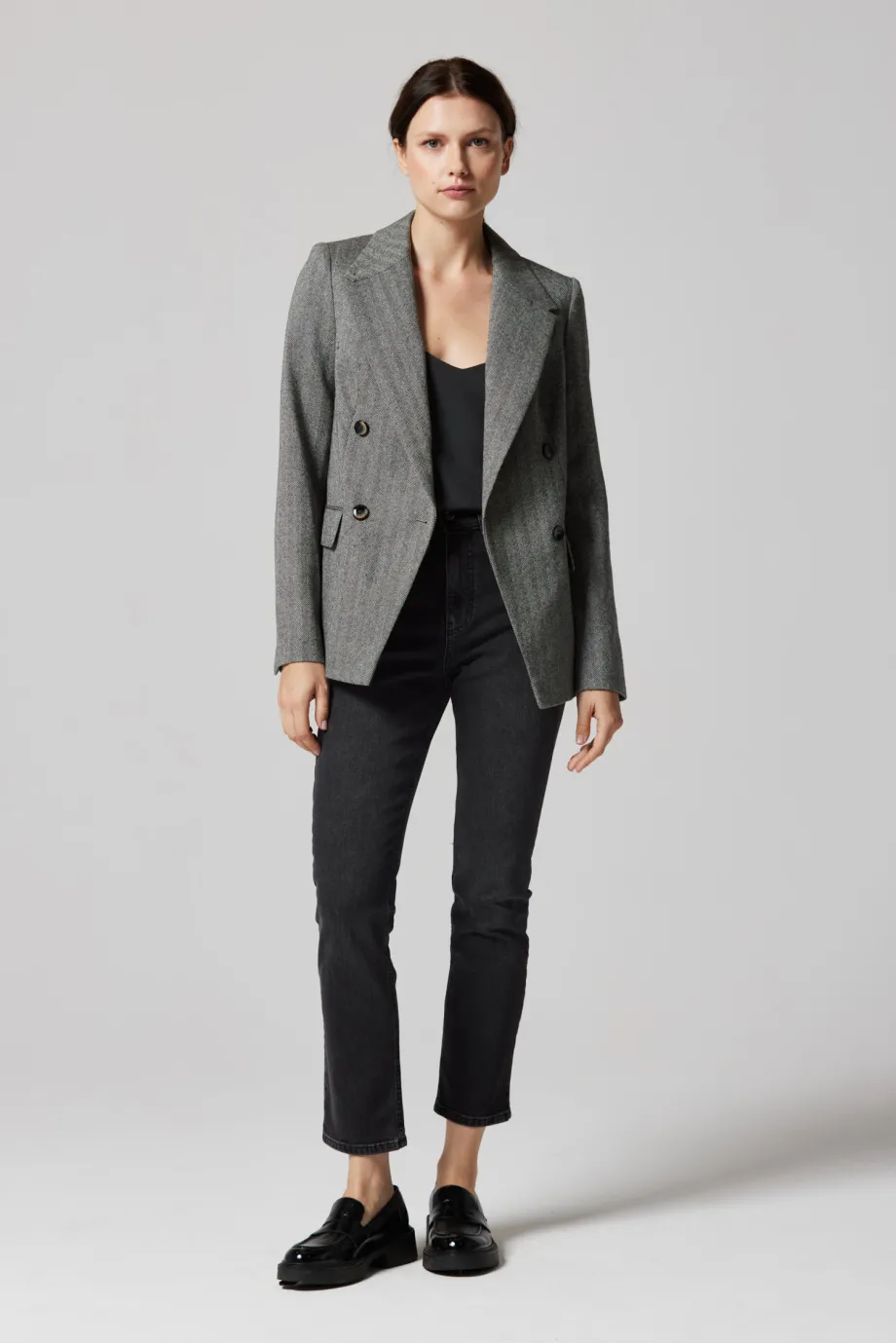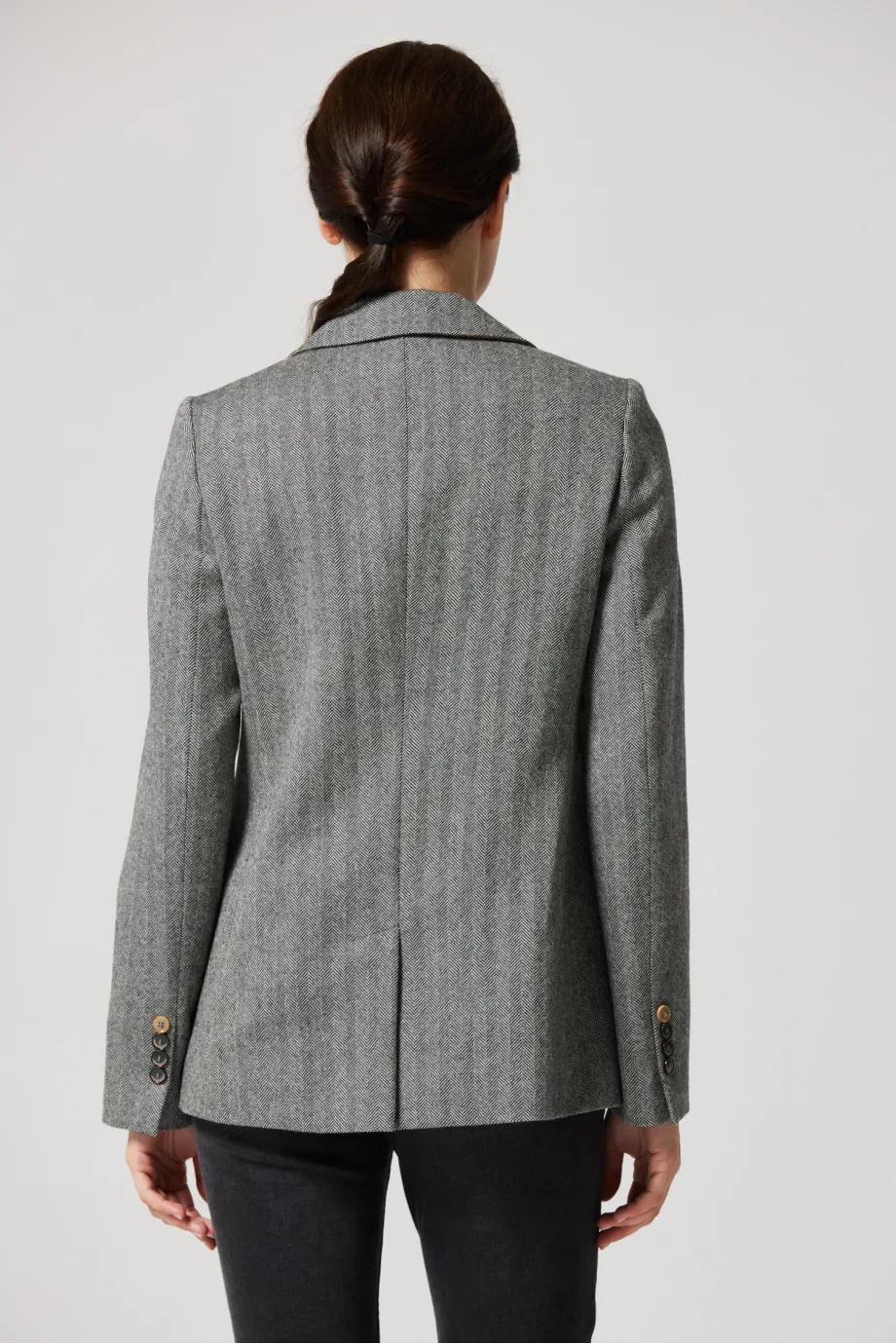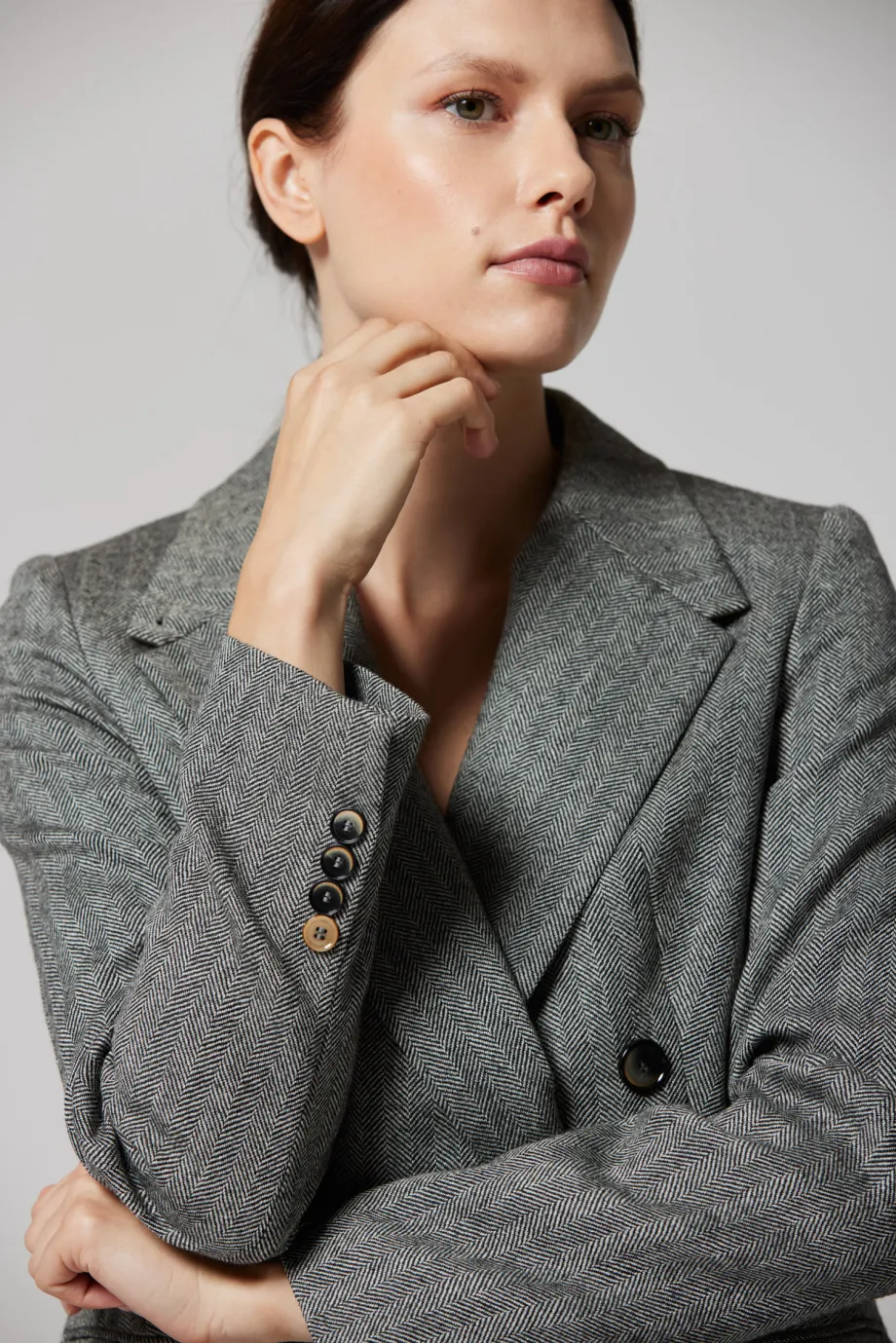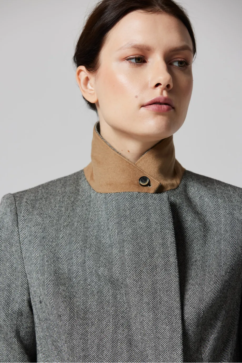 látka v herringbone vzoru, pod límcem látka v barvě camel