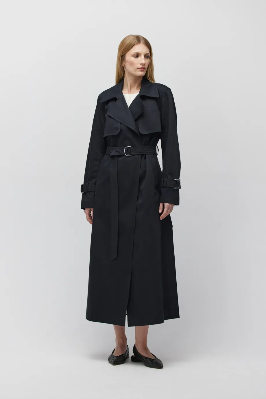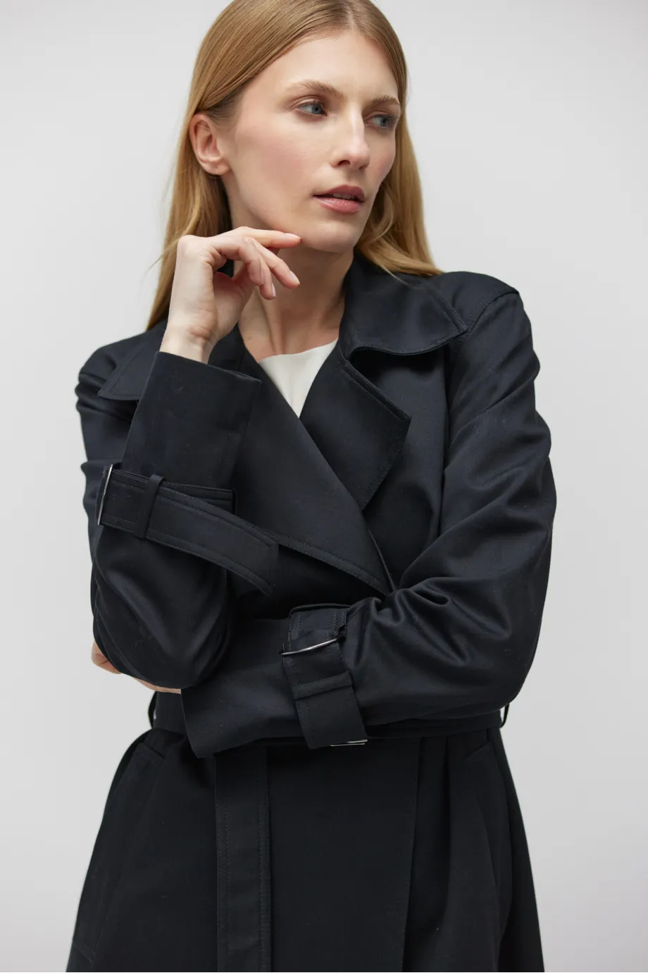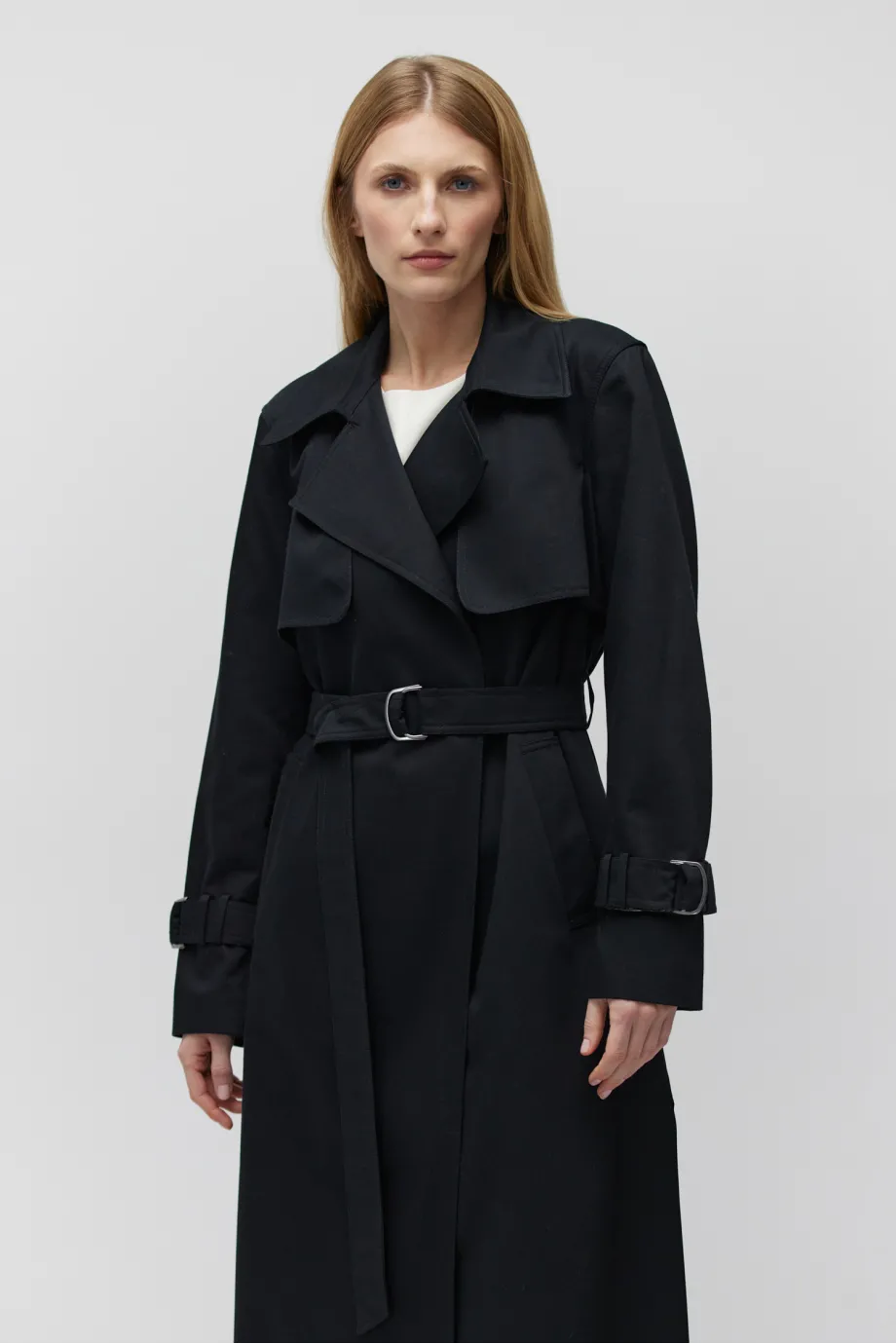 Černý bavlněný kabát s zapínáním na pásek s kovovou sponou a cvočky.