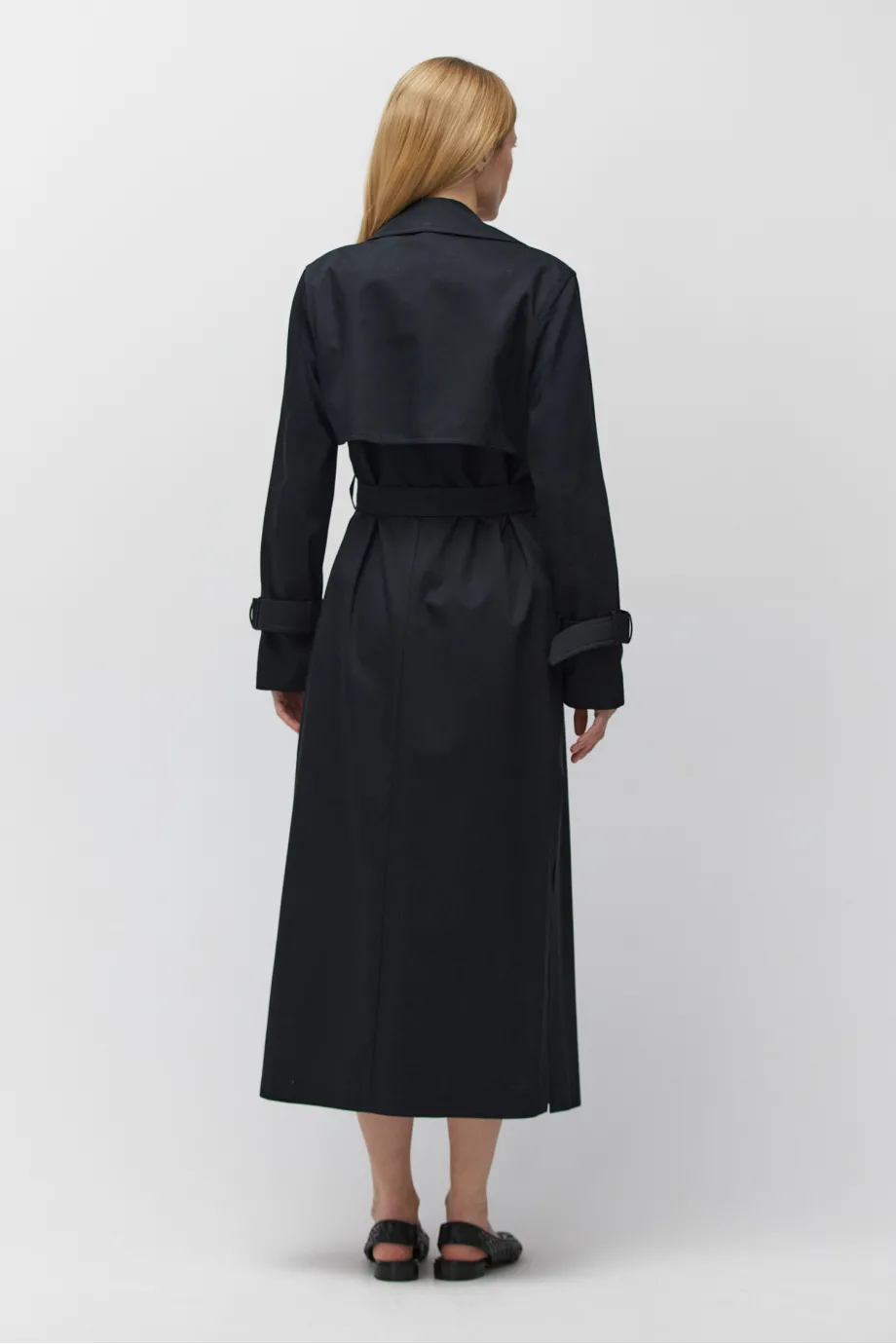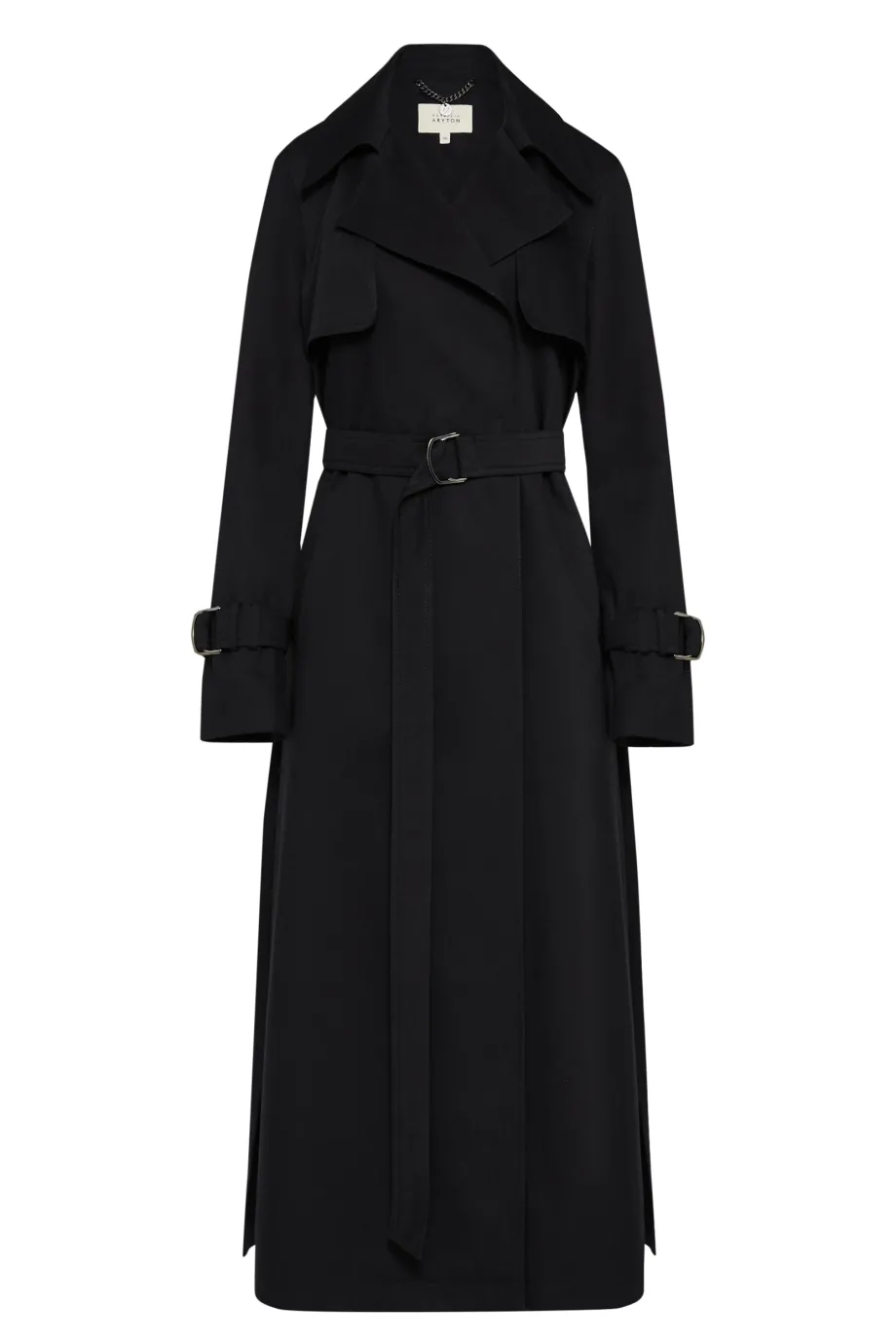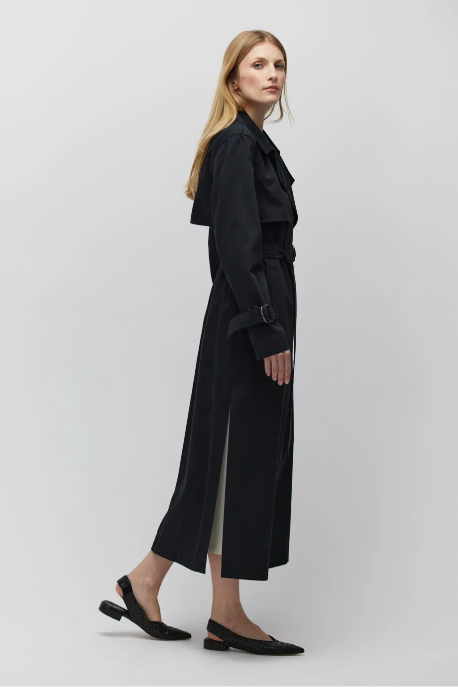 Černý bavlněný kabát s zapínáním na pásek s kovovou sponou a cvočky.