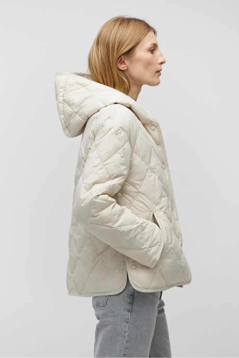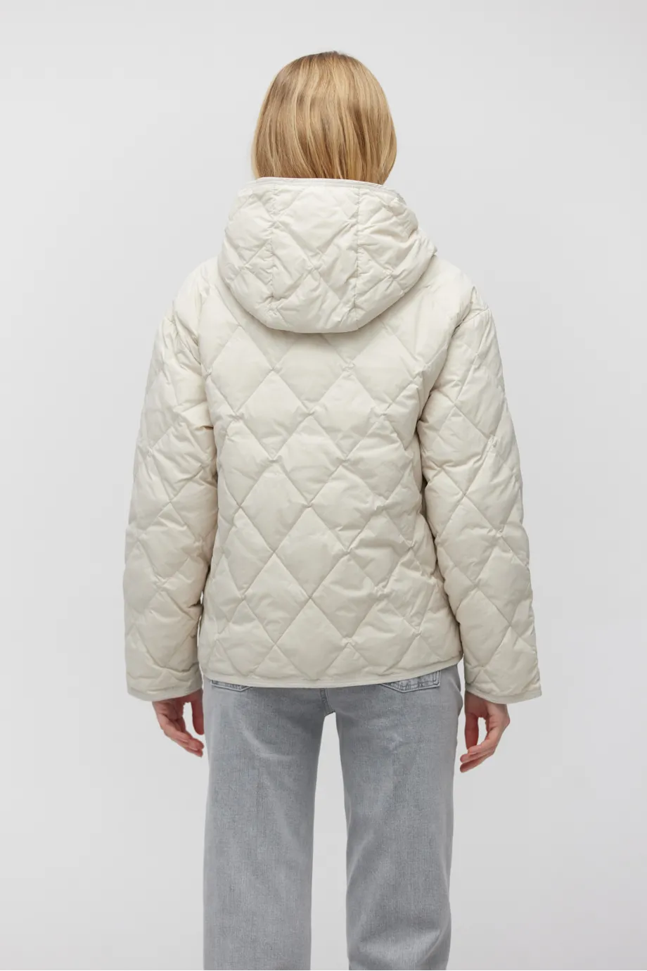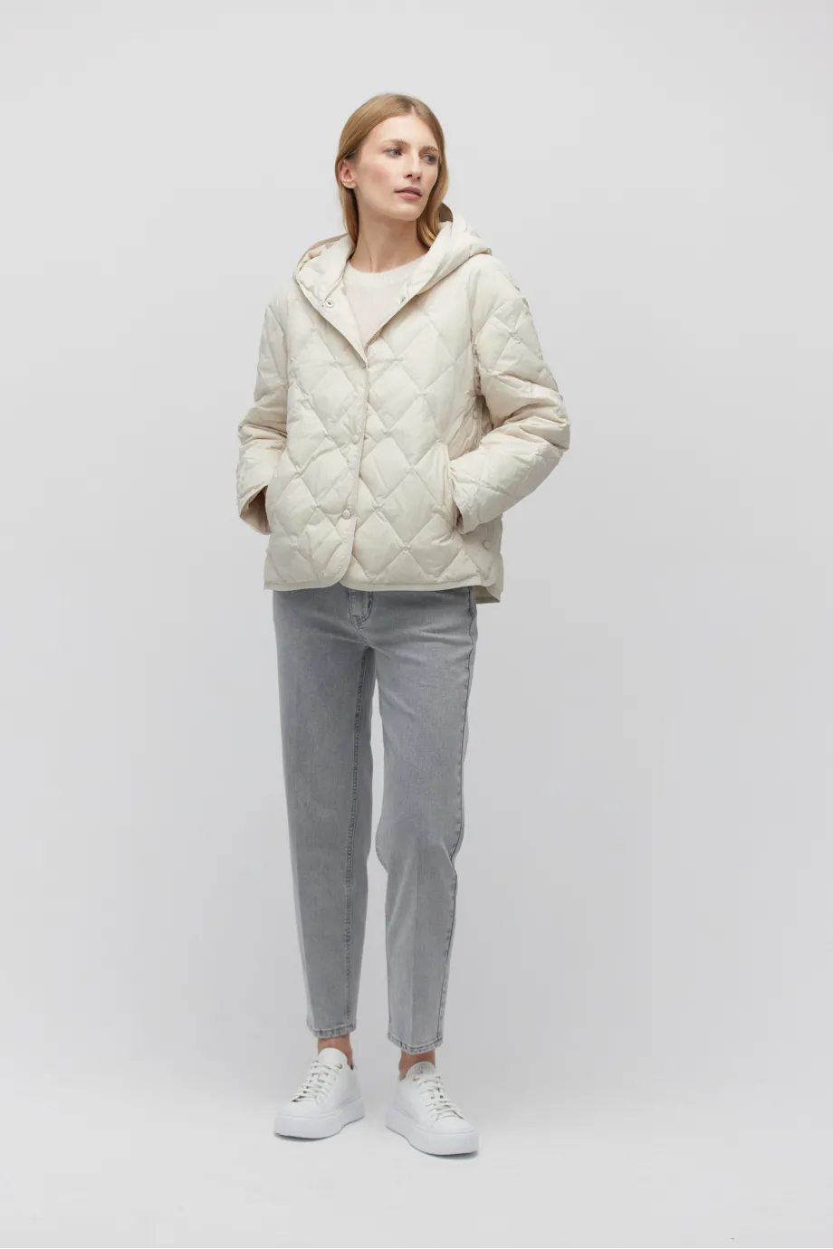 Krátká bunda s kapucí v chladném odstínu béžové, s přírodním péřovým vyplněním.