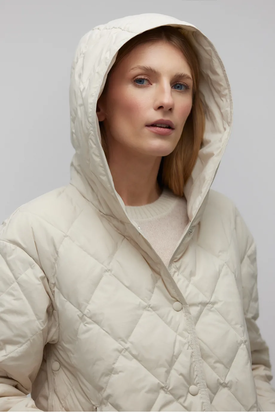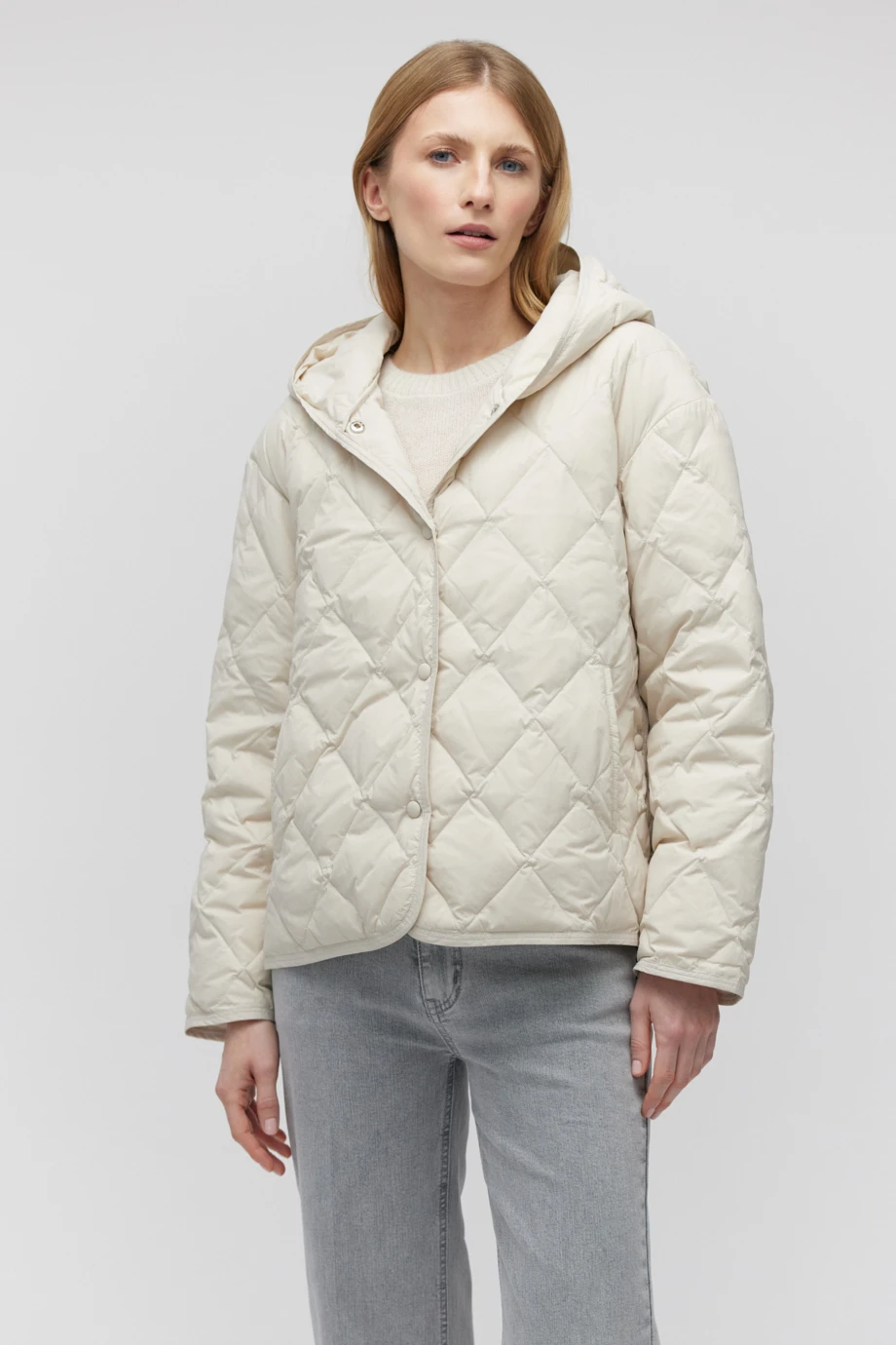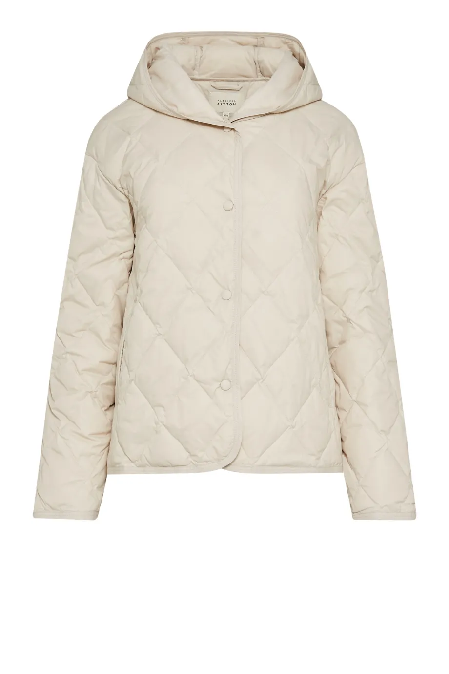 Krátká bunda s kapucí v chladném odstínu béžové, s přírodním péřovým vyplněním.