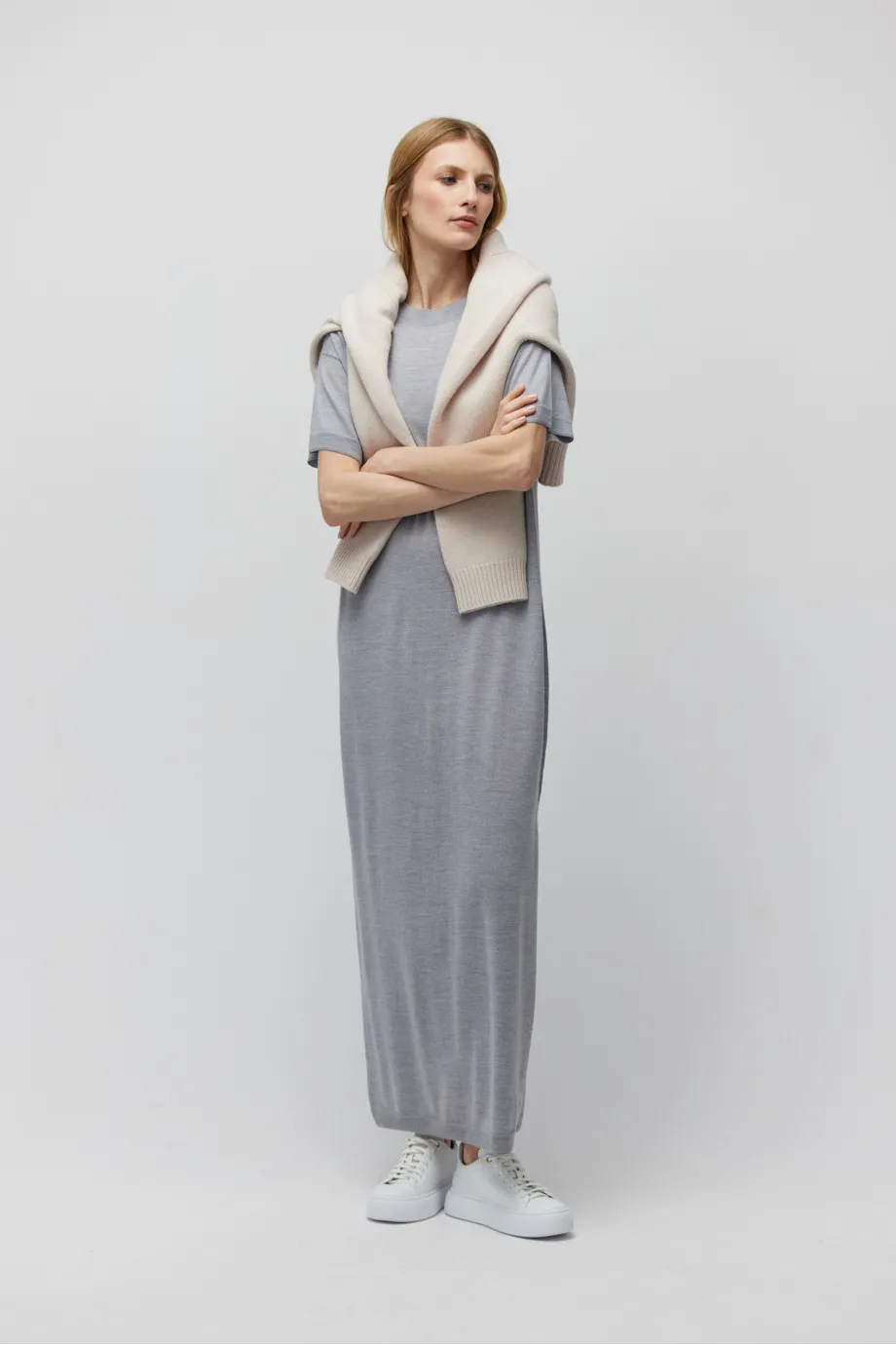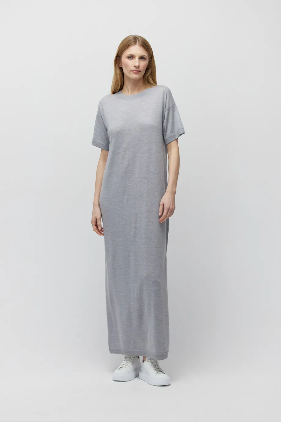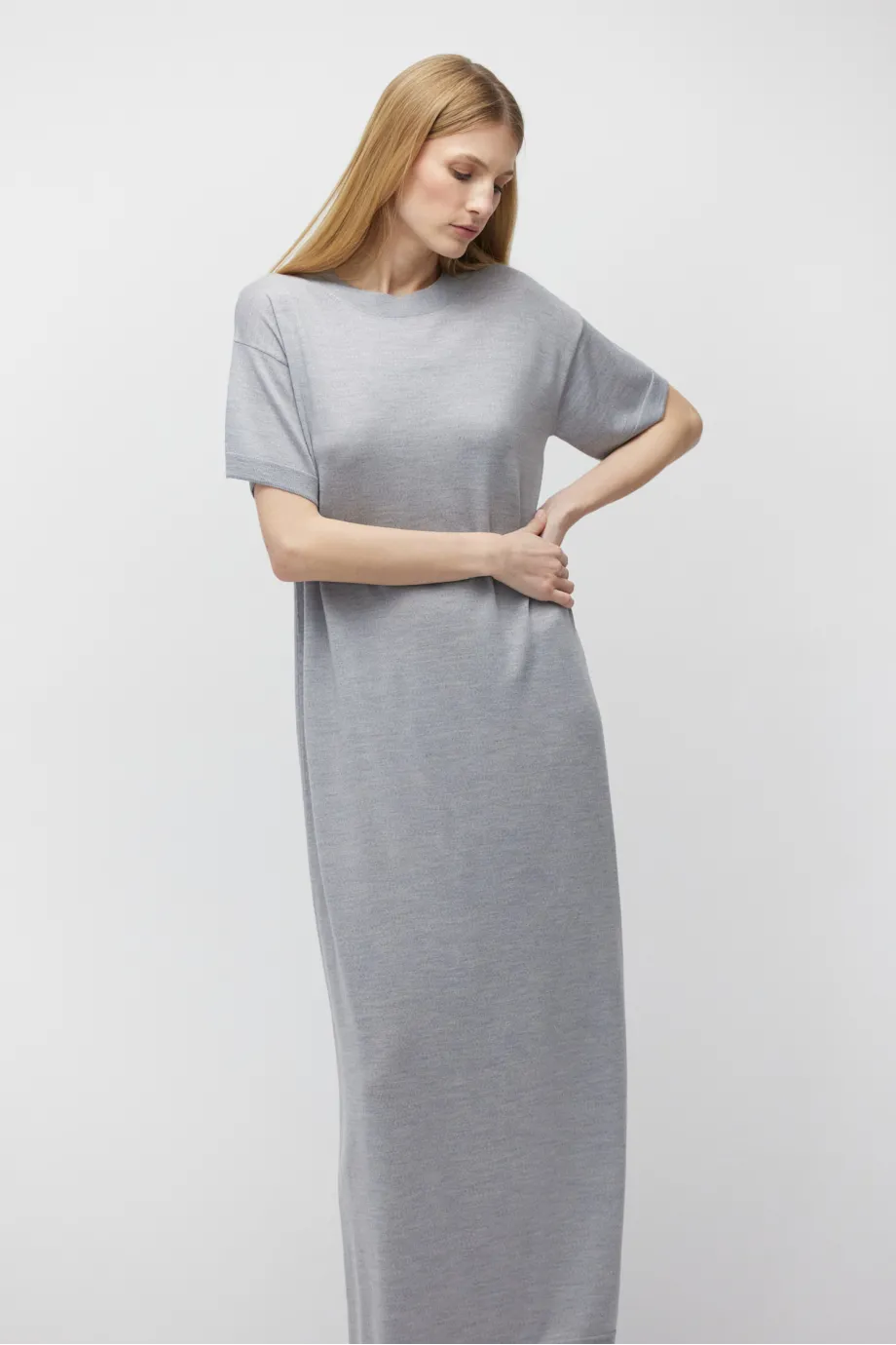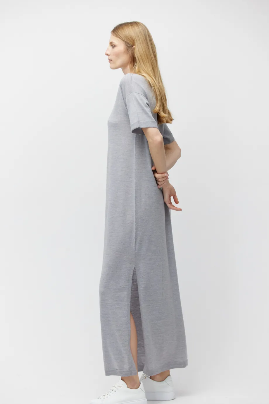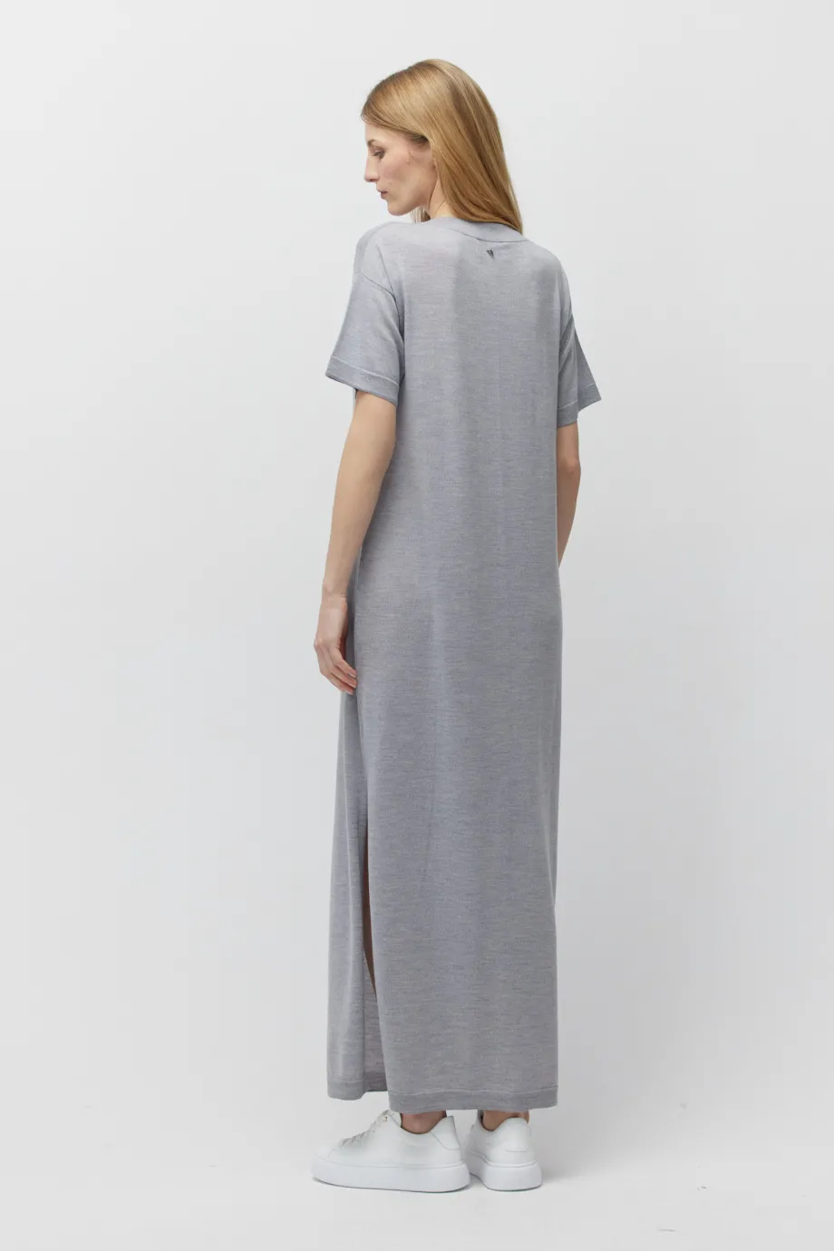 Kulatý výstřih, krátký rukáv, volný střih s rozparkem na boku.