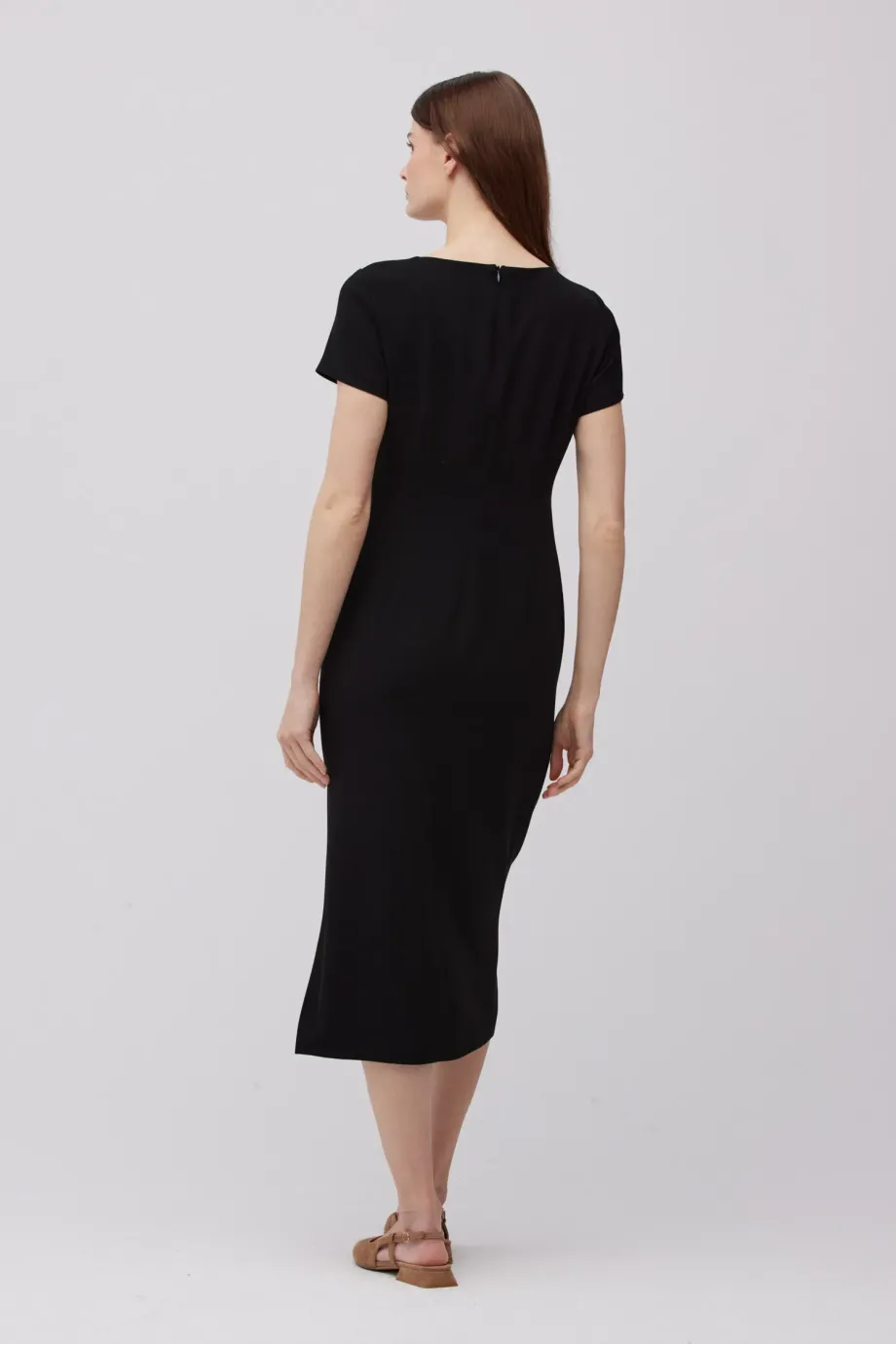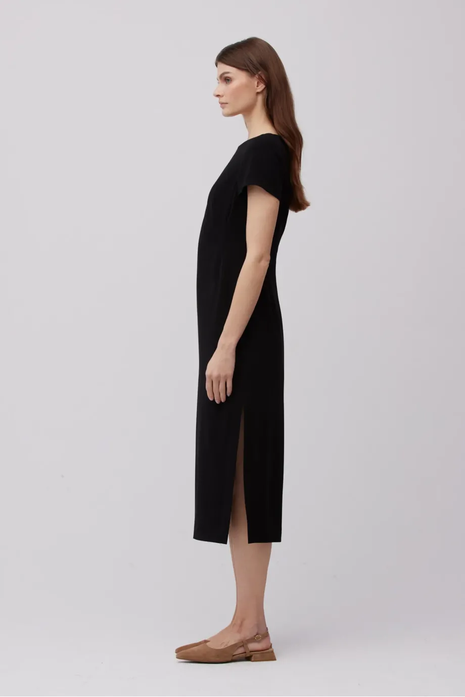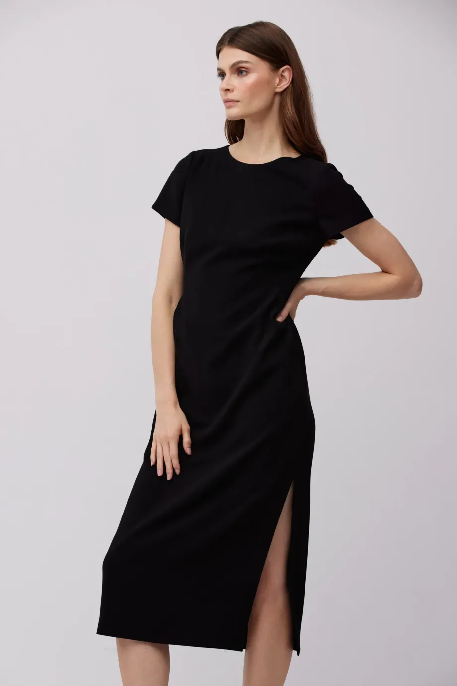 Černé midi šaty s krátkým rukávem a kulatým výstřihem.