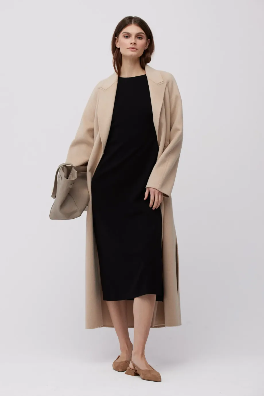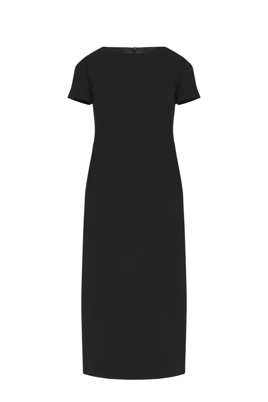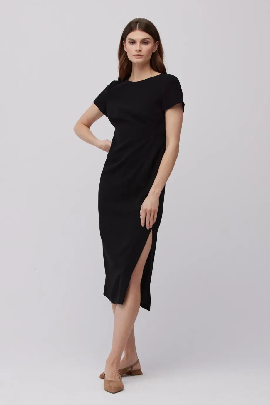 Černé midi šaty s krátkým rukávem a kulatým výstřihem.