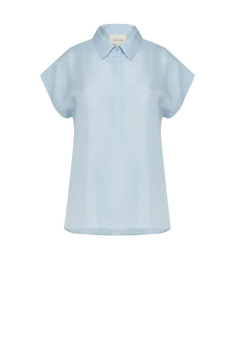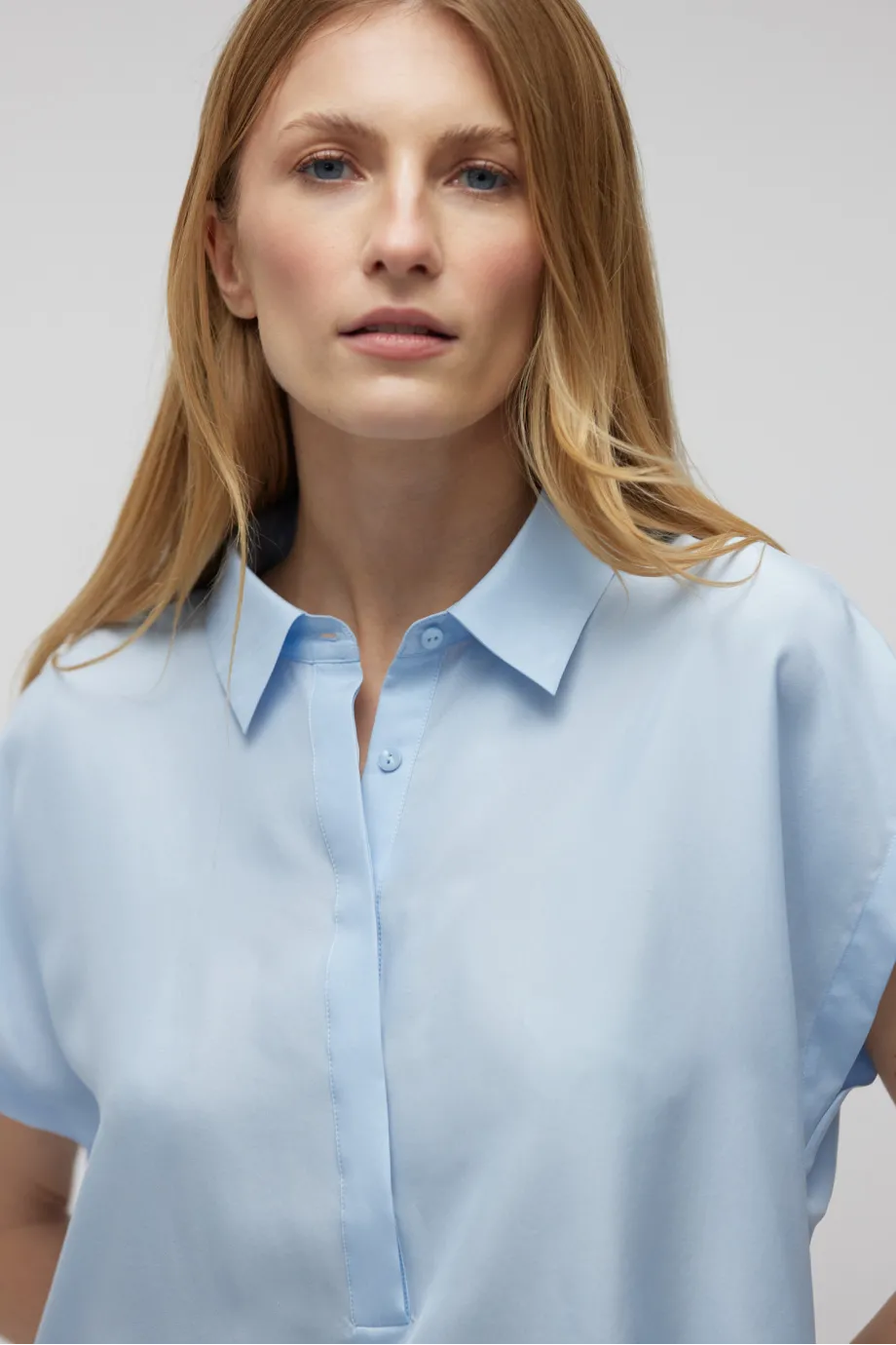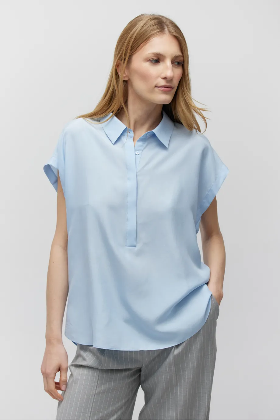 Zapínání na knoflíky z perleťových mušlí, límec a krátký, mírně spadlý rukáv.