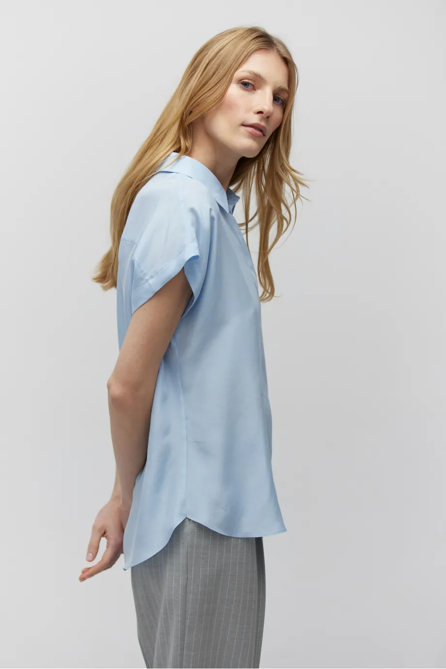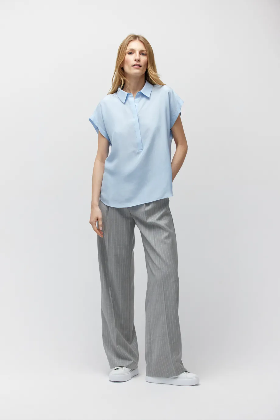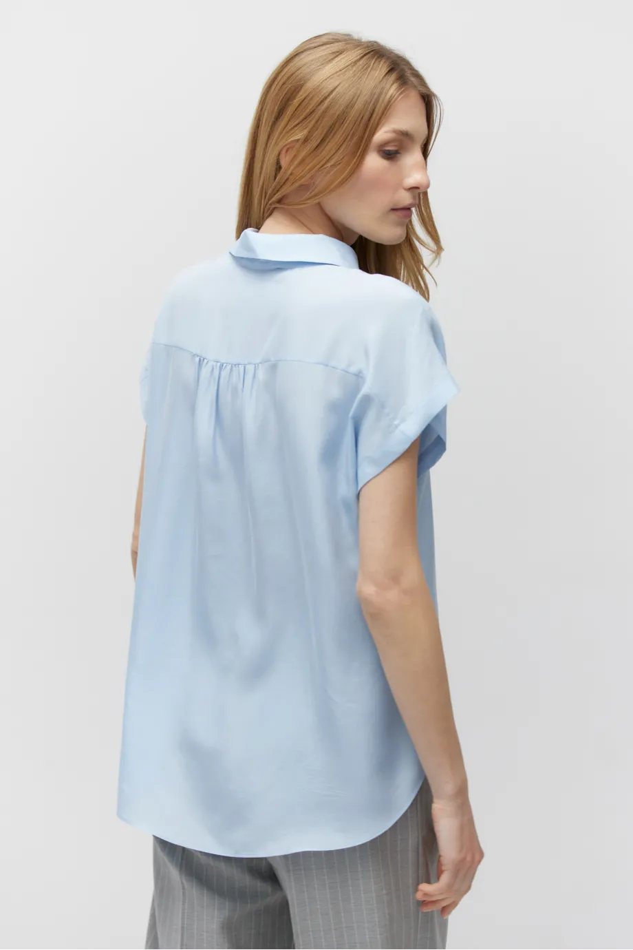 Zapínání na knoflíky z perleťových mušlí, límec a krátký, mírně spadlý rukáv.