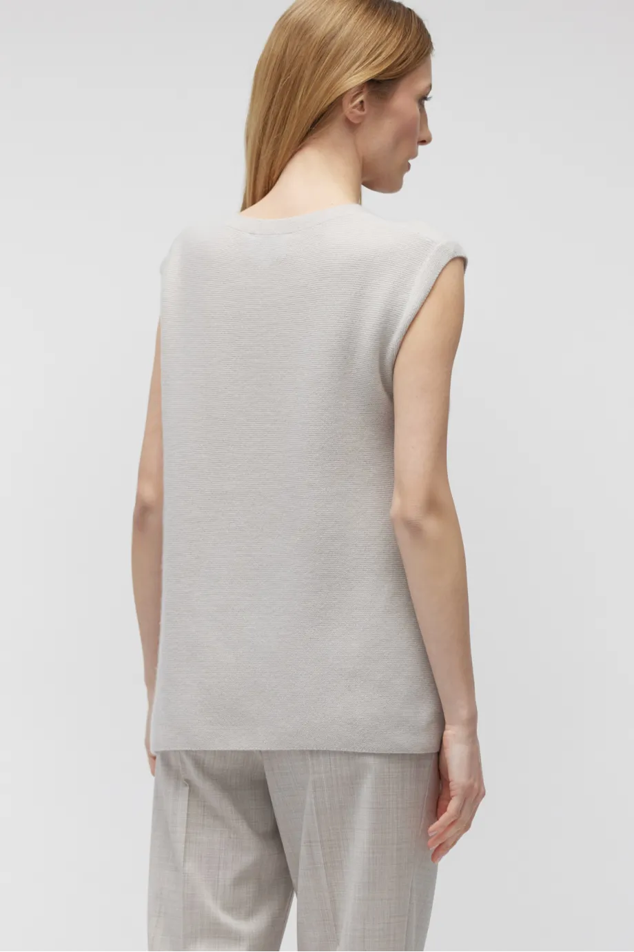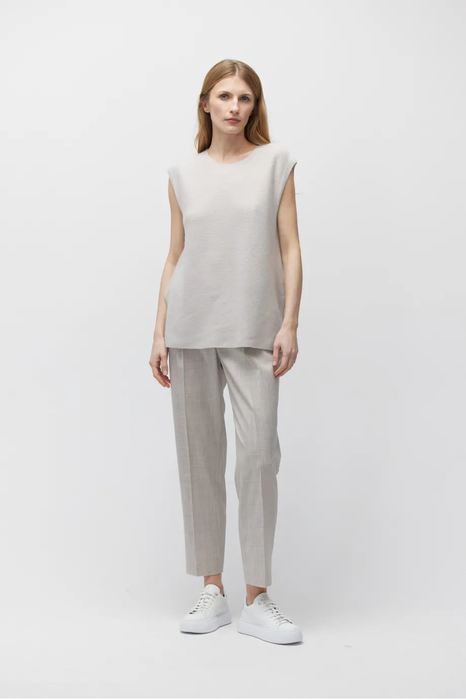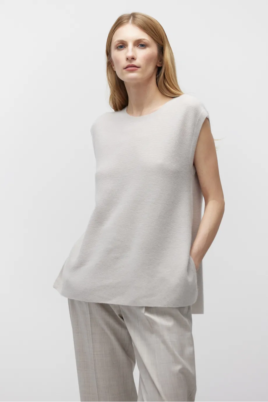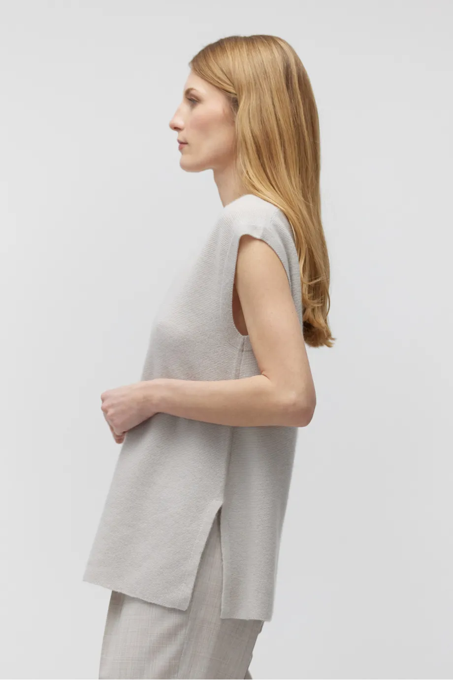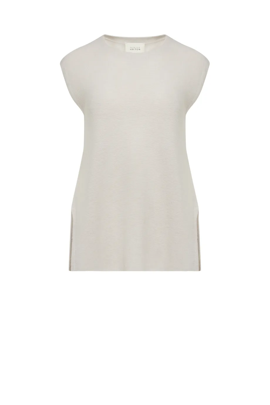 Jednoduchý tvar, bez rukávů, kulatý výstřih, boční rozparky pro lehkost a svobodu pohybu.