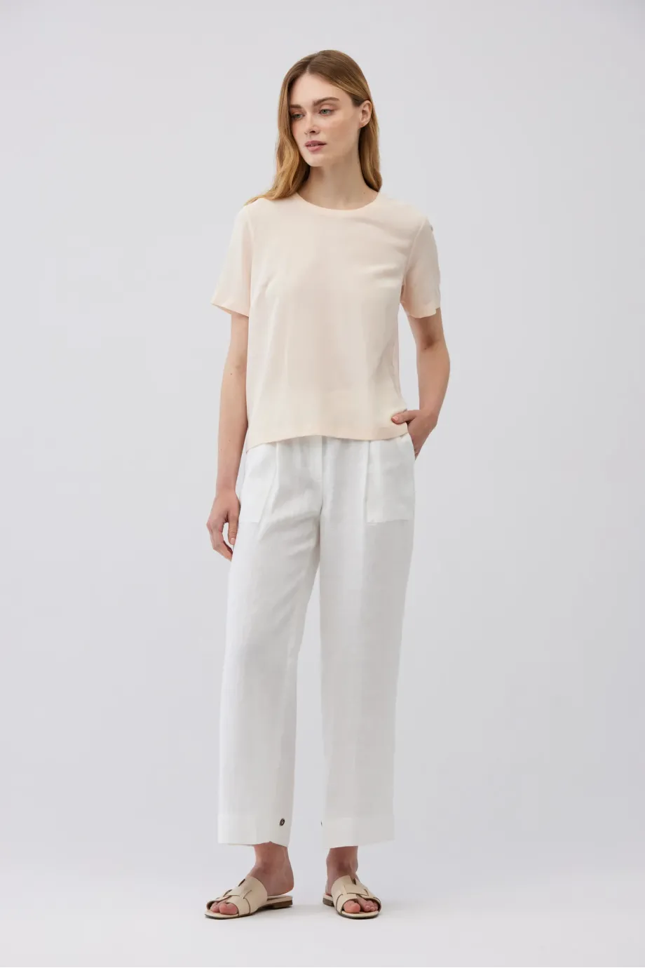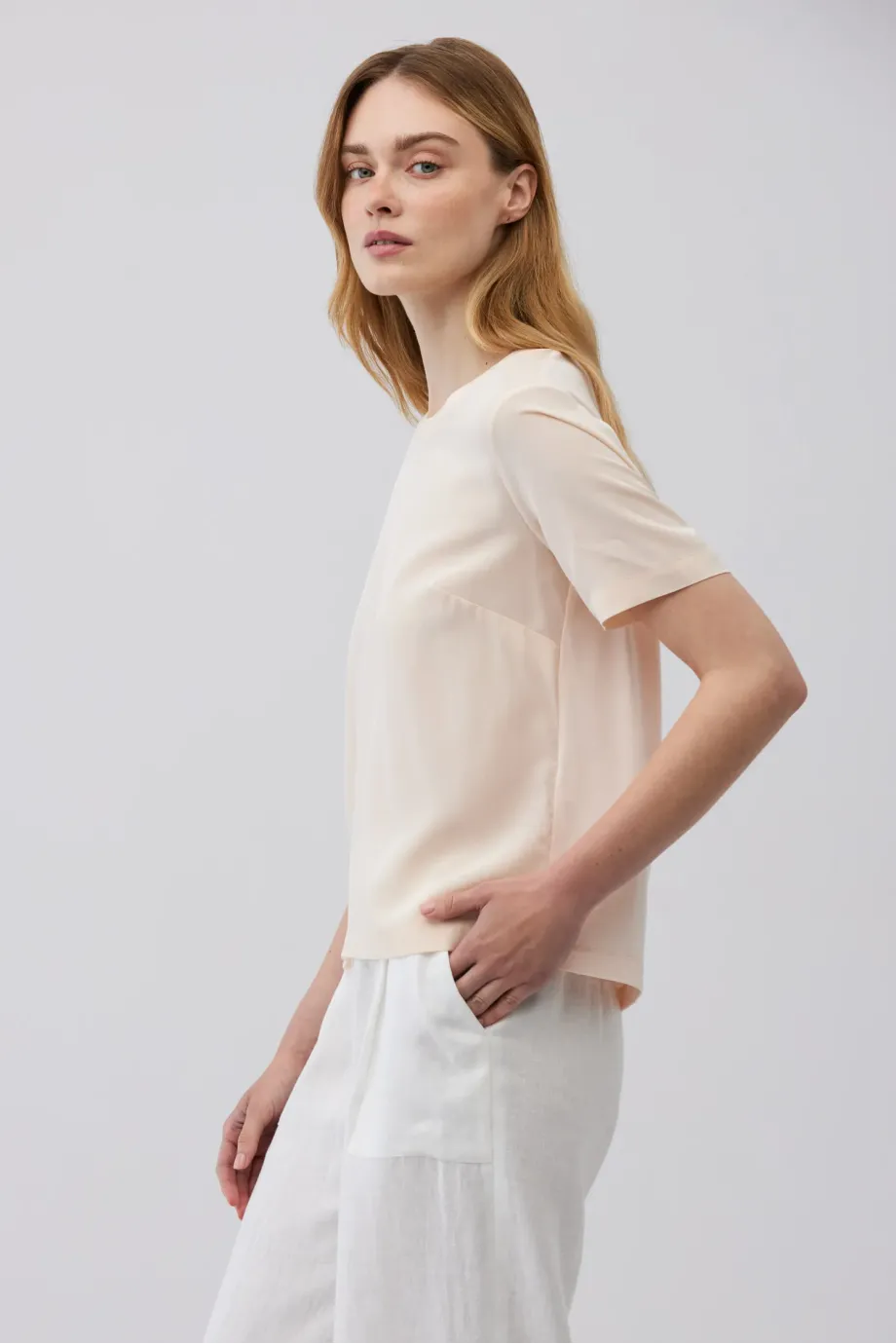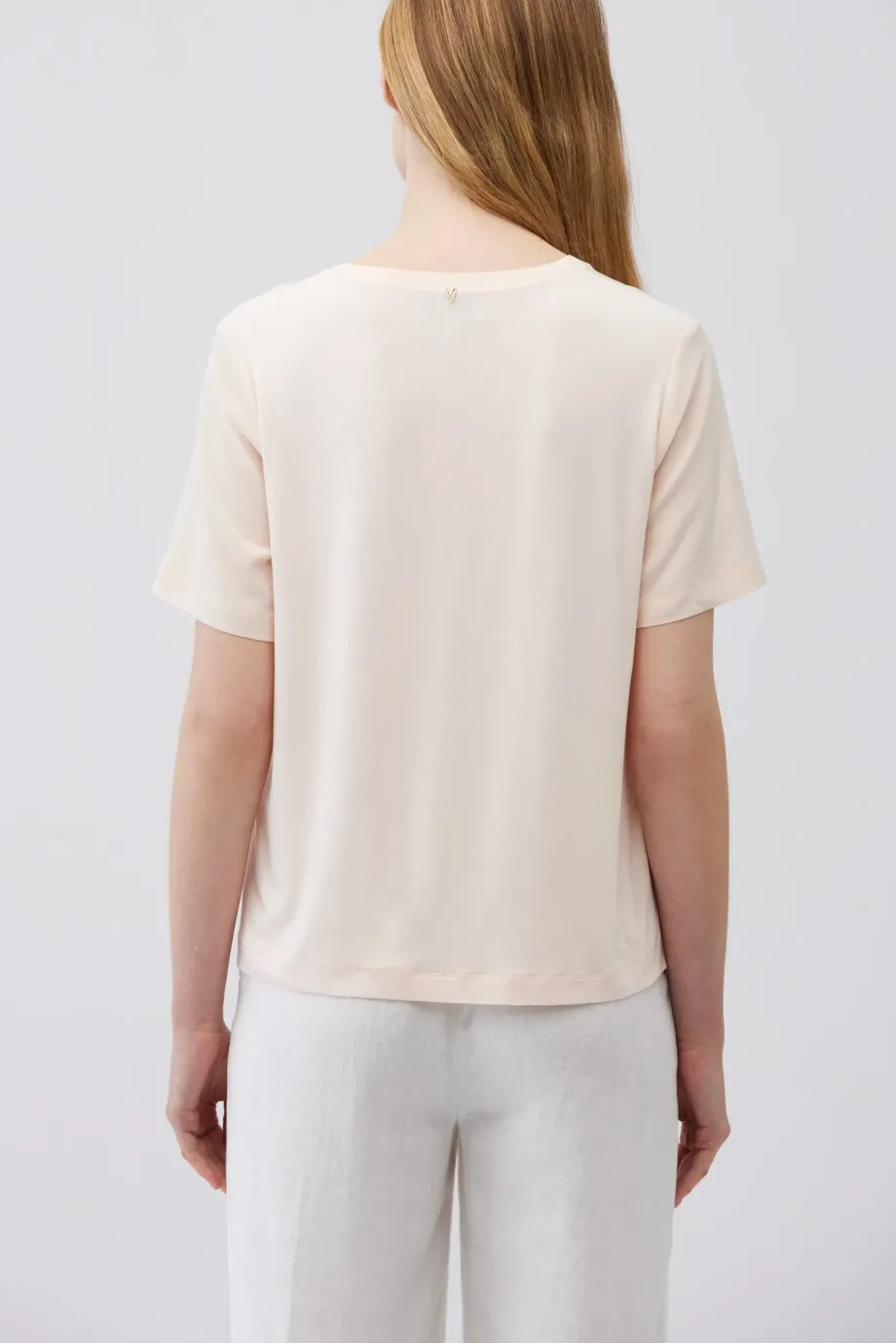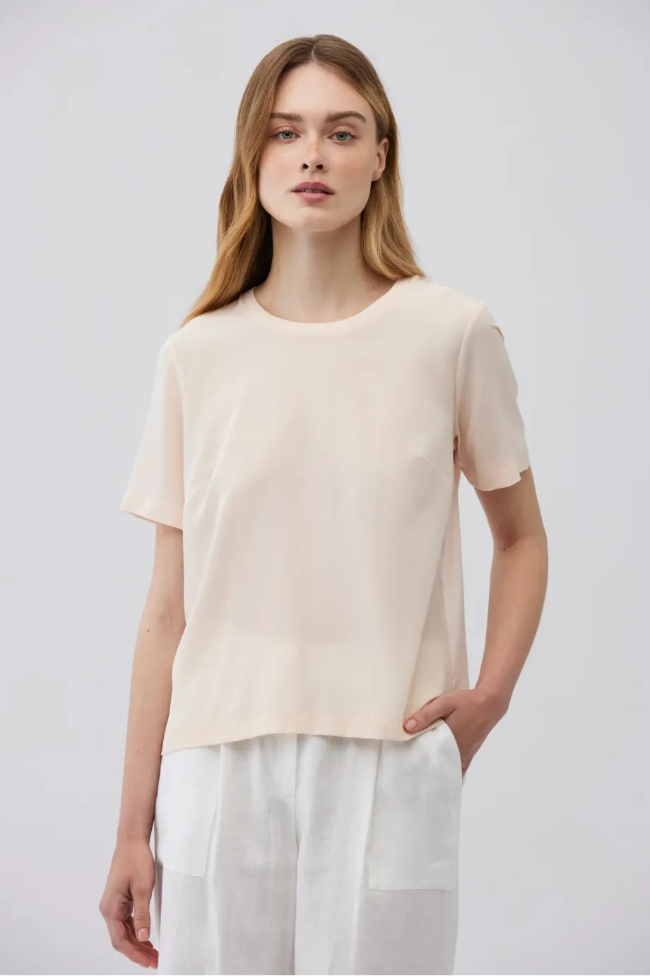 Krátký rukáv, jednoduchý a volný tvar, spojující eleganci s komfortem.