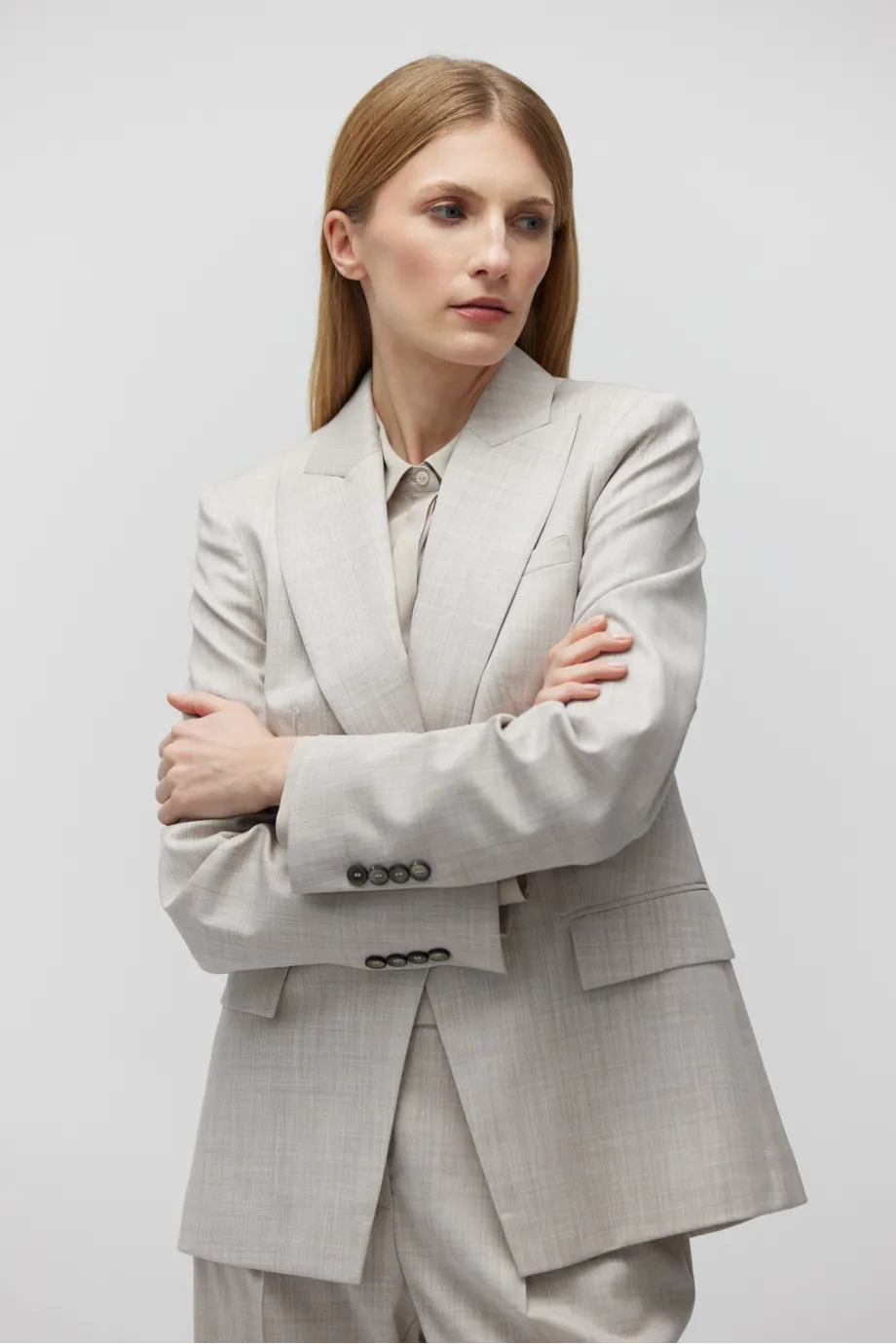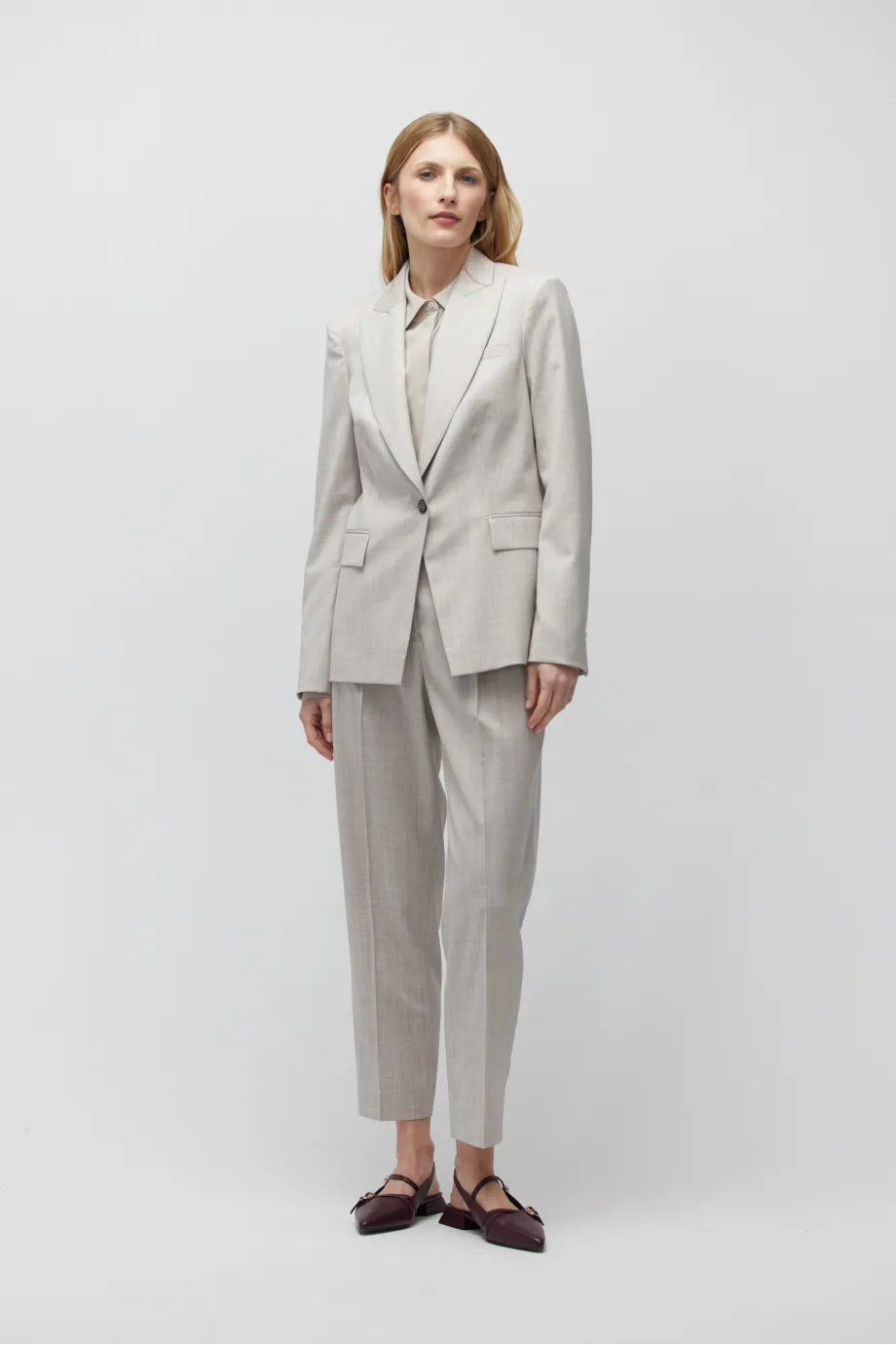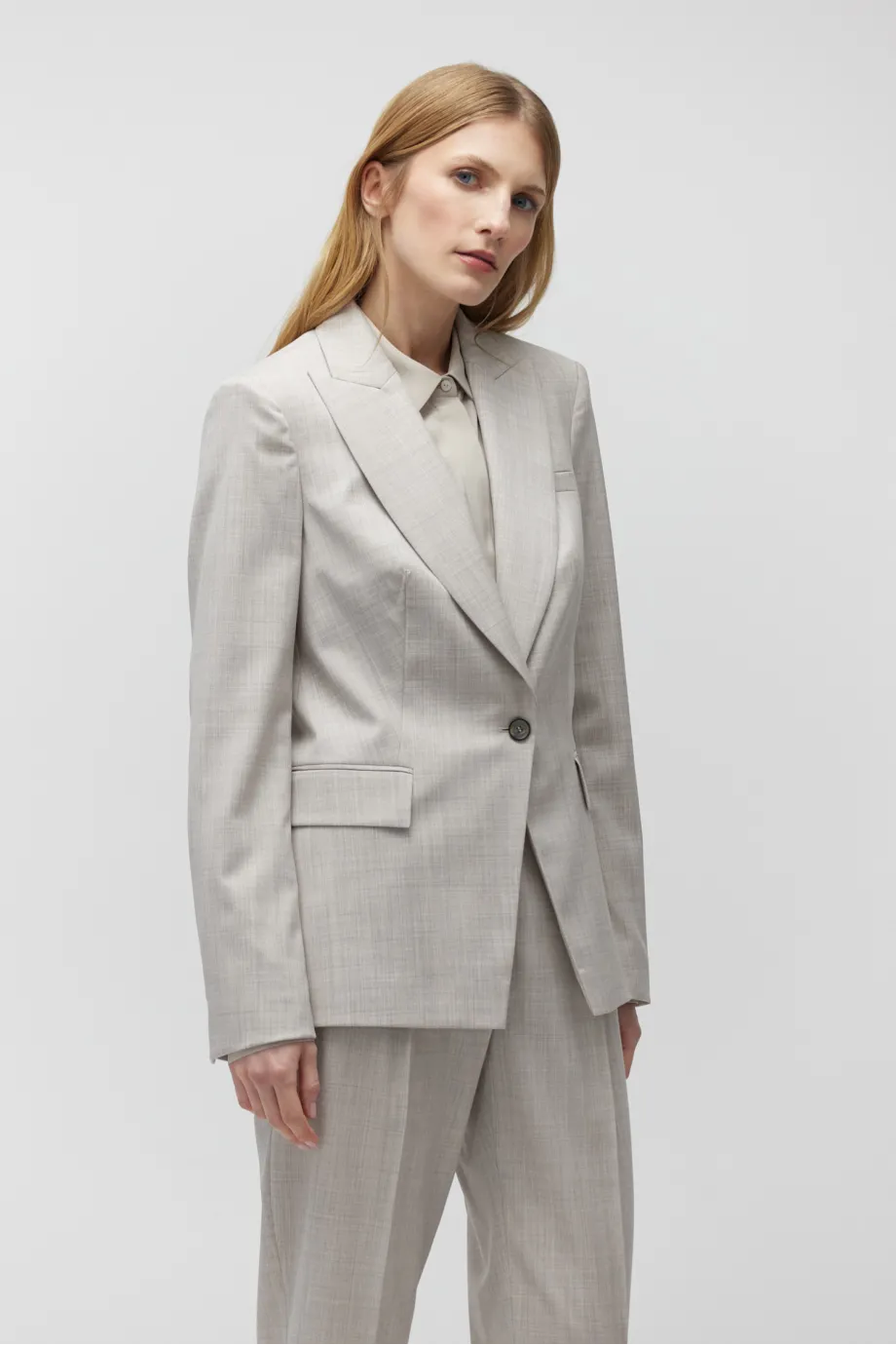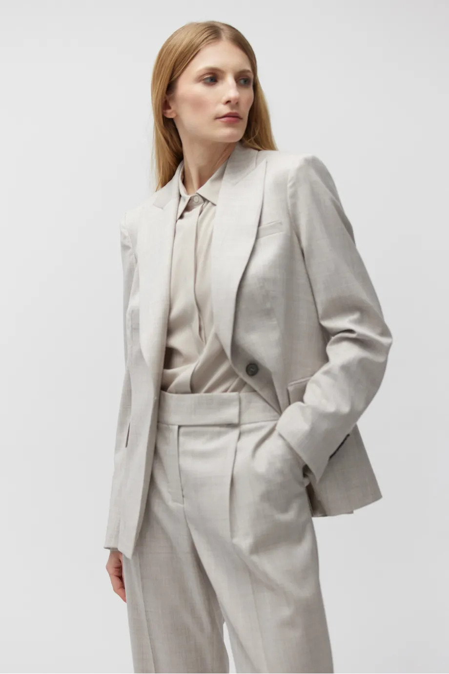 V kompletu kalhoty z téže tkaniny.