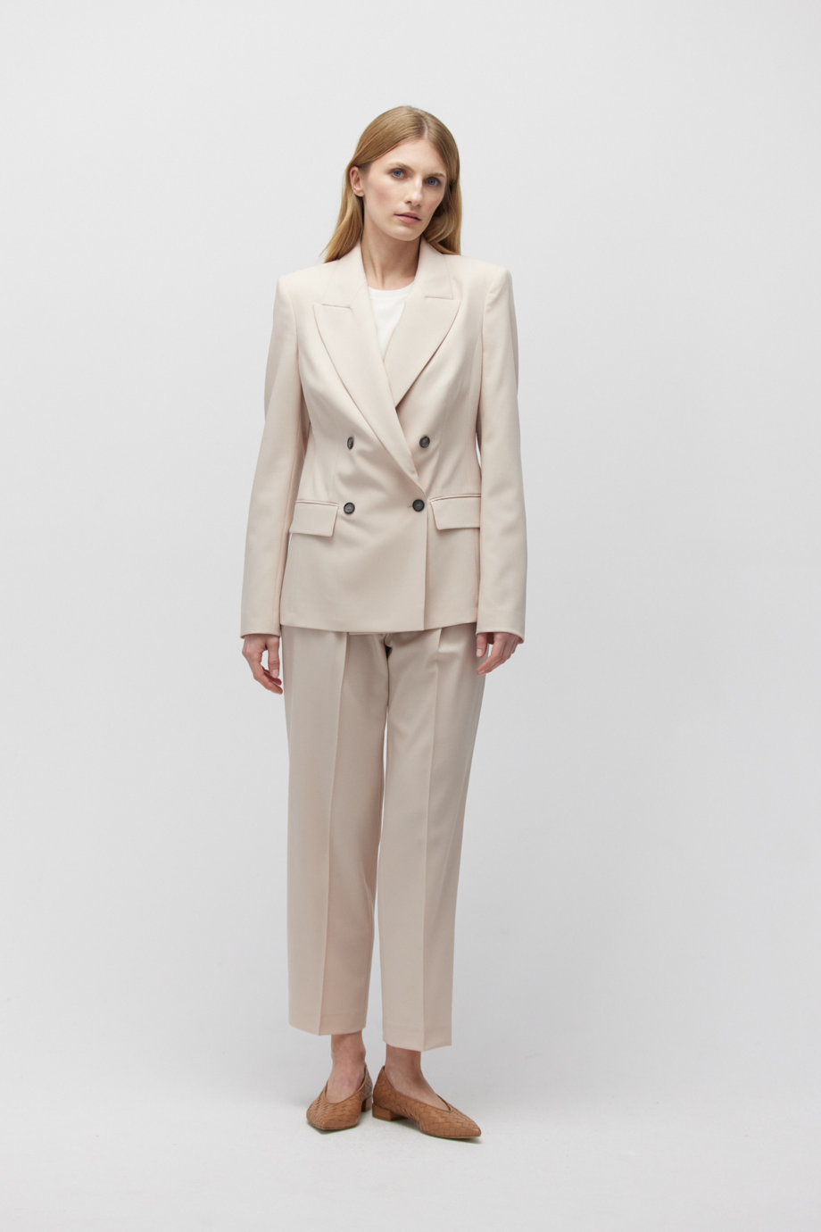 Vlněné kalhoty v nude barvě s záhyby, kapsami, překrytými švy a poutky.