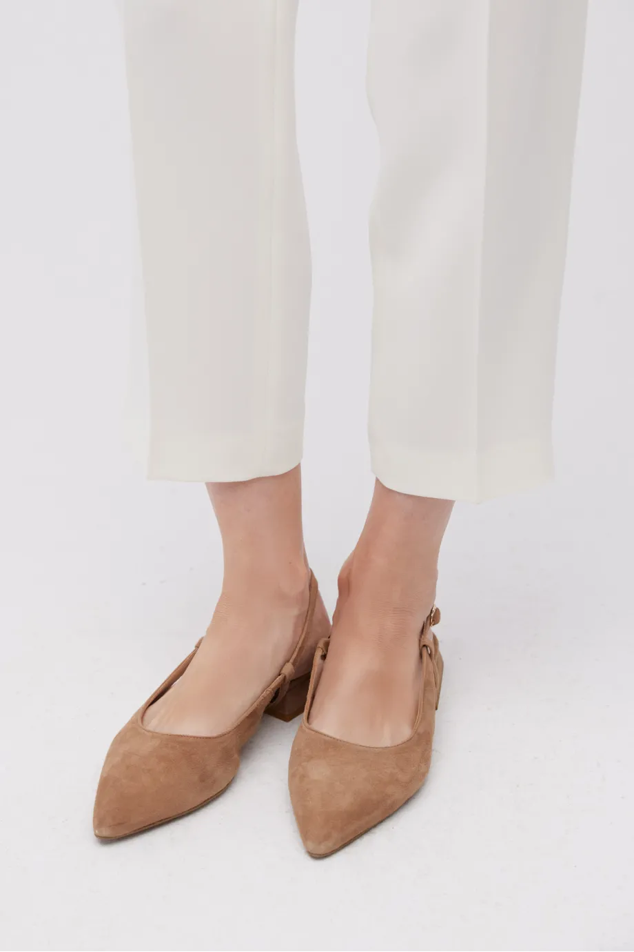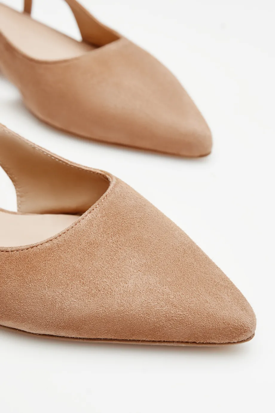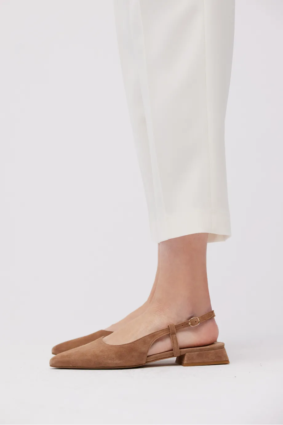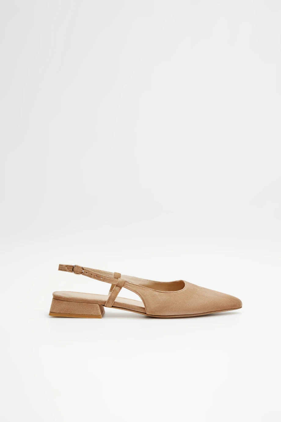 - Slingback boty s odhalenou patou, vyrobené z měkké a pohodlné semišové kůže v odstínu světle béžové.
