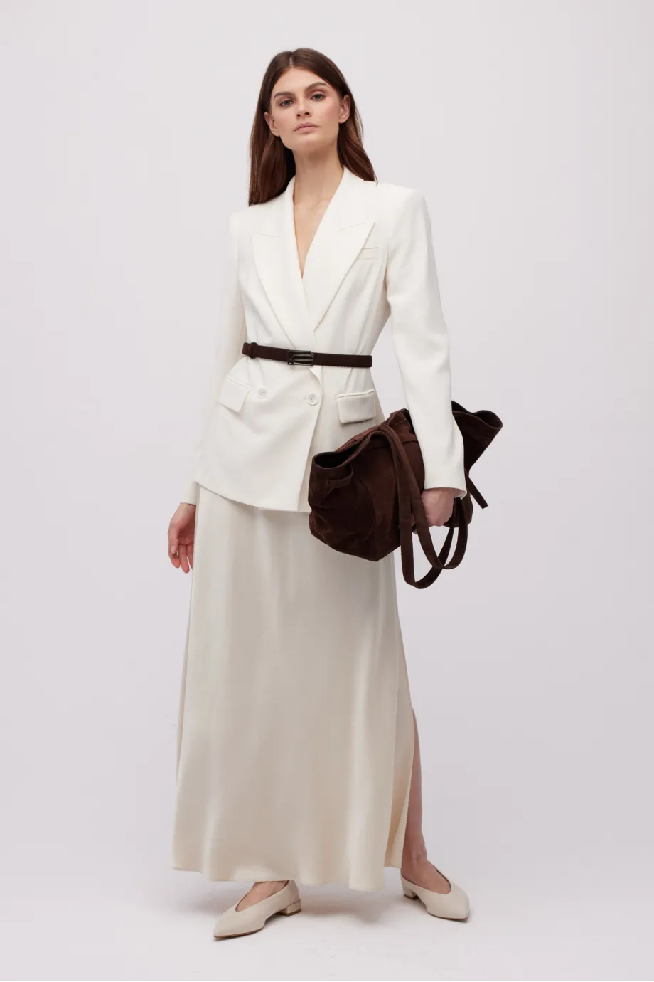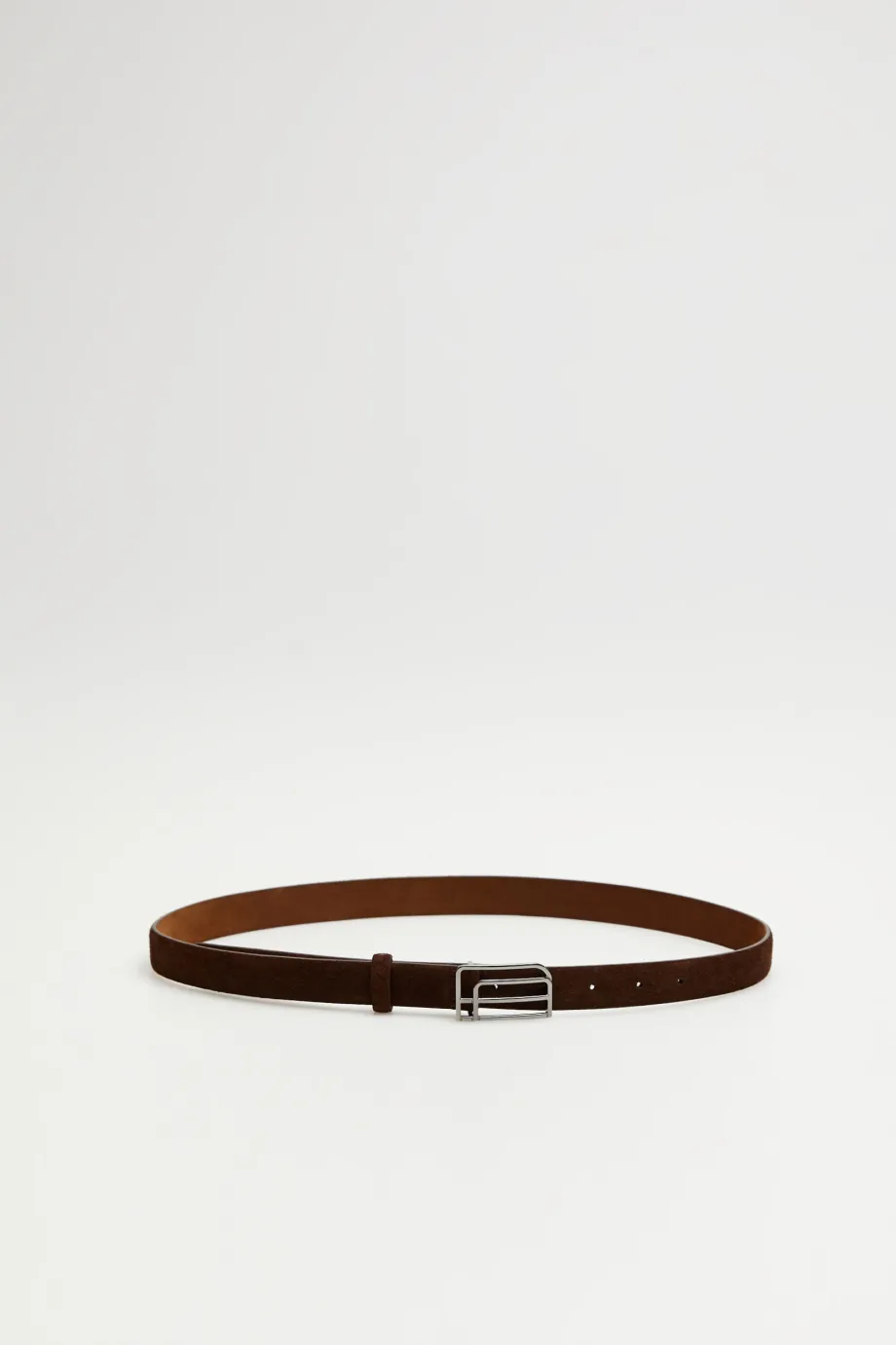 Úzký pásek z hnědé nubukové kůže, zdobený podlouhlou sponou s logem Patrizia Aryton v chladném odstínu.