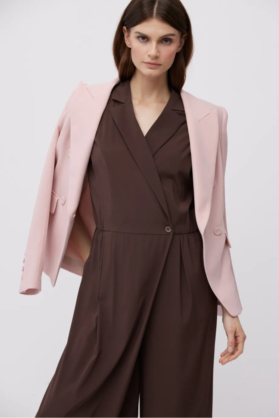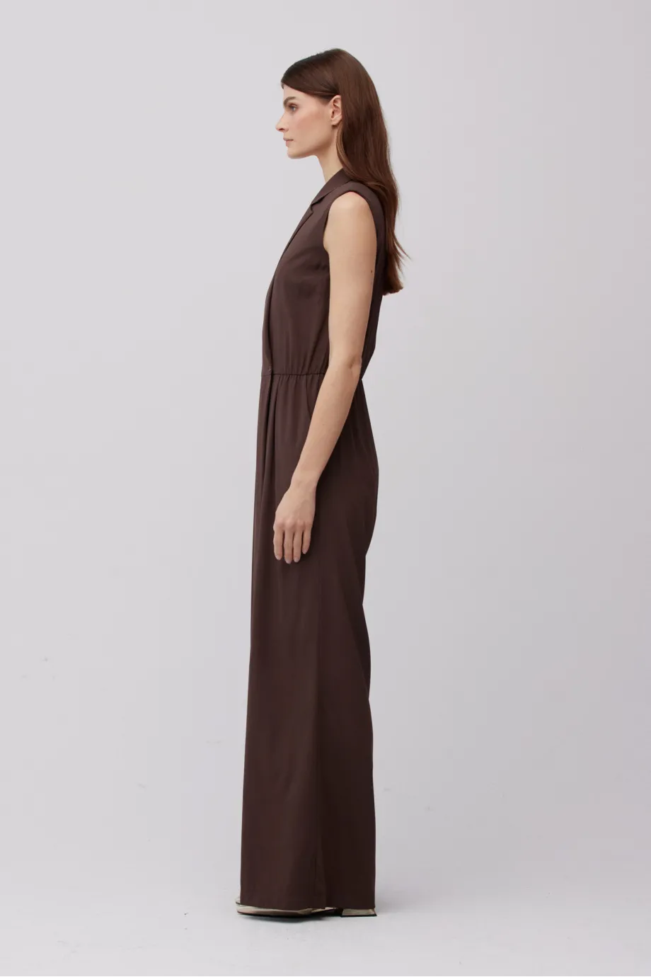 - Hnědý hedvábný overal s výstřihem do V