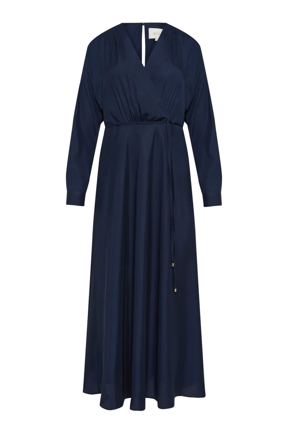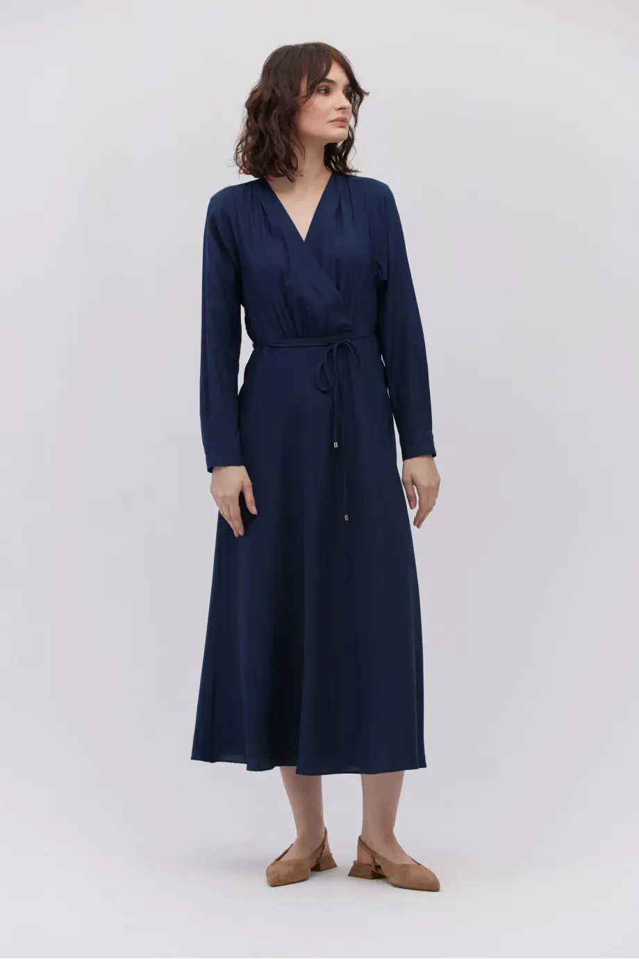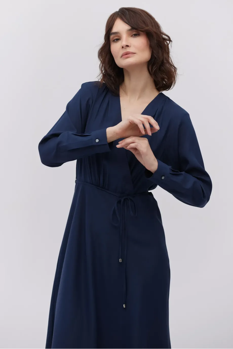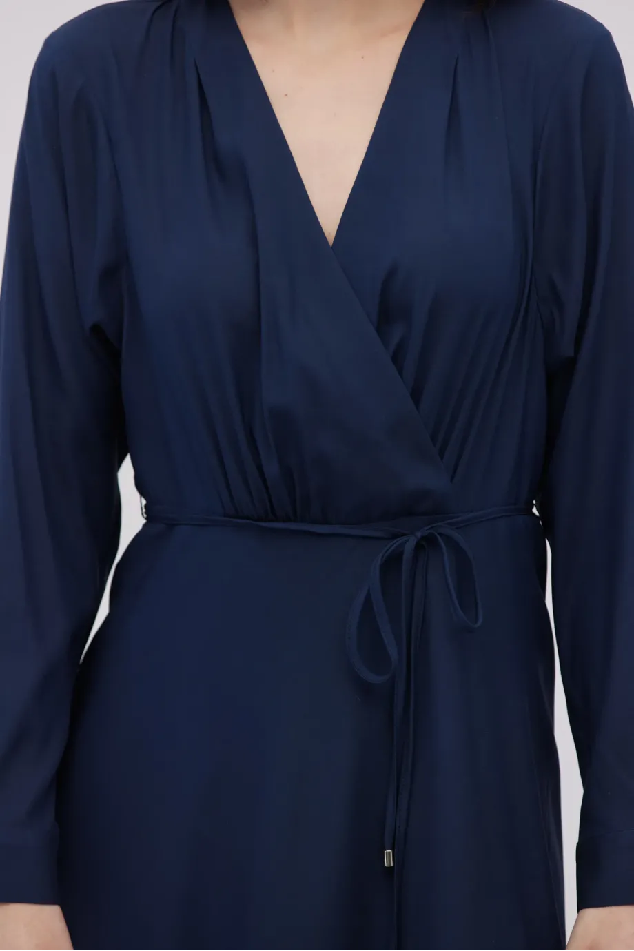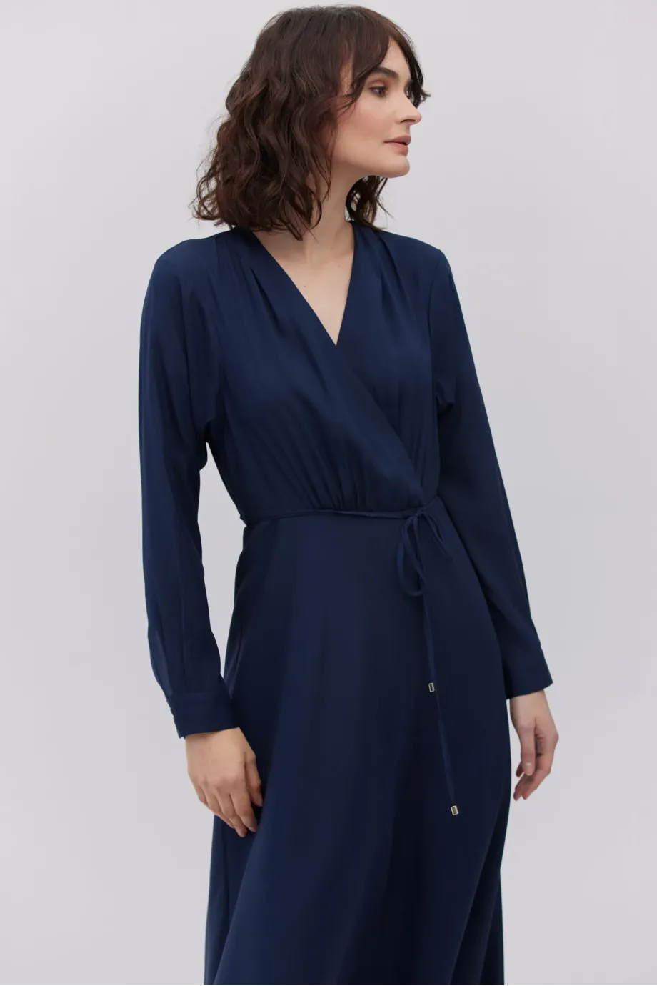 Zavinovací výstřih, dlouhý rukáv, pásek v pase a zapínání na zadní straně.