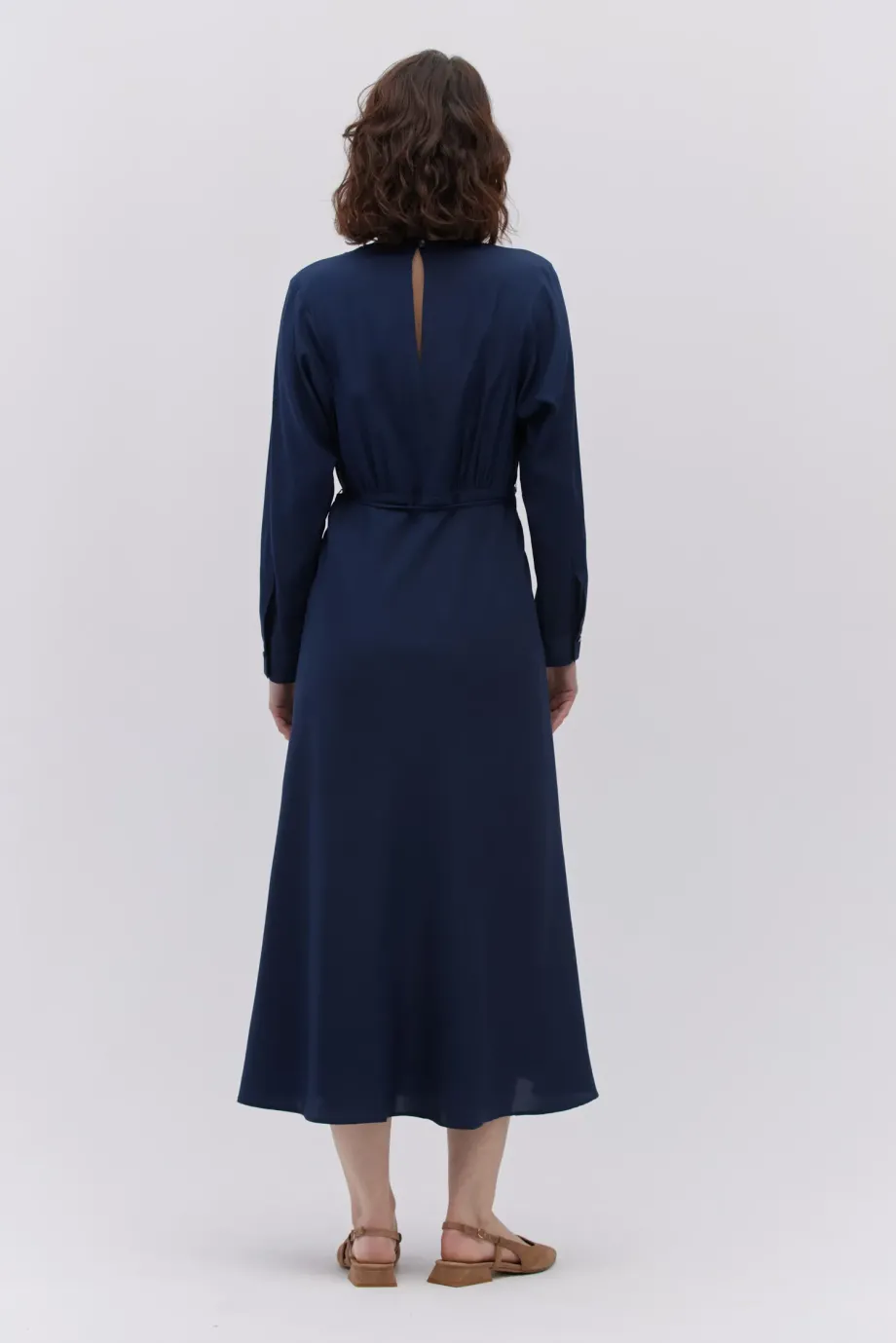 Tmavě modrá hedvábná midi šaty s podšívkou.
