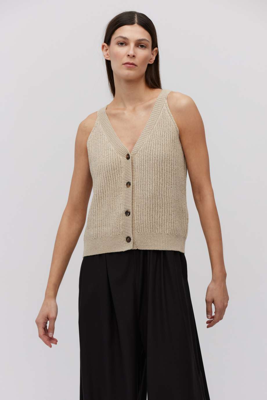 Bežový přiléhavý top na tenkých ramínkách se hedvábím