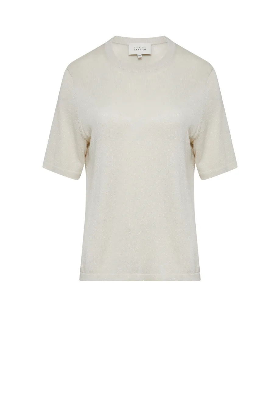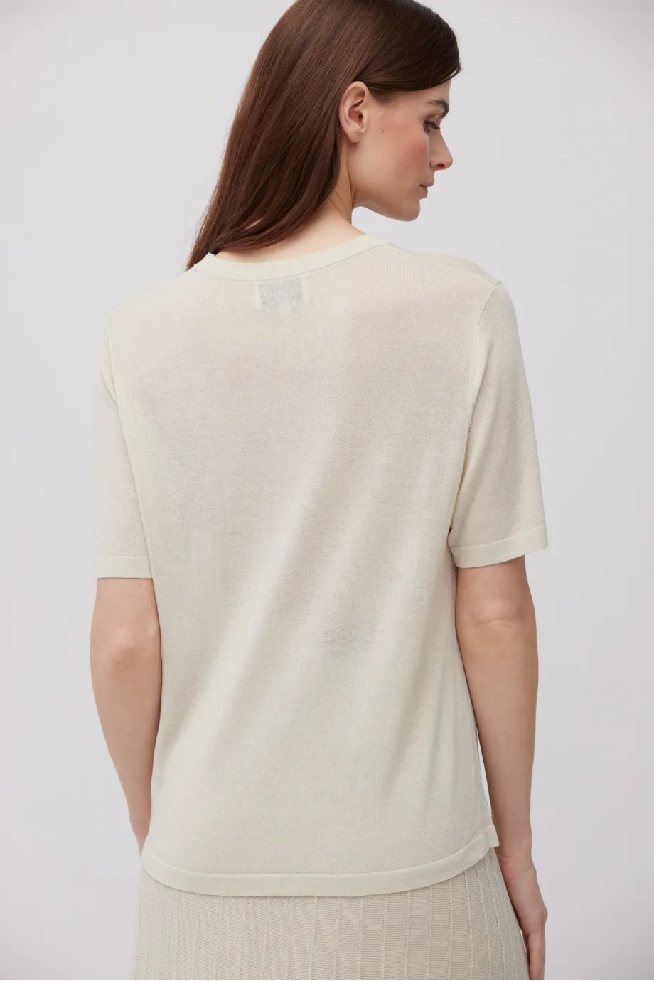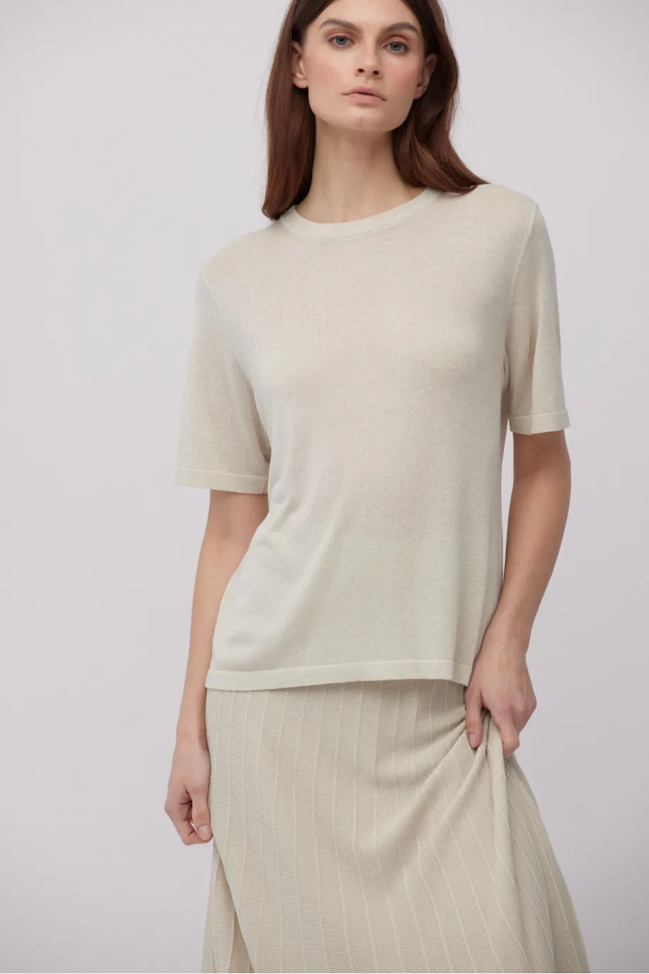 - Béžová halenka se stříbrnou nití, s jednoduchým střihem a krátkým rukávem