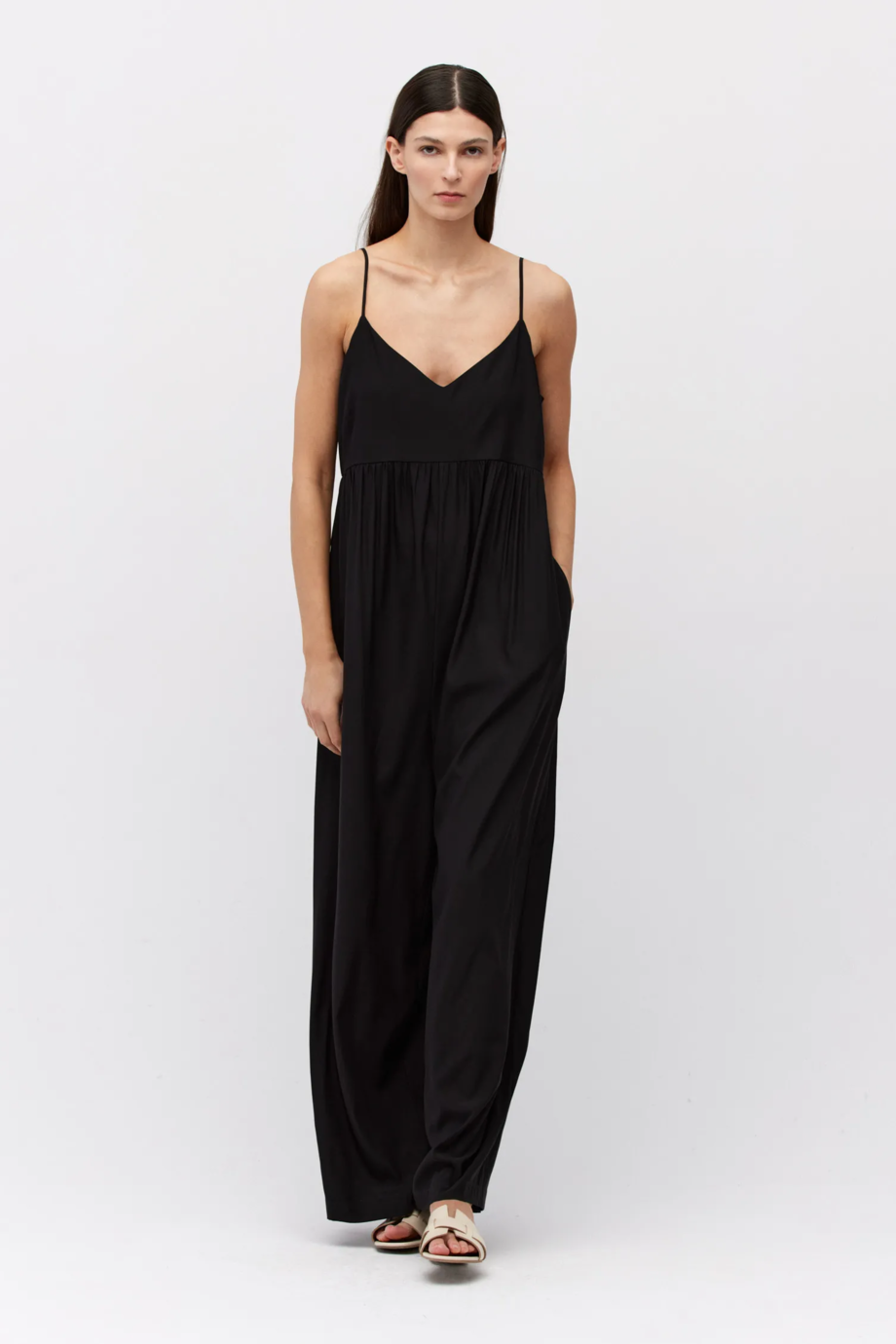 Černý hedvábný overal na tenkých ramínkách