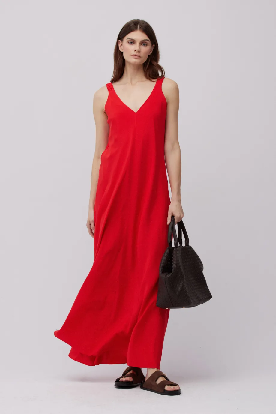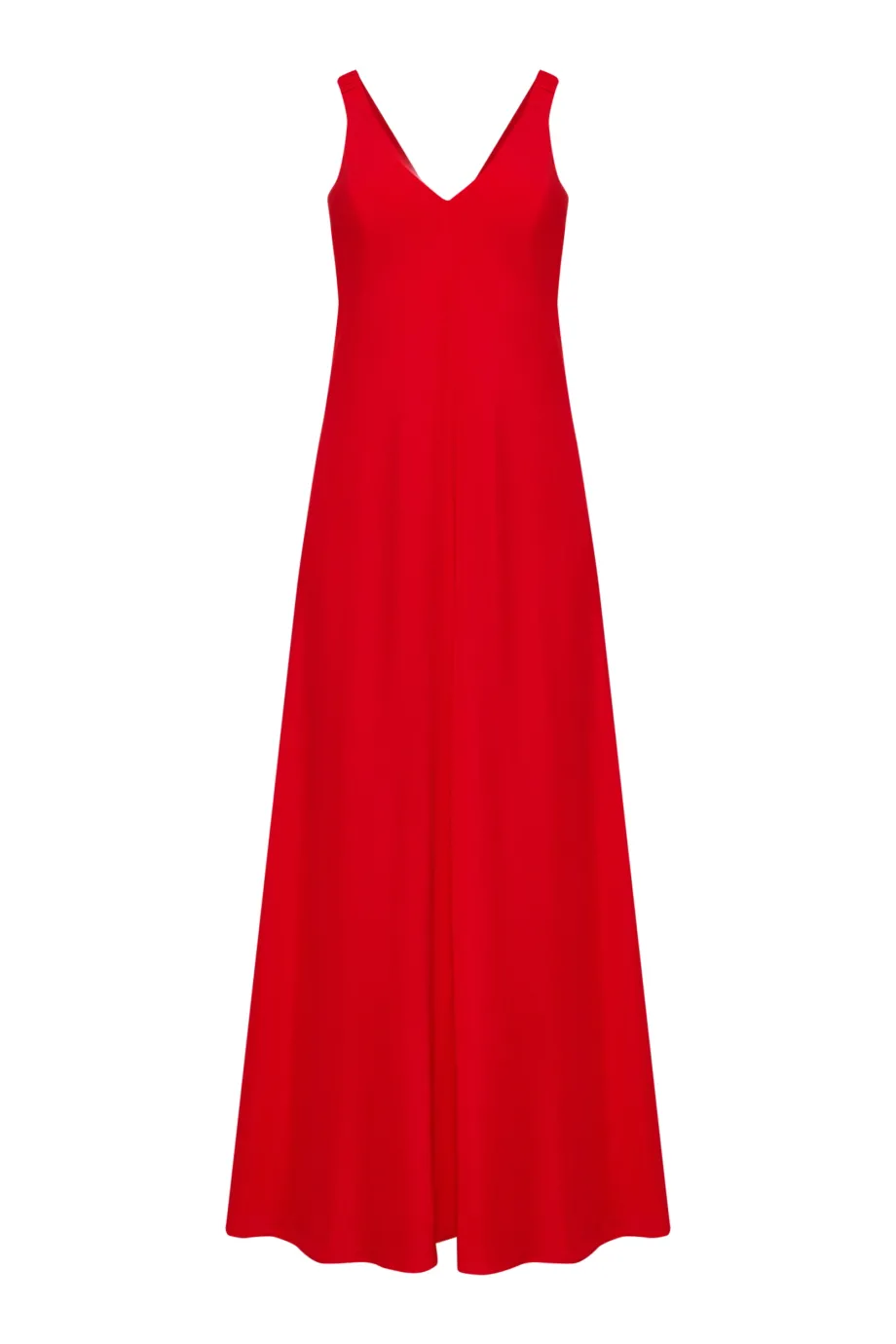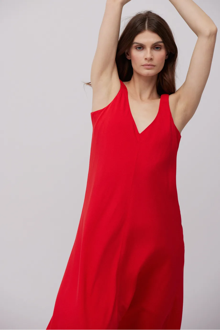 - Červené maxi šaty z hedvábí na ramínkách s výstřihem do V