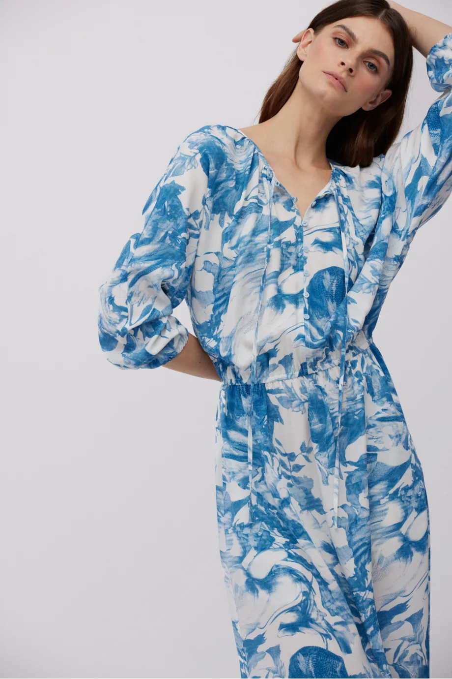 - Hedvábné midi šaty s květinovým vzorem, nadýchanými rukávy, výstřihem na knoflíky a rozparky po stranách