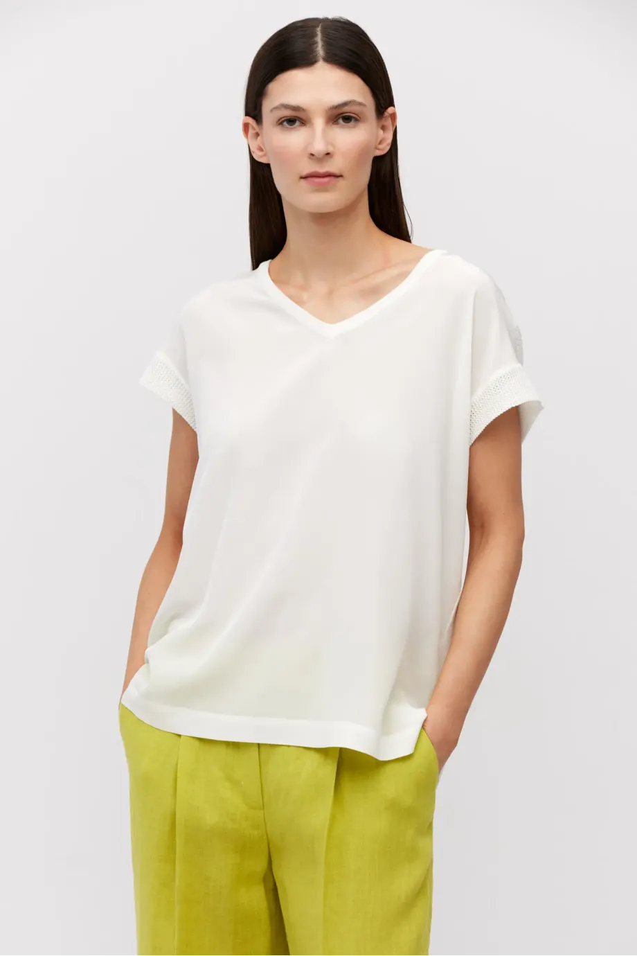 - Bílá blůza s krátkým rukávem a dekoltem do V