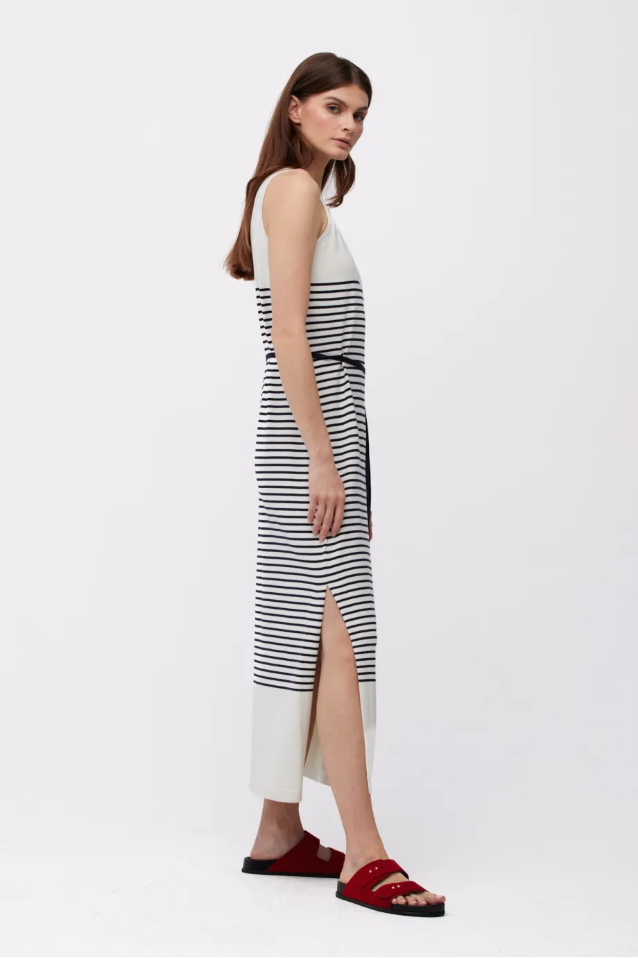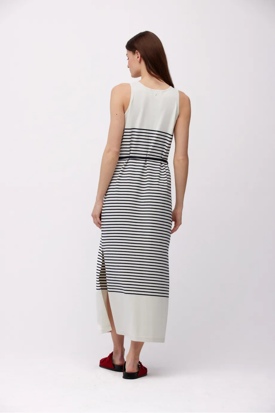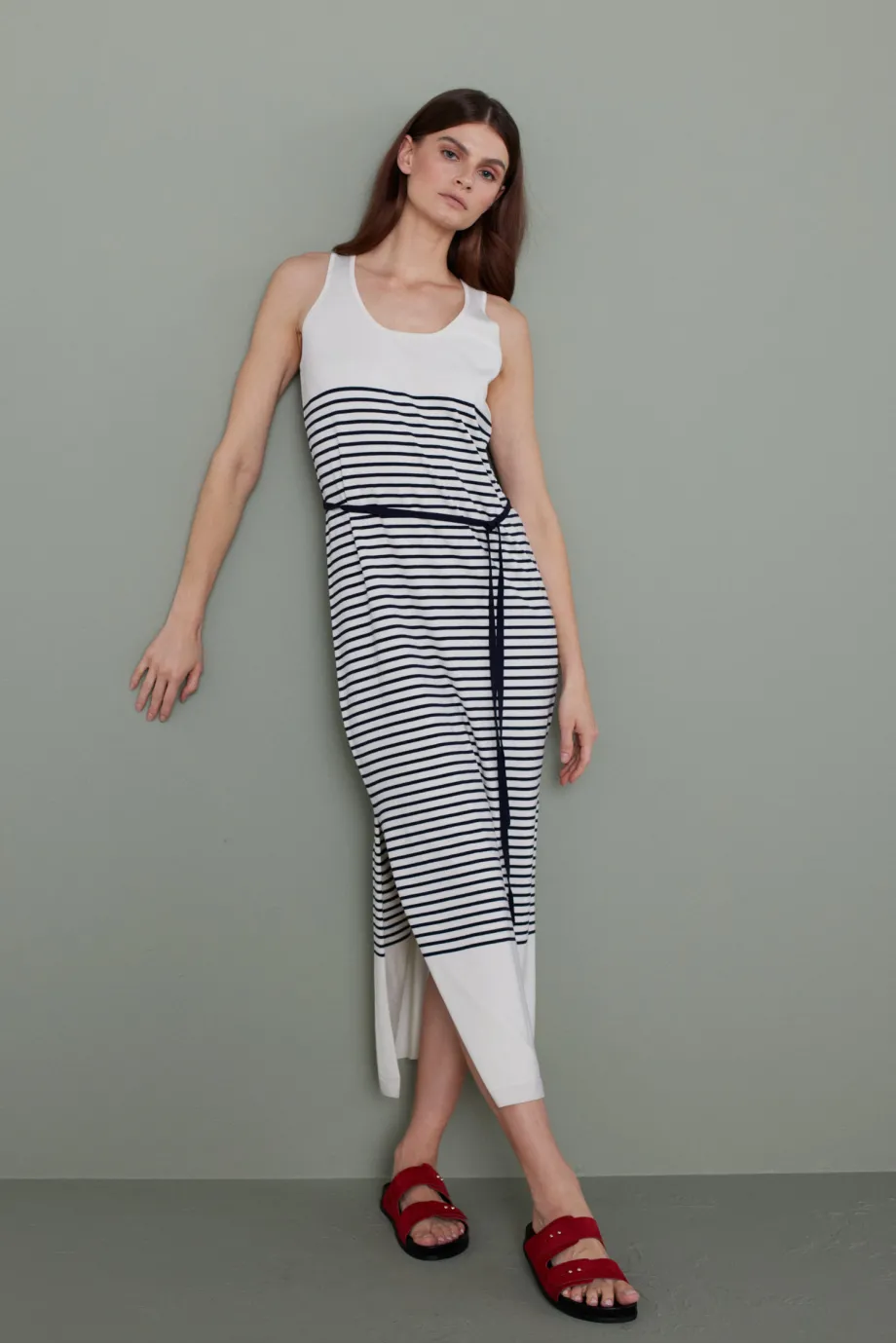 - Přiléhavý střih, kulatý výstřih, pásek v pase a rozparky po stranách.