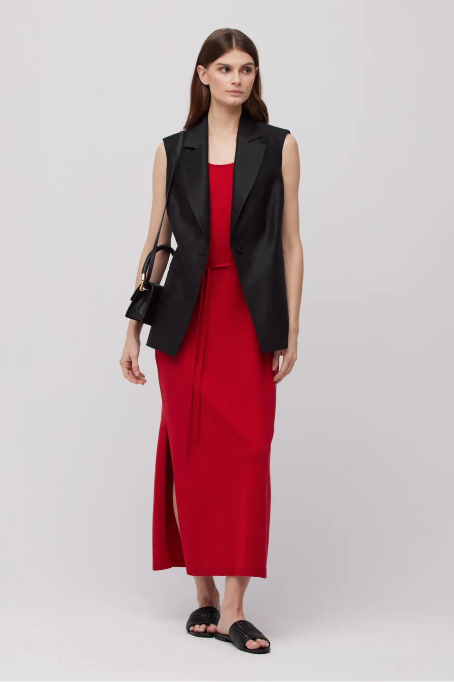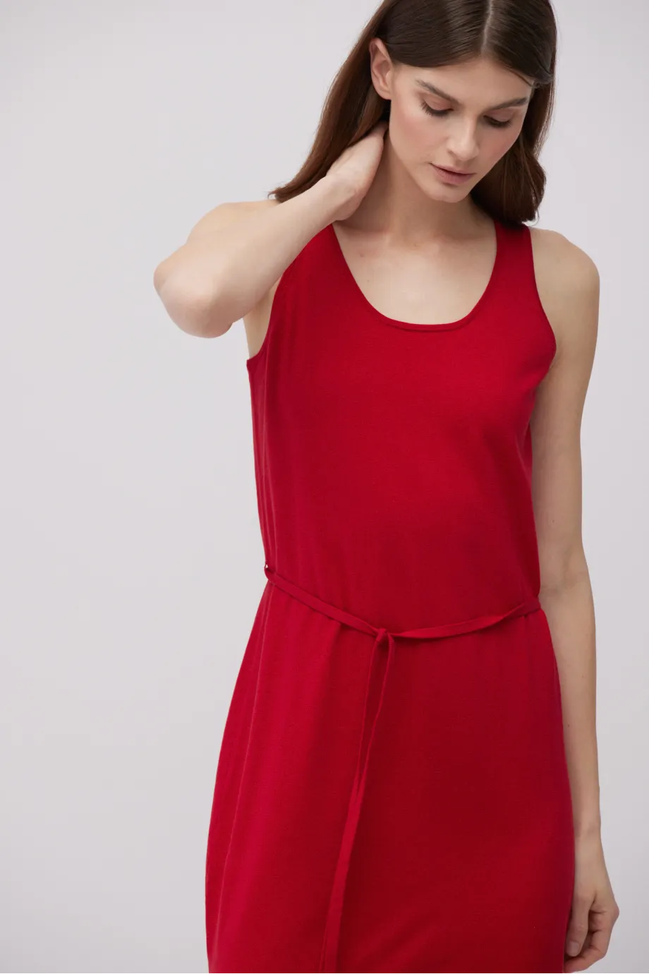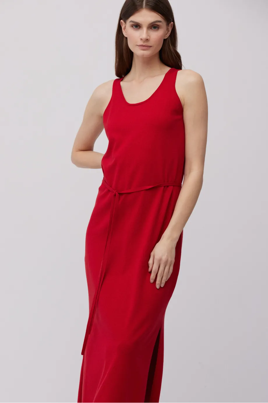 - Přiléhavý střih, kulatý výstřih, pásek v pase a rozparky po stranách