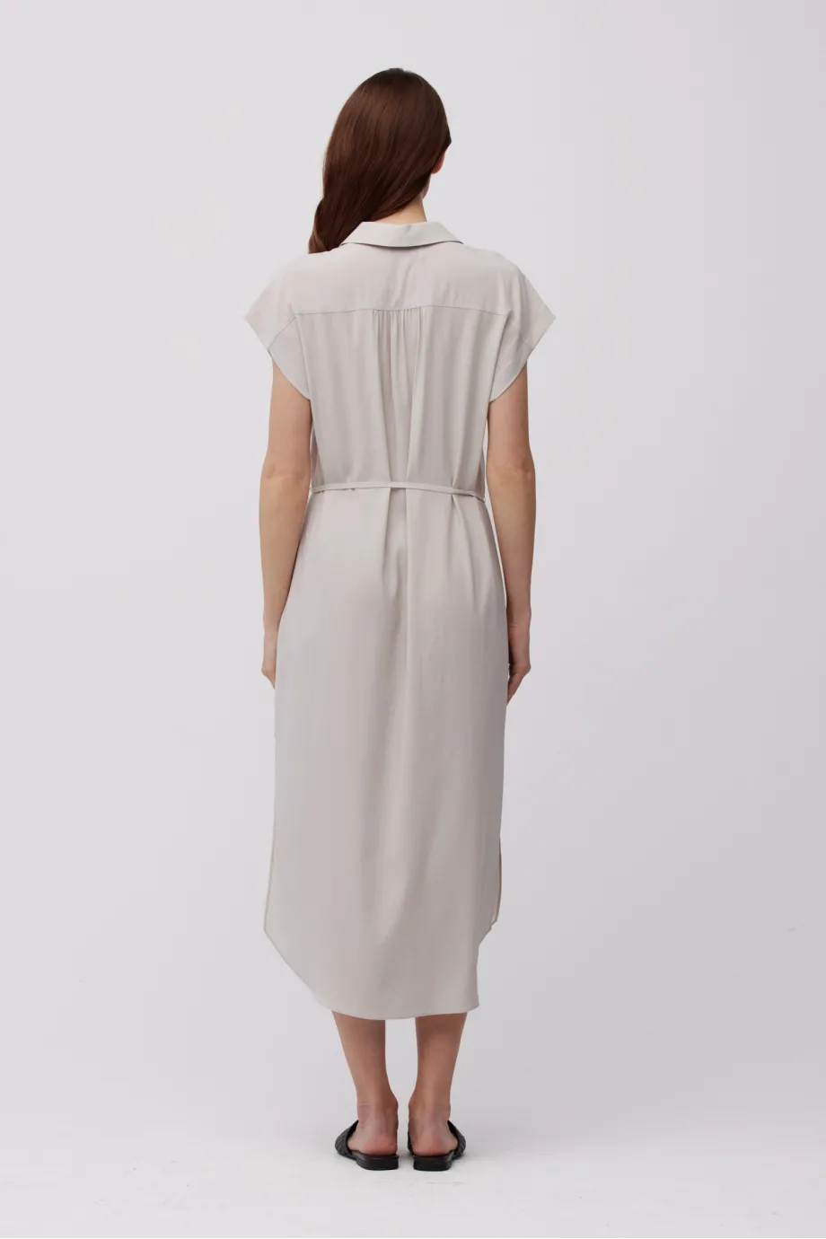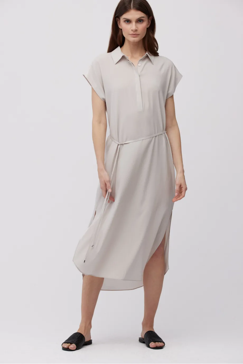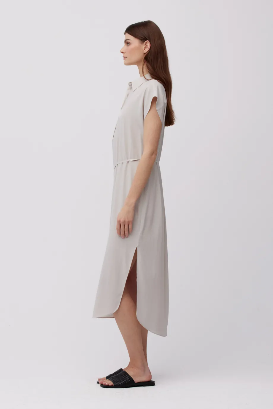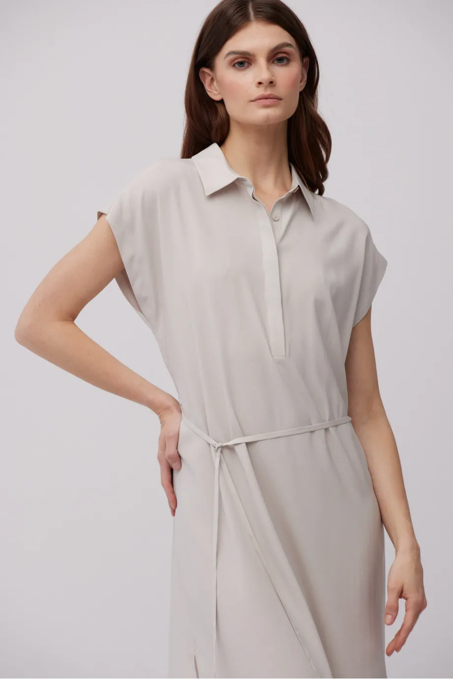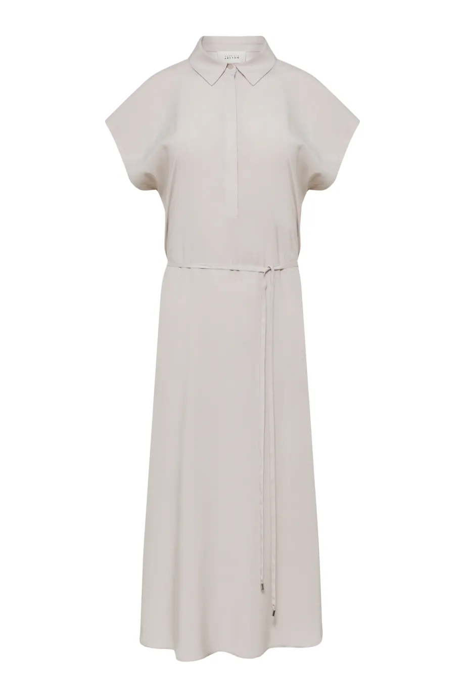 - Béžová midi košilová šaty z hedvábí, dostupná ve dvou barvách