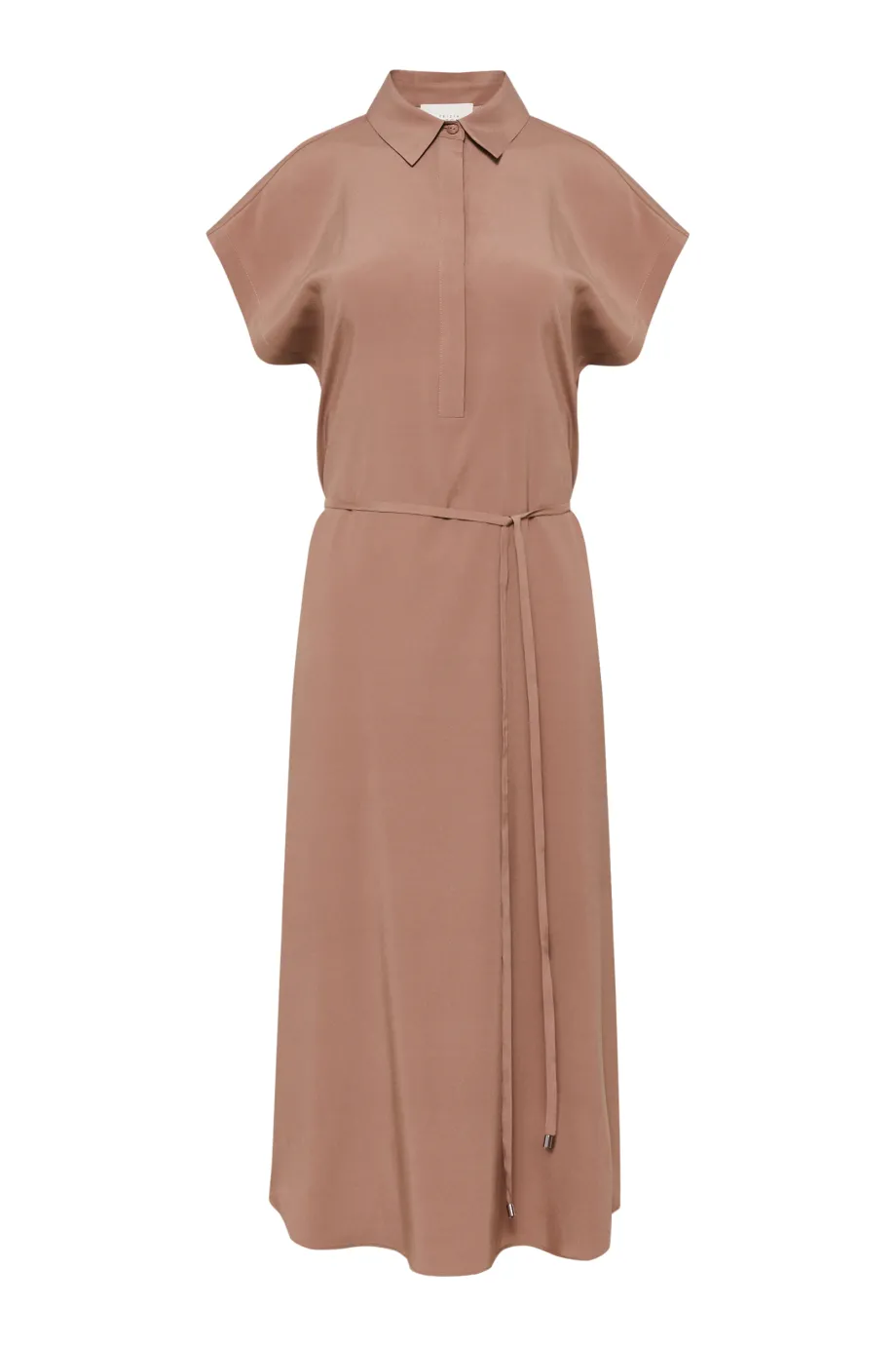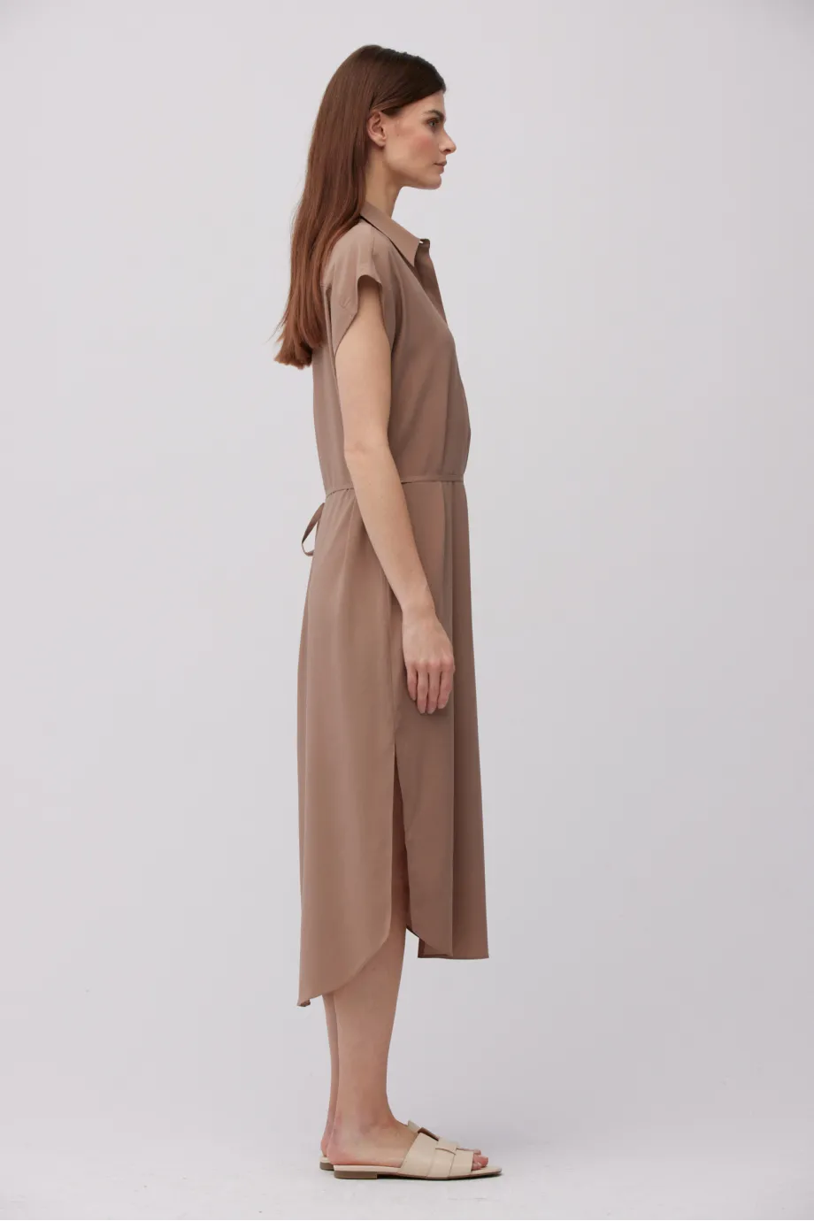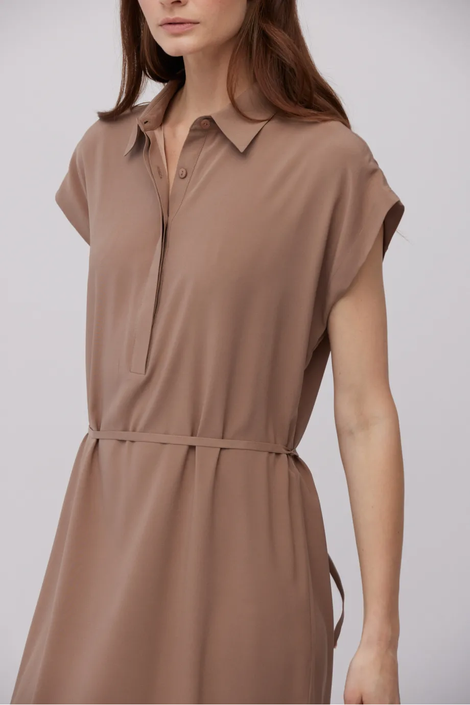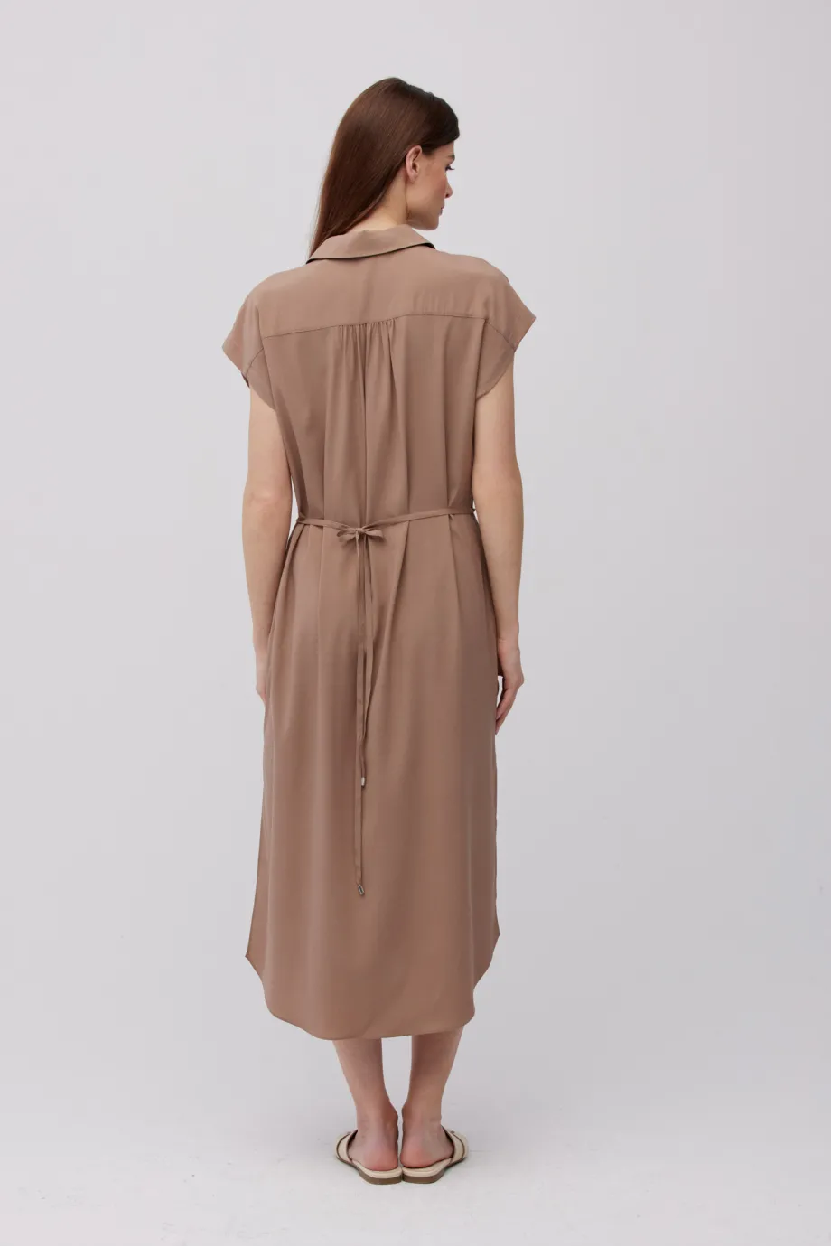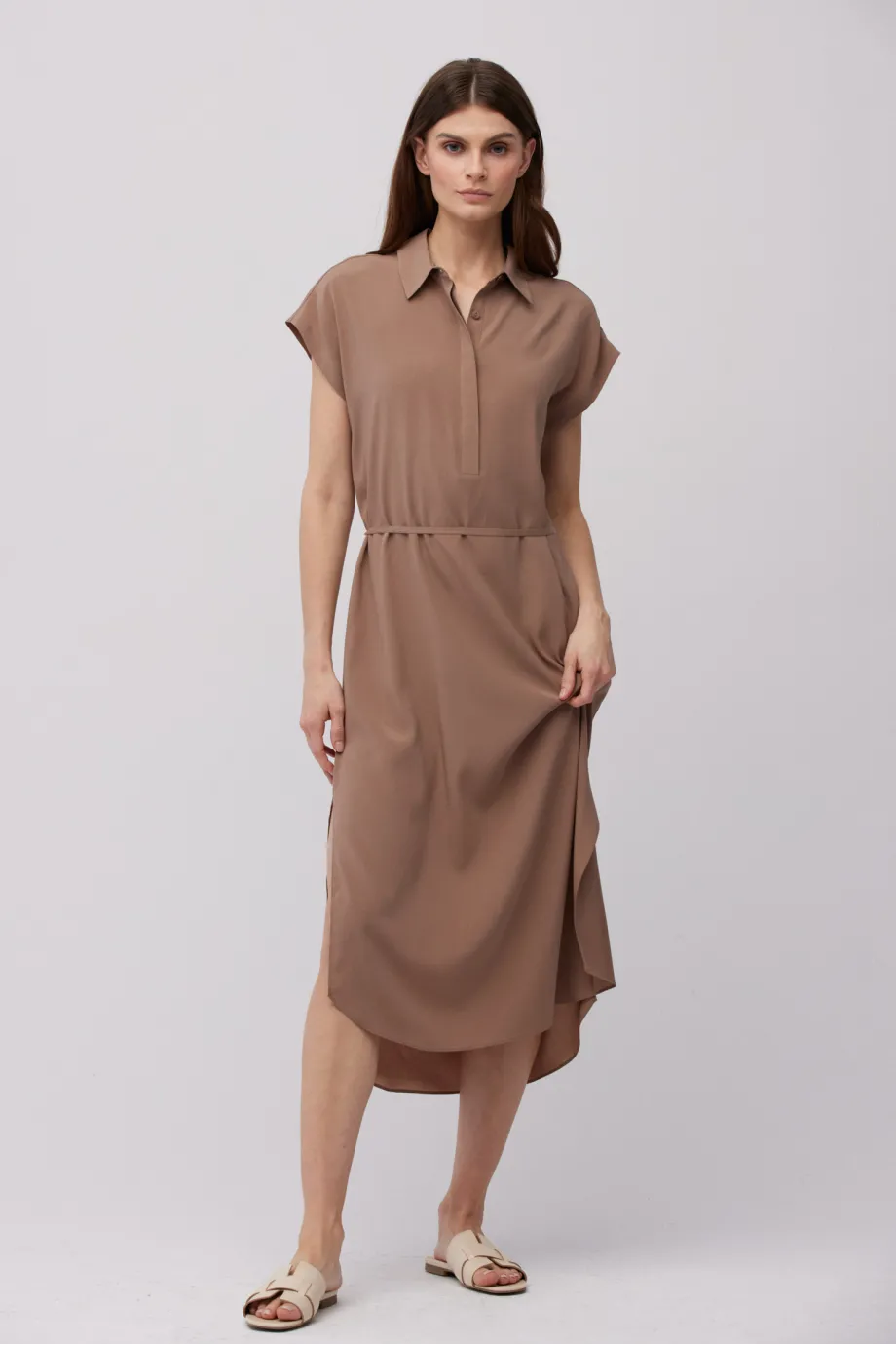 - Hnědá midi košilová šaty ze hedvábí, dostupná ve dvou barvách