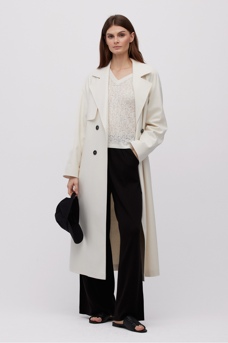 Modelka na fotografii měří 177 cm a nosí velikost 36/38.