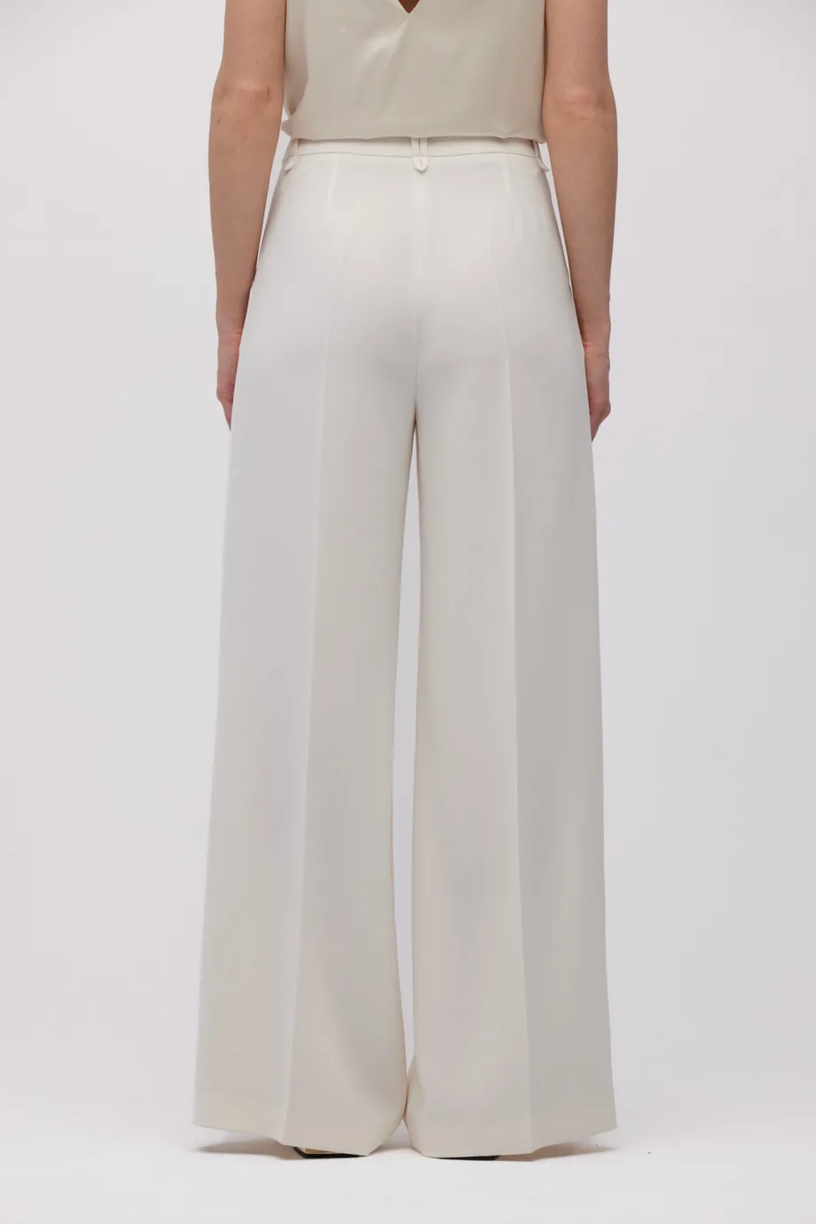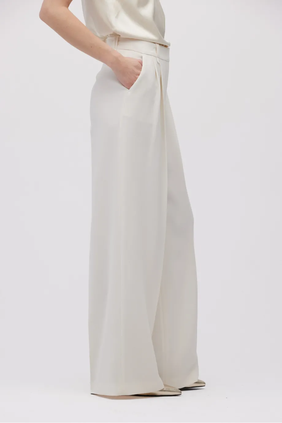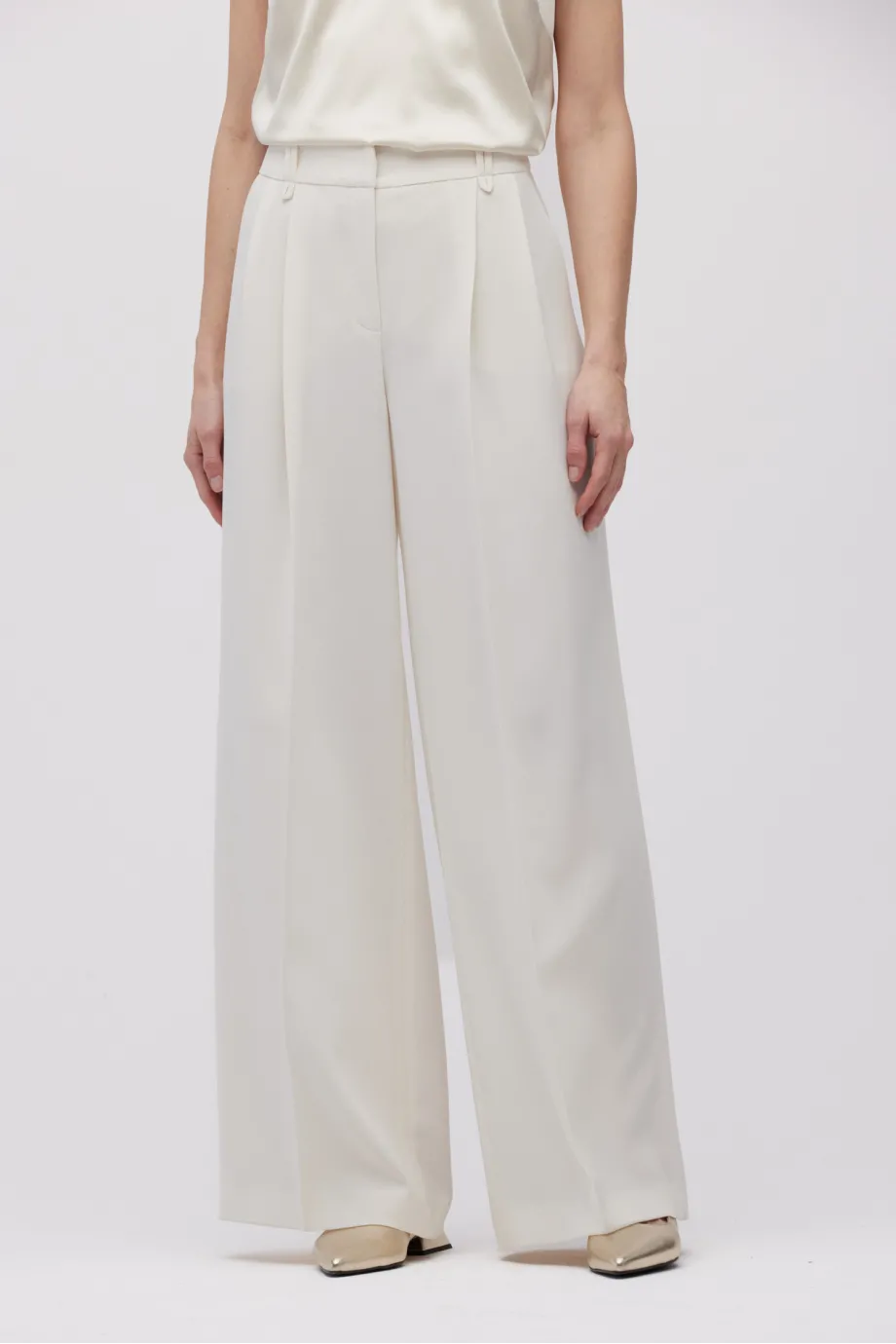 - Kalhoty s širokým nohavicemi, vyrobené z látky v odstínu smetanové bílé.