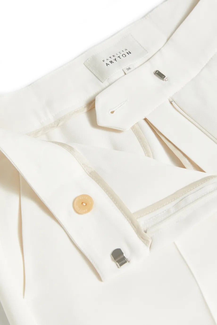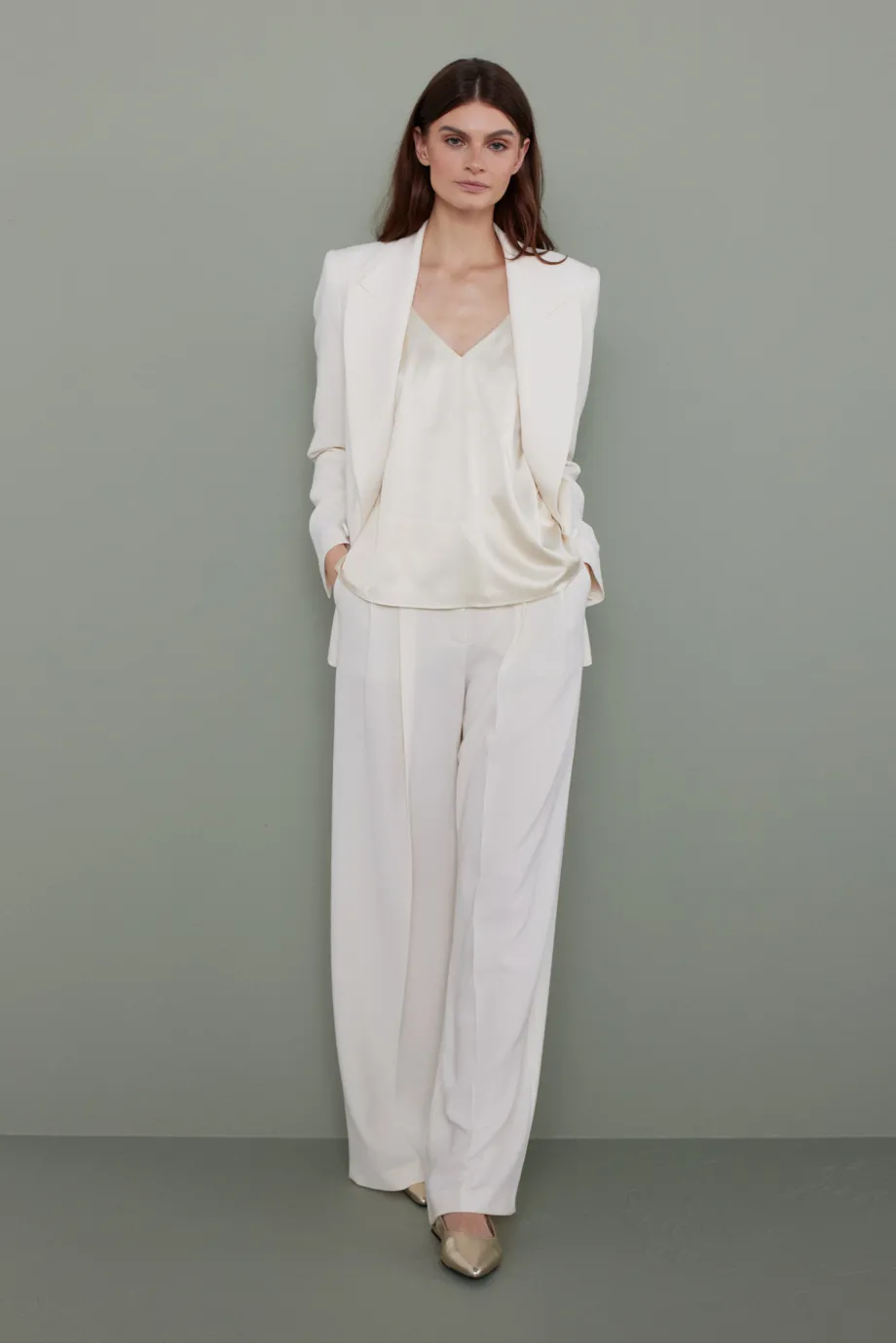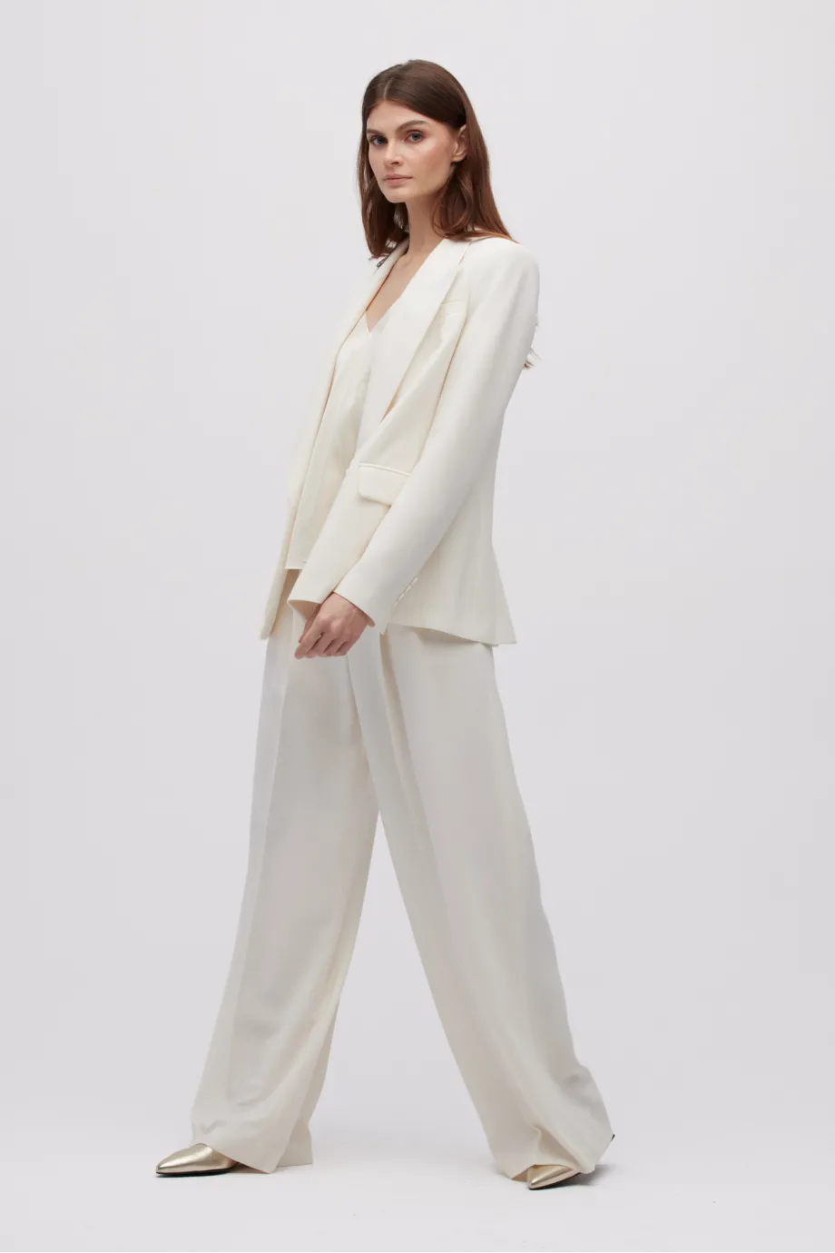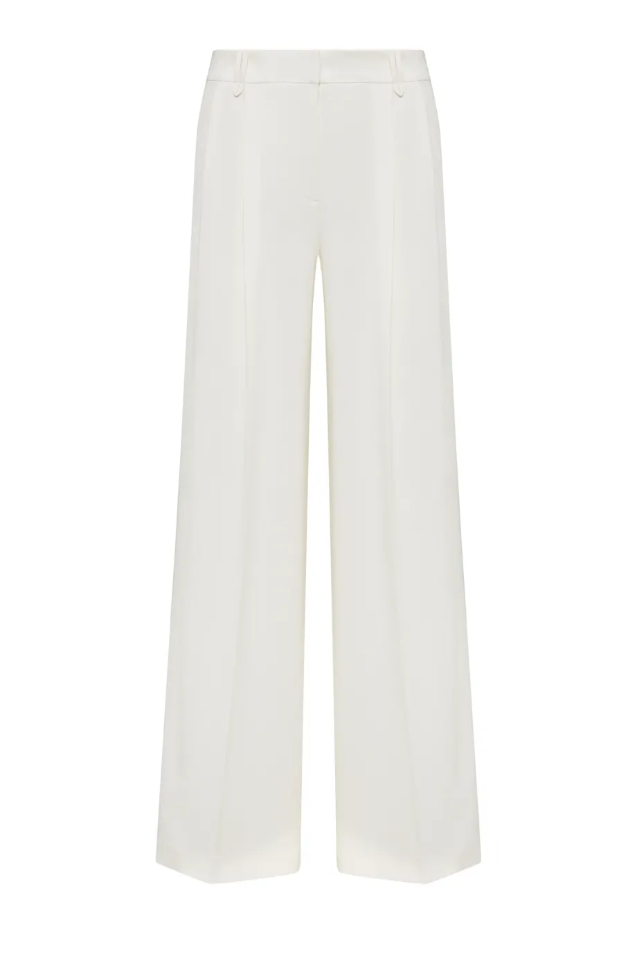 - Kalhoty s širokým nohavicemi, vyrobené z látky v odstínu smetanové bílé.