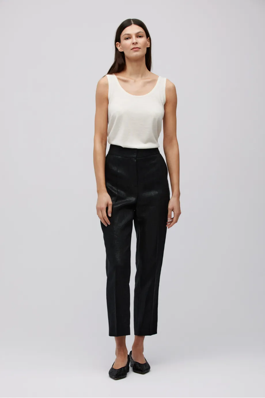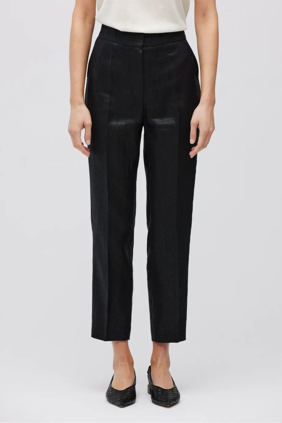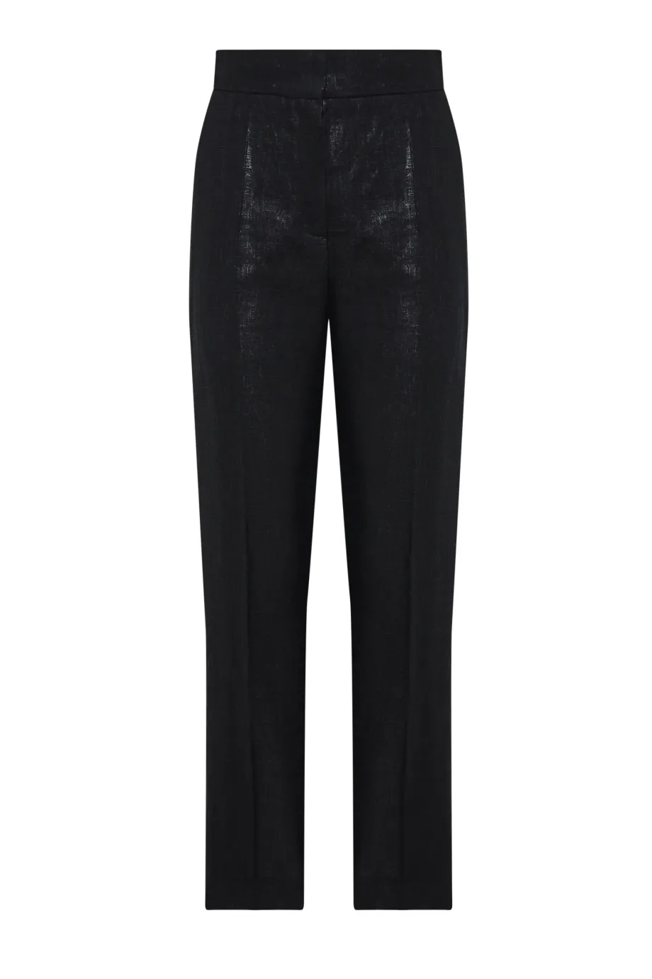 - Černé kalhoty z potaženého lnu s záhyby pro volnost v oblasti boků