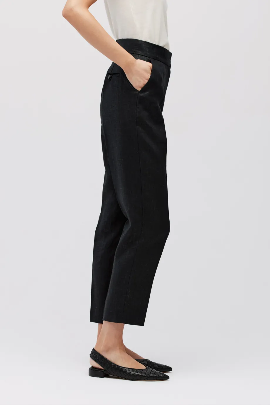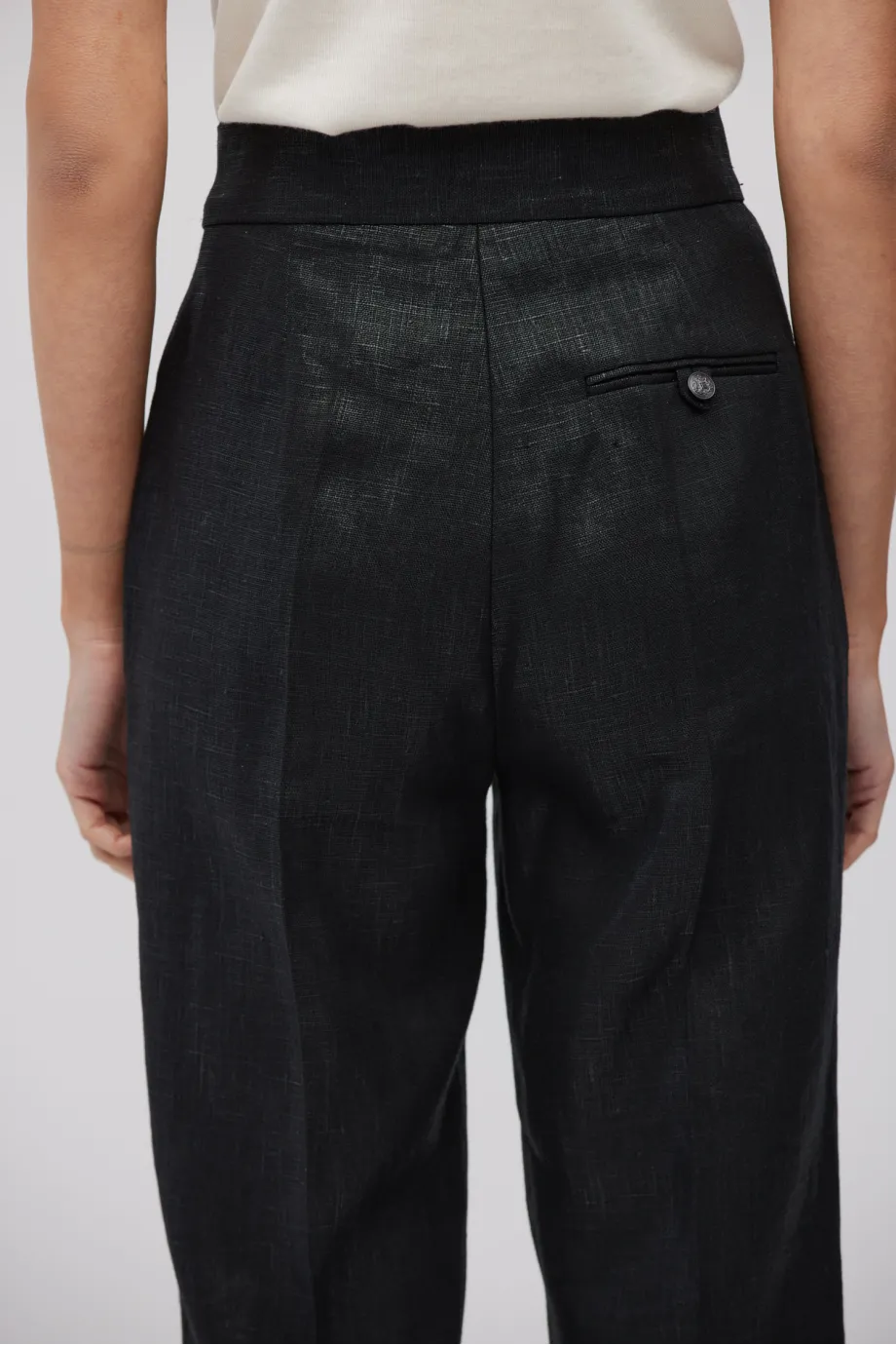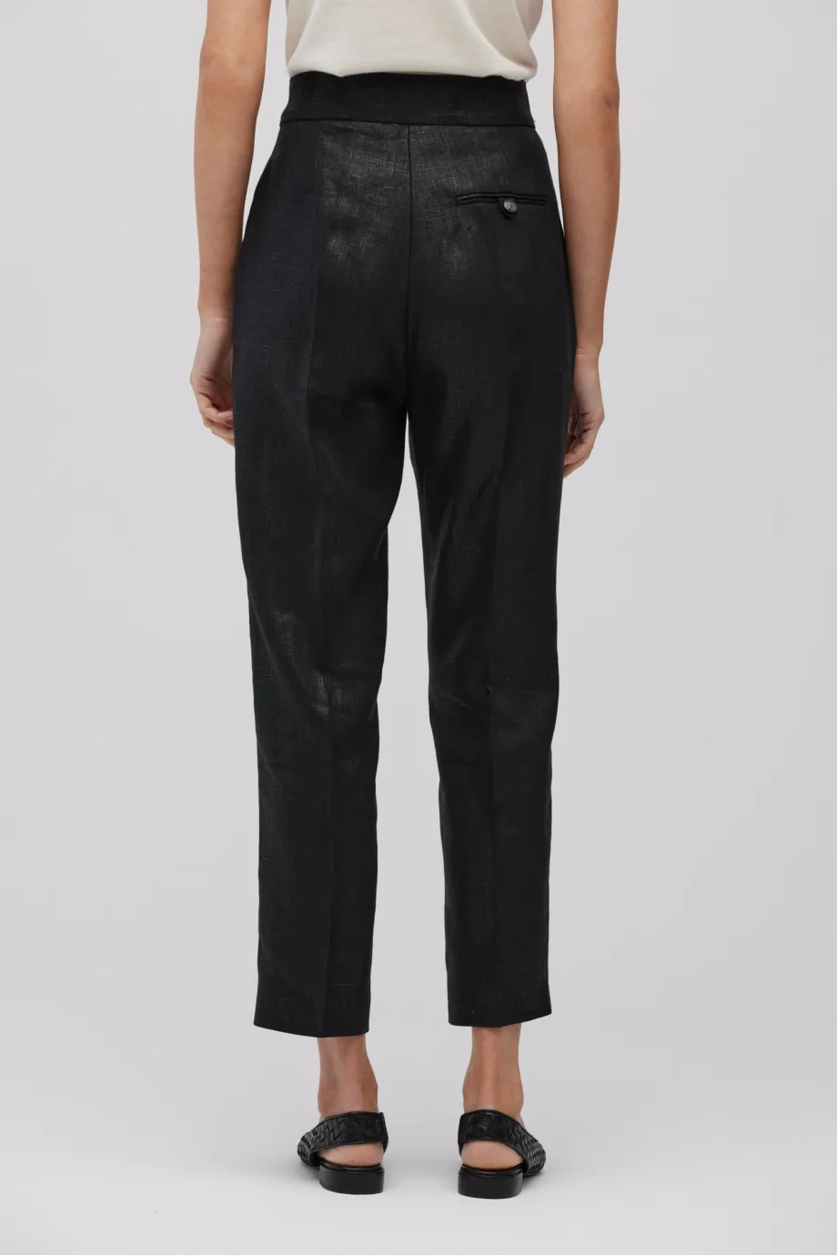 - Černé kalhoty z potaženého lnu s záhyby pro volnost v oblasti boků
