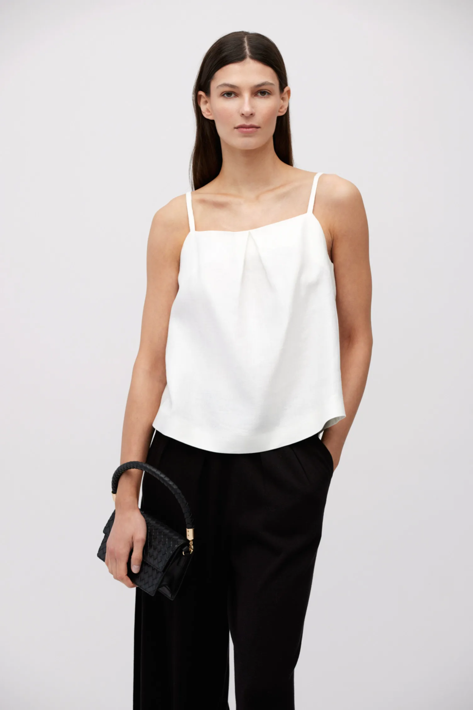 Bílý top z lnu. Volný, trapezový střih. Vpředu záhyb, vzadu překládaný design. Tenké ramínka.