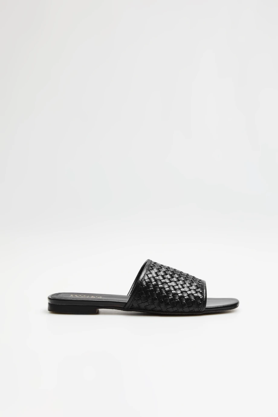 - Černé pantofle na ploché podrážce se širokým páskem z pletené kůže.