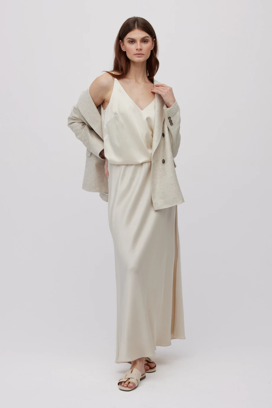 - Dlouhá sukně v odstínu teplé béžové, volného střihu a elastického pasu.