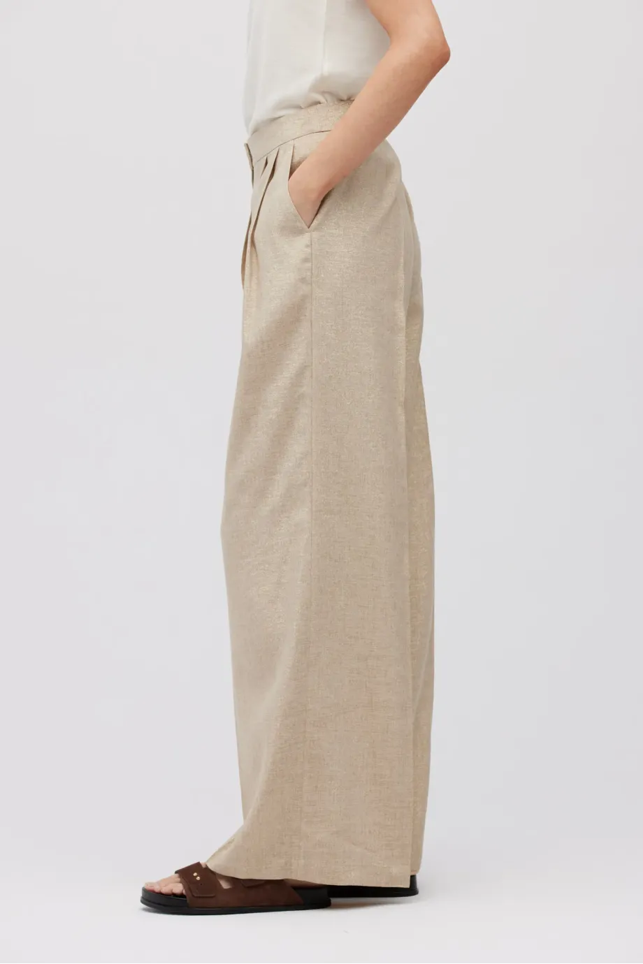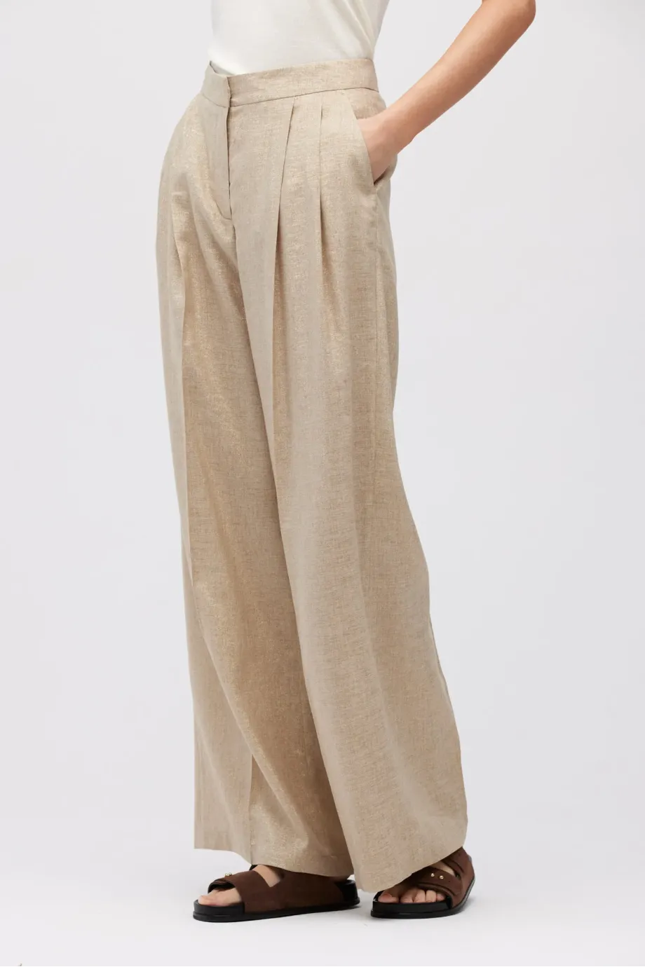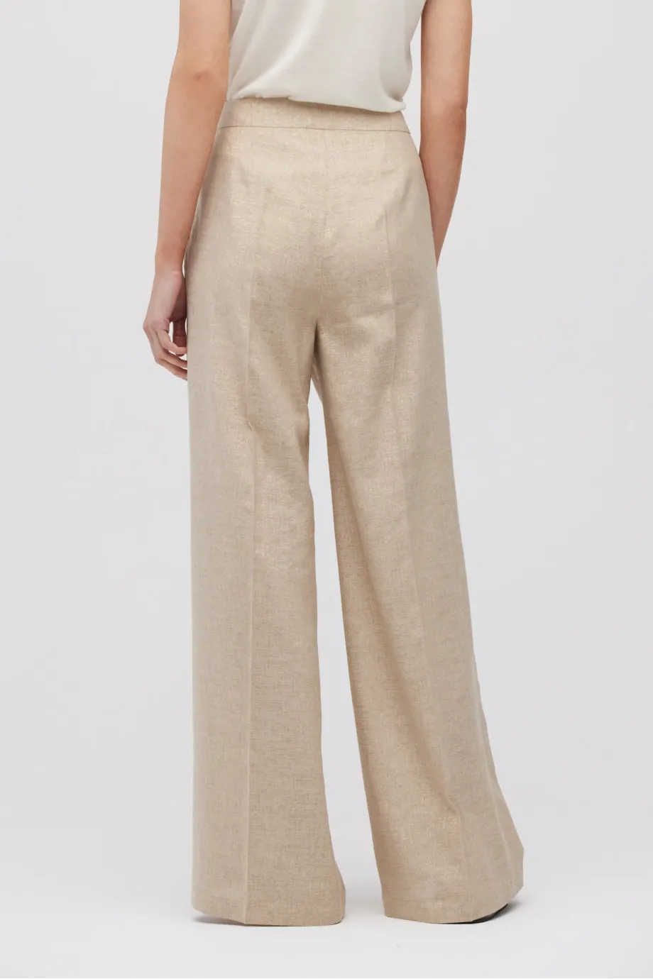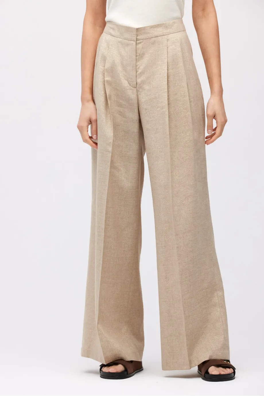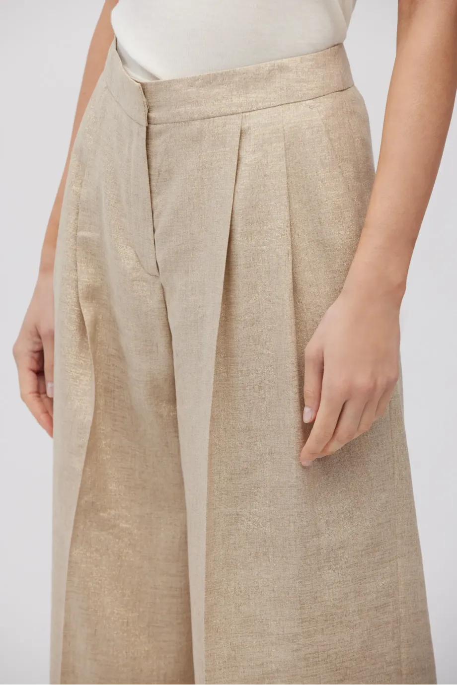 - Široké lněné kalhoty se zlatou nití, s záhyby