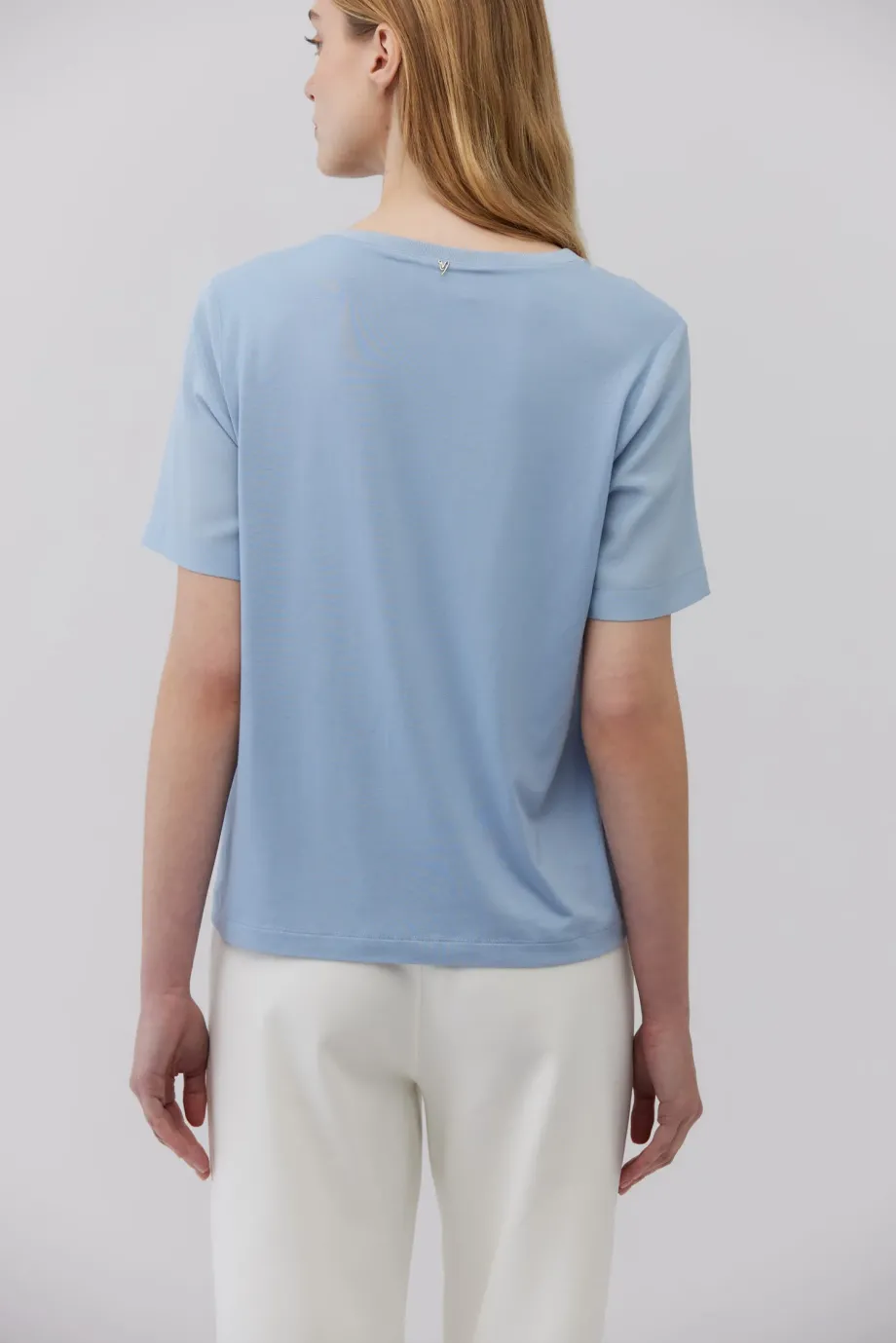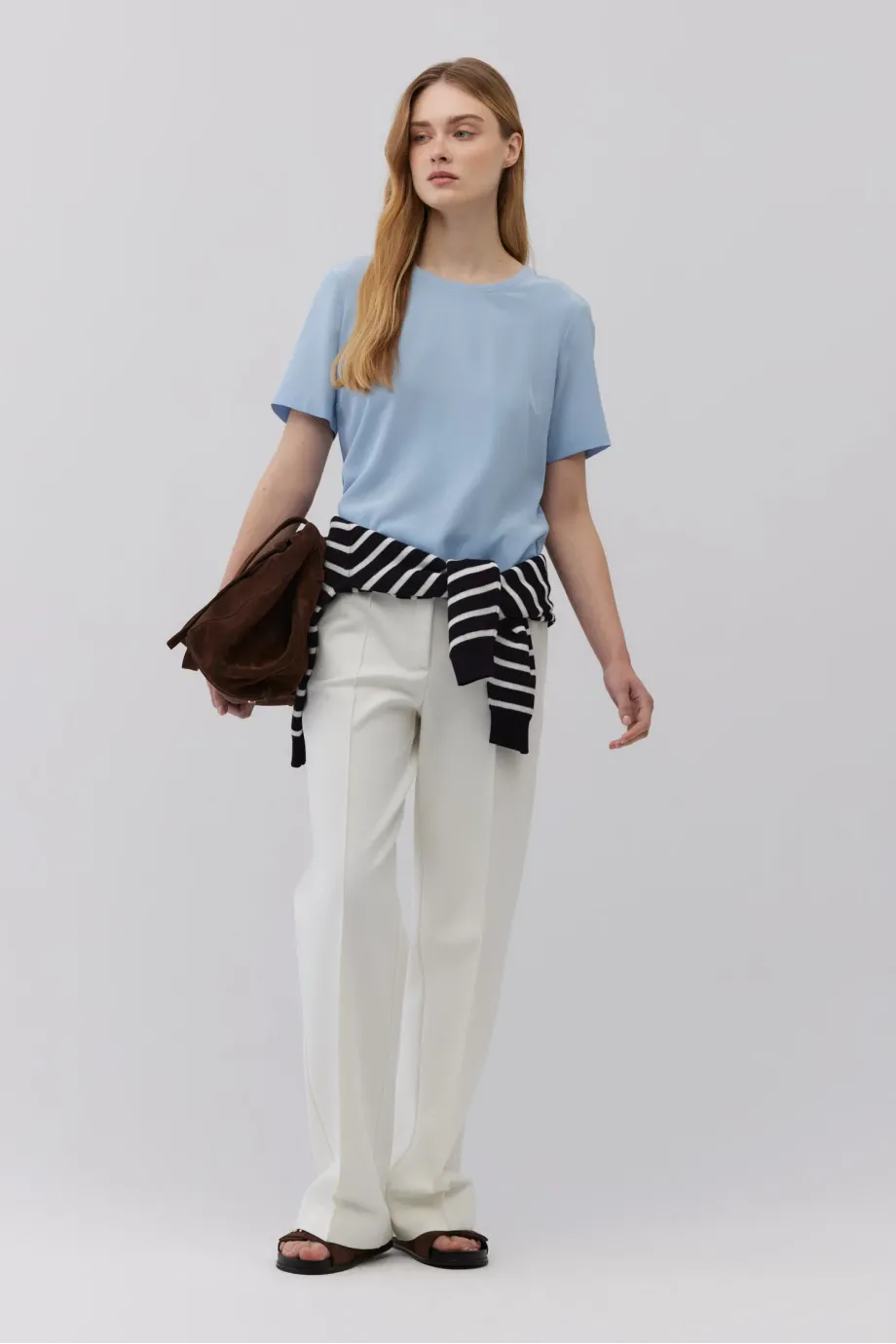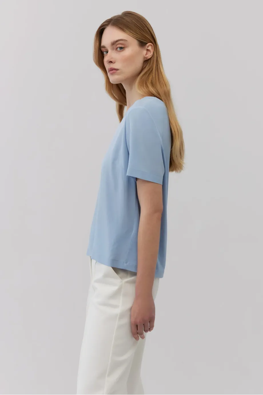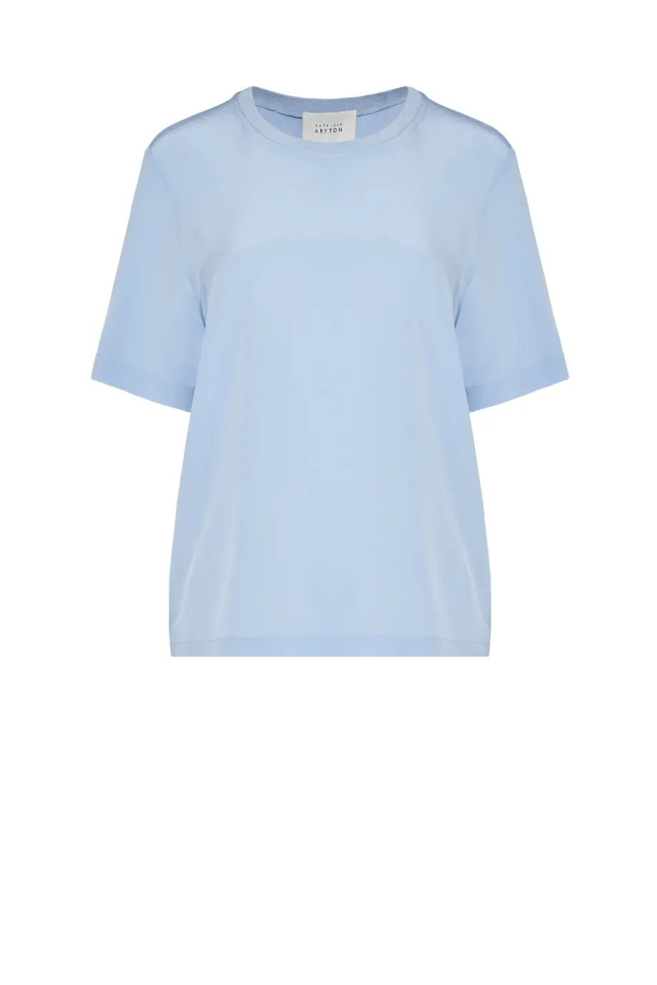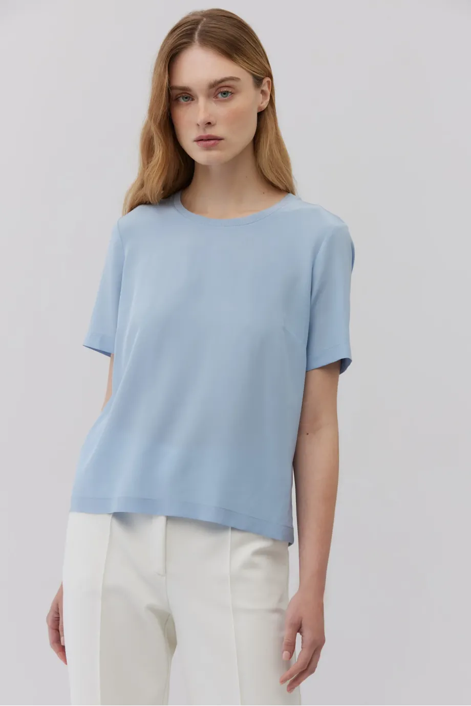Halenka s hedvábným předním dílem a pleteným zadním dílem. Jednoduchý, mírně nadrozměrný střih. Kulatý výstřih. Krátké rukávy.