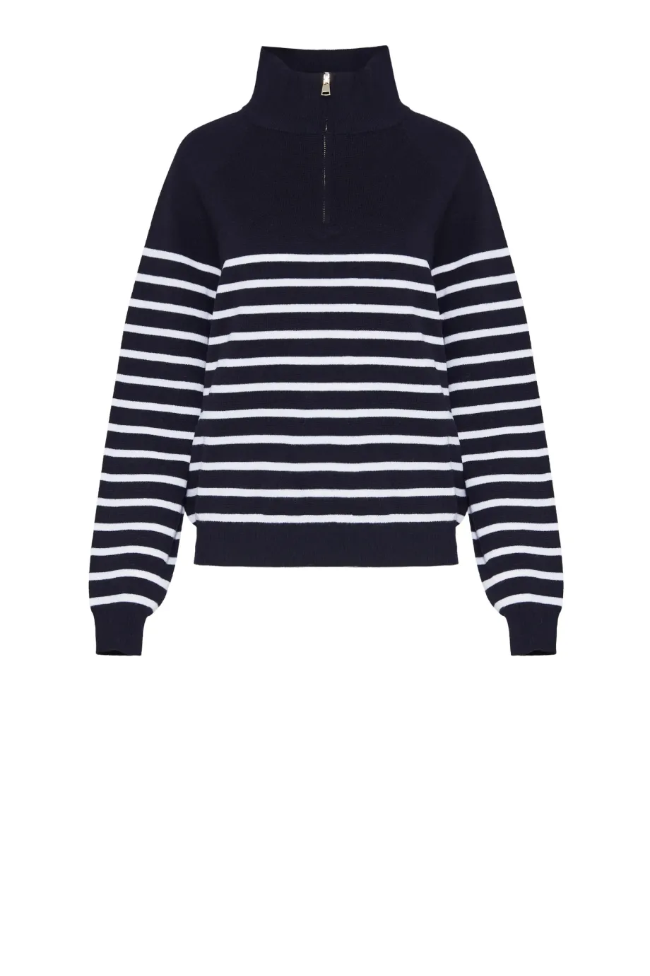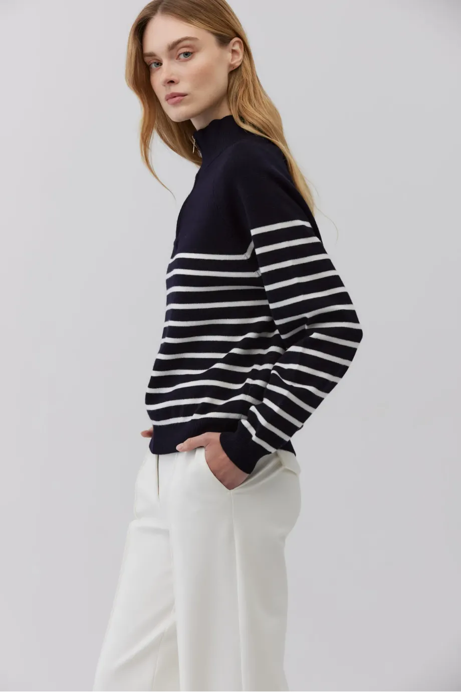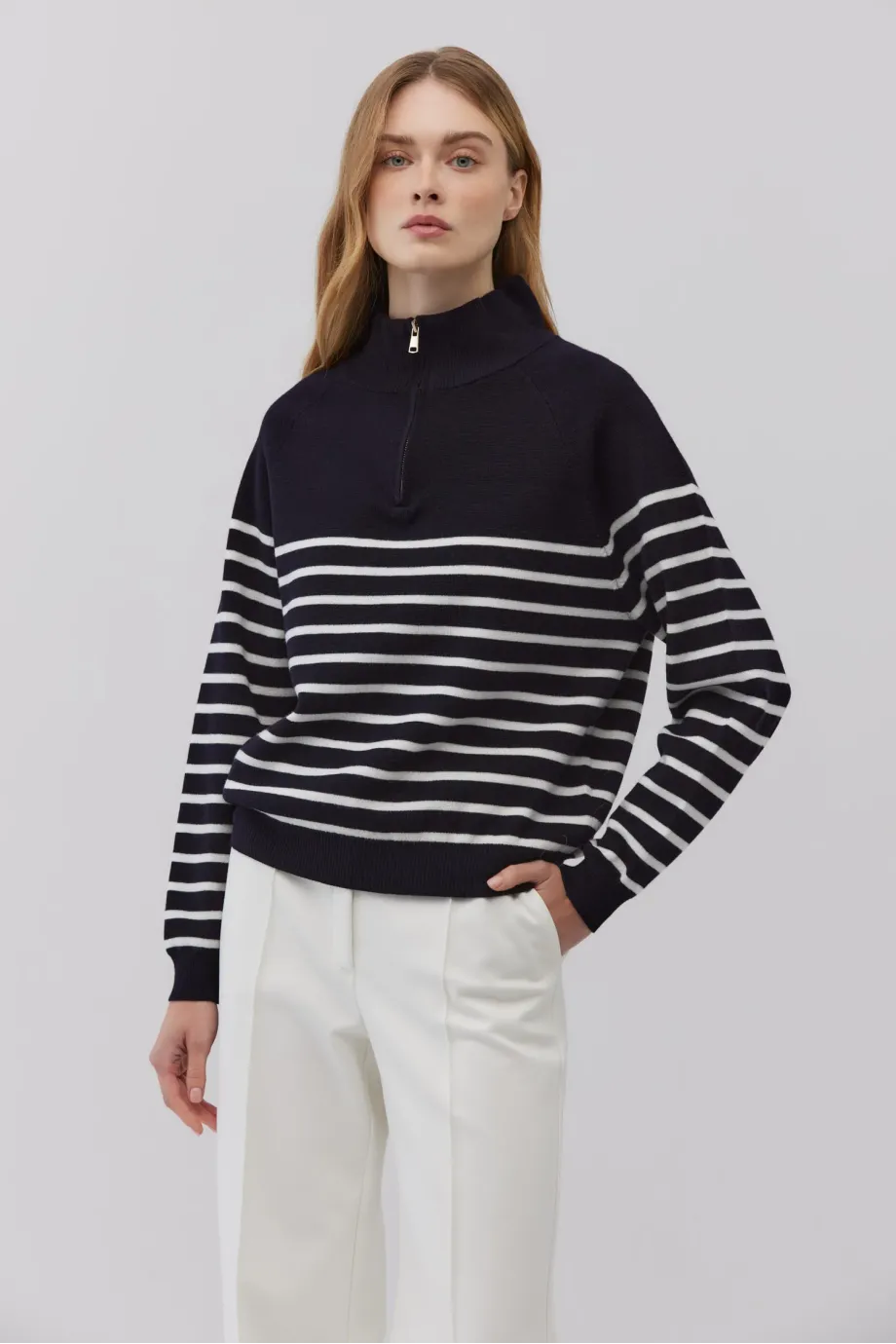 Granátovo-bílý svetr z merino vlny. Hlavní pletenina s tkaním tuck stitch. Volný střih s vysokým límcem a zipem pod krkem. Dlouhé rukávy zakončené pružným lemem.