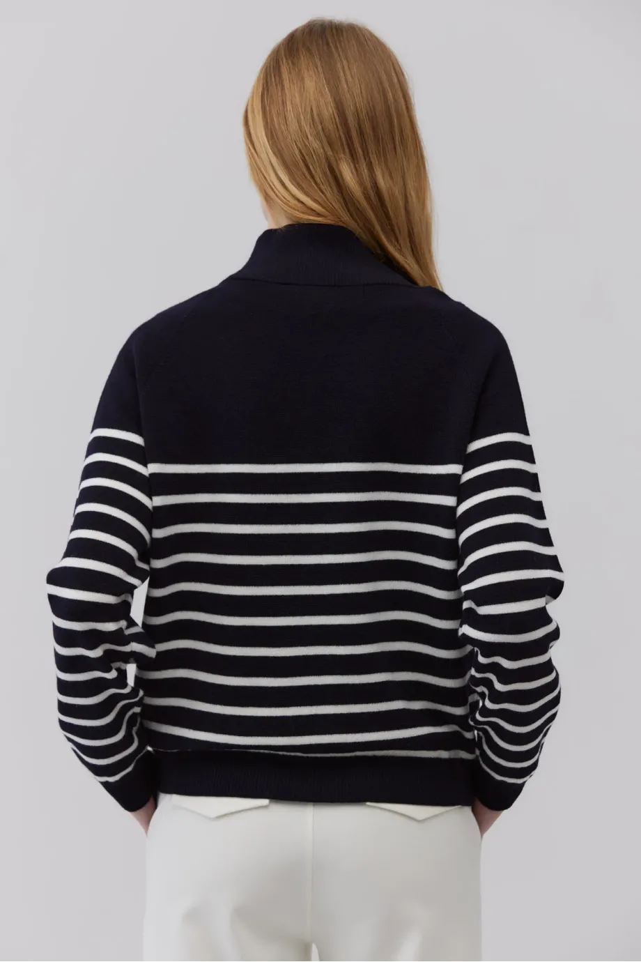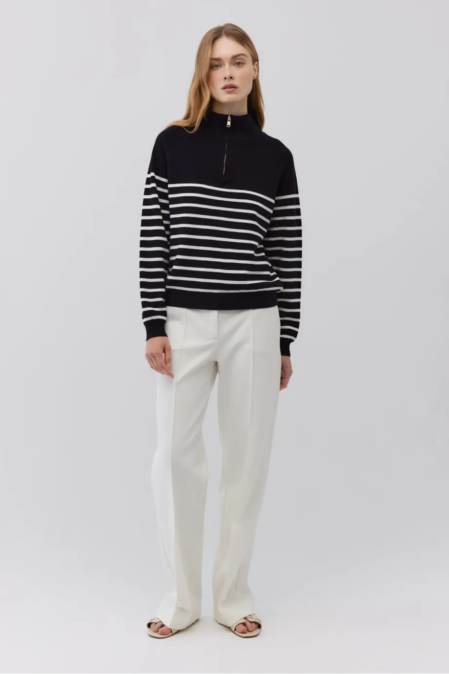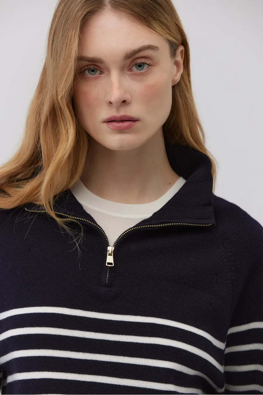 Granátovo-bílý svetr z merino vlny. Hlavní pletenina s tkaním tuck stitch. Volný střih s vysokým límcem a zipem pod krkem. Dlouhé rukávy zakončené pružným lemem.